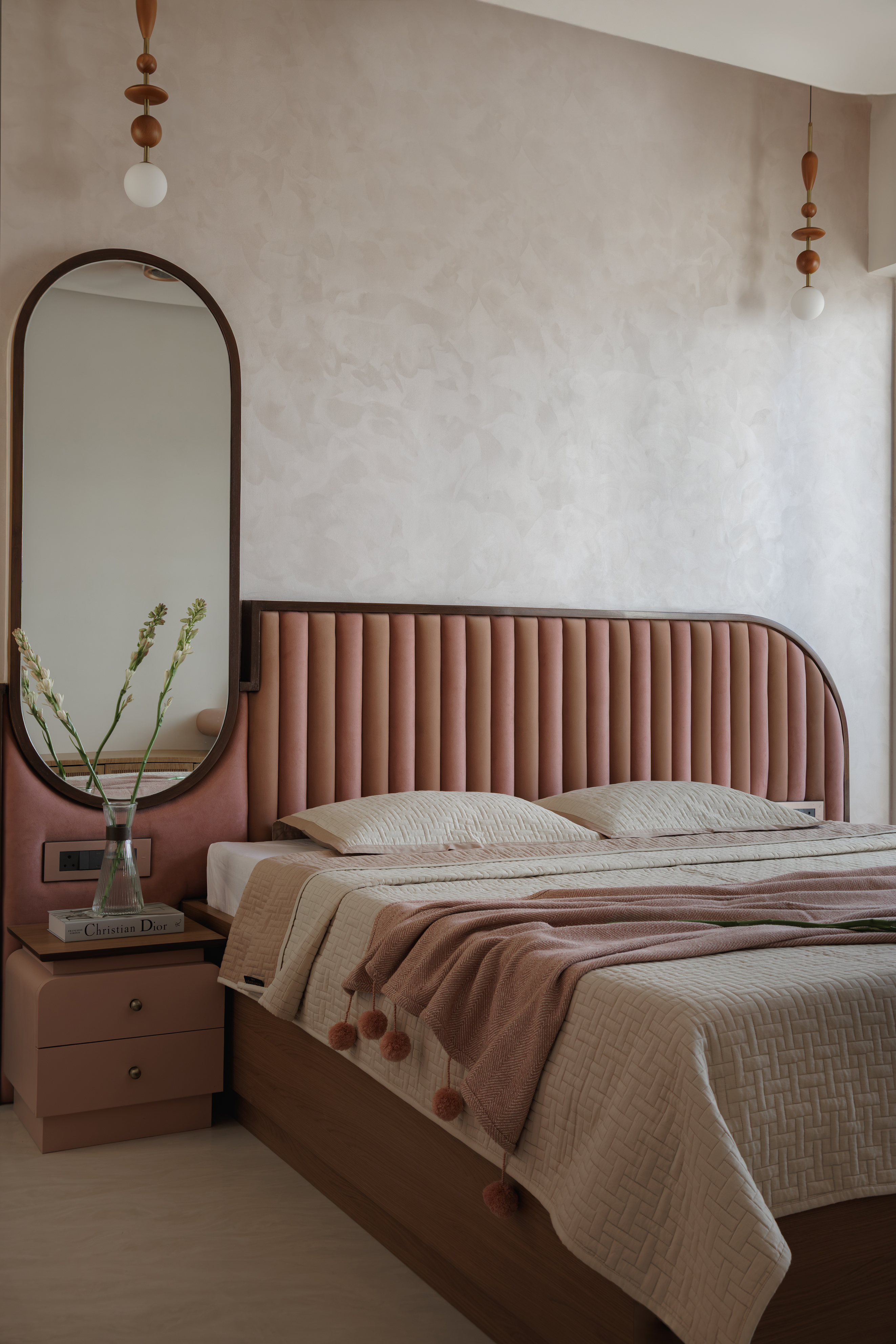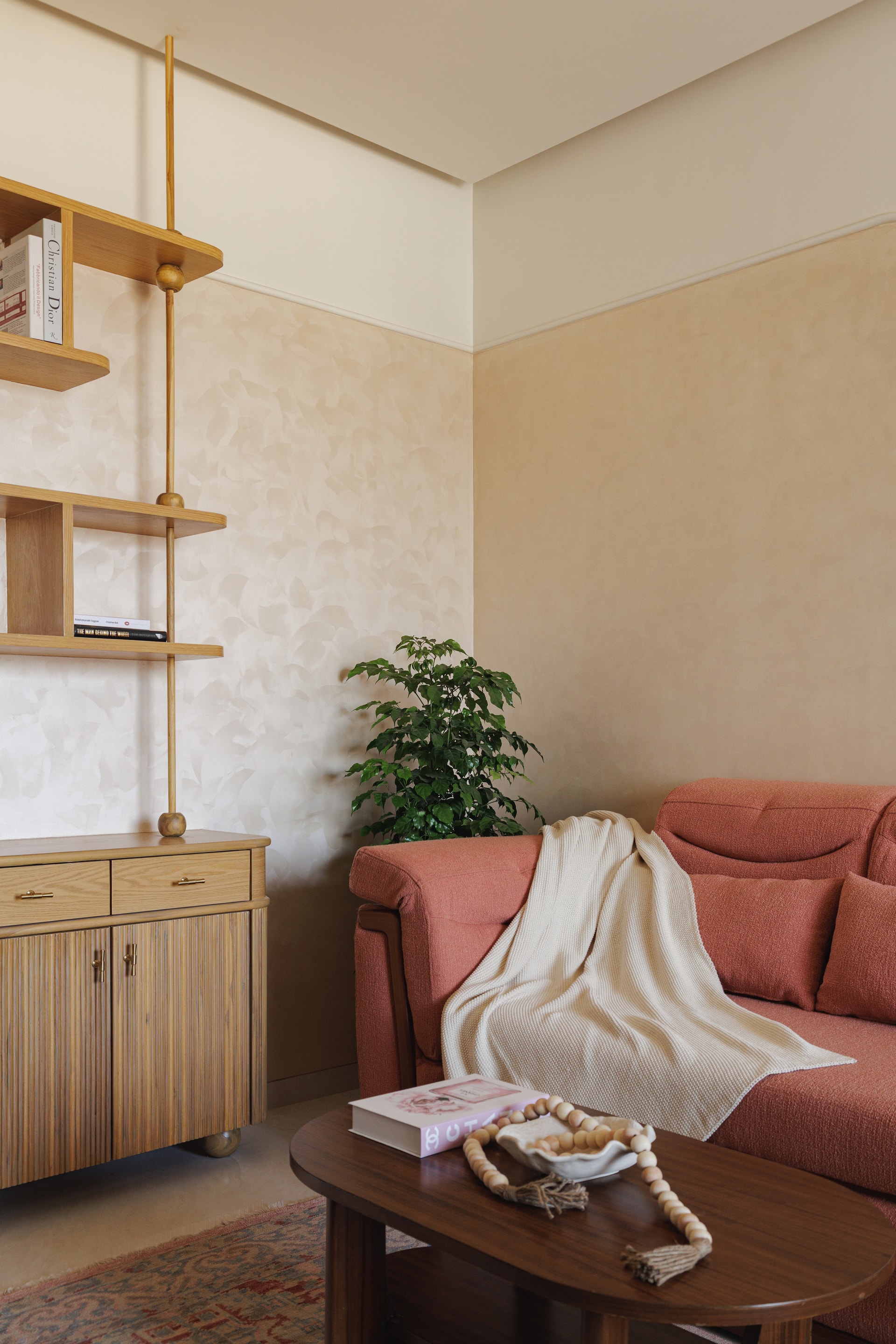 A soft, cohesive colour palette ties the apartment together. Creamy beiges, gentle blush pinks, and warm wood tones form the foundation, allowing handcrafted details and décor to shine. The palette is punctuated by lush indoor plants, ceramic artefacts, and fresh tuberoses, adding sensory richness and a lived-in warmth. Thoughtful interventions such as asymmetrical shelving units and a floating pink desk introduce moments of surprise while maintaining functionality, an essential consideration in a home of this scale.
