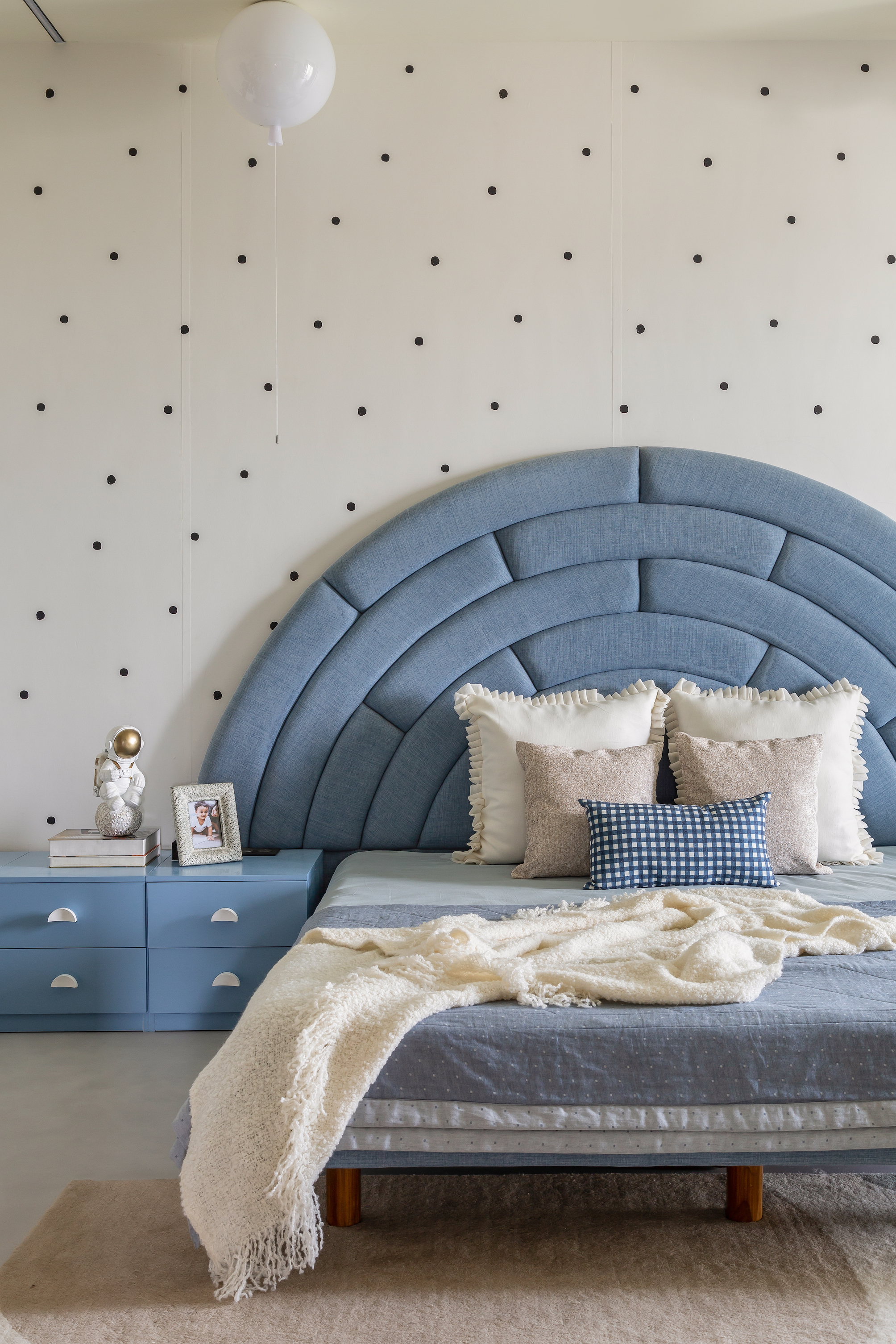 The kid’s room, in contrast, is an exuberant burst of personality. Designed with playful forms and a curated mix of materials and colours, it becomes a joyful world of its own—proof that minimalism, when done right, need not forgo warmth or whimsy.