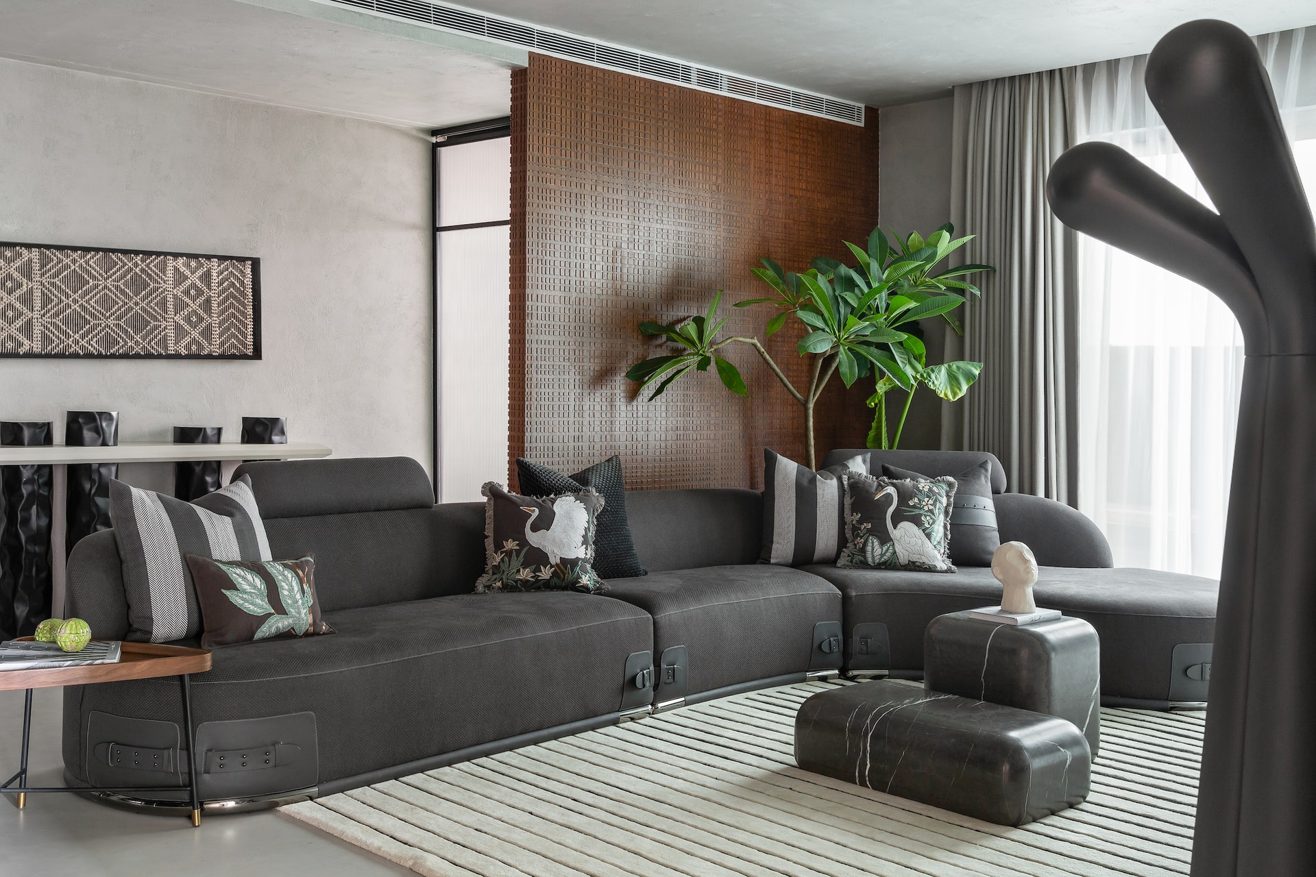 In the living room, VAL Atelier introduces moments of playful contrast. While the shell remains neutral, vibrant upholstered pieces and curated art break the tonal silence—like brushstrokes of colour on a grey canvas. These pops of colour breathe life into the room, creating a dynamic interplay between structure and spirit.