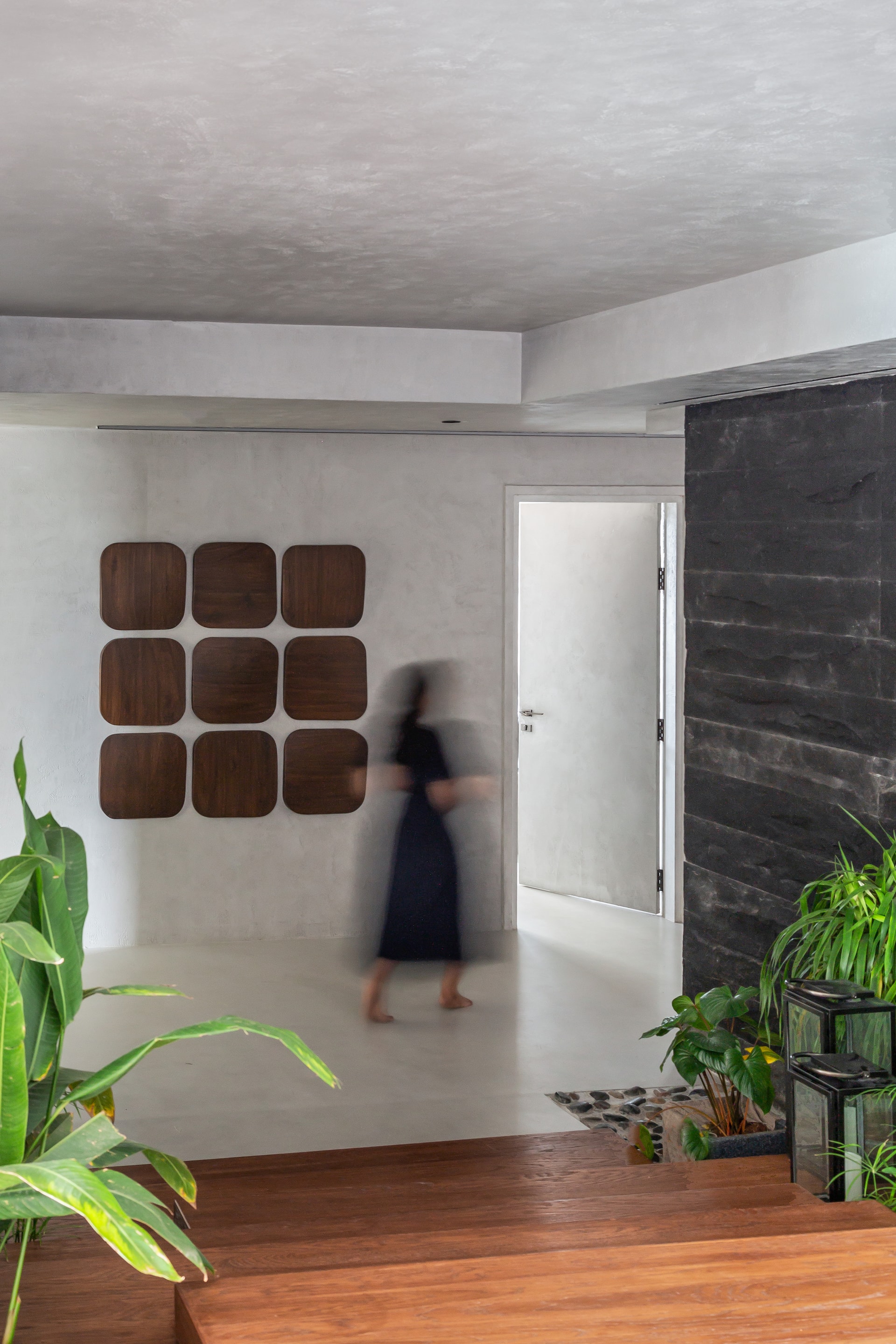 The foyer immediately sets the tone: a clean, monolithic bench—crafted in microtopping—appears to emerge from the wall, blurring boundaries between furniture and architecture. A small, contemplative seating corner with darker tones mirrors the hues of the cladded walls, creating a monochromatic stillness that encourages one to pause and breathe.