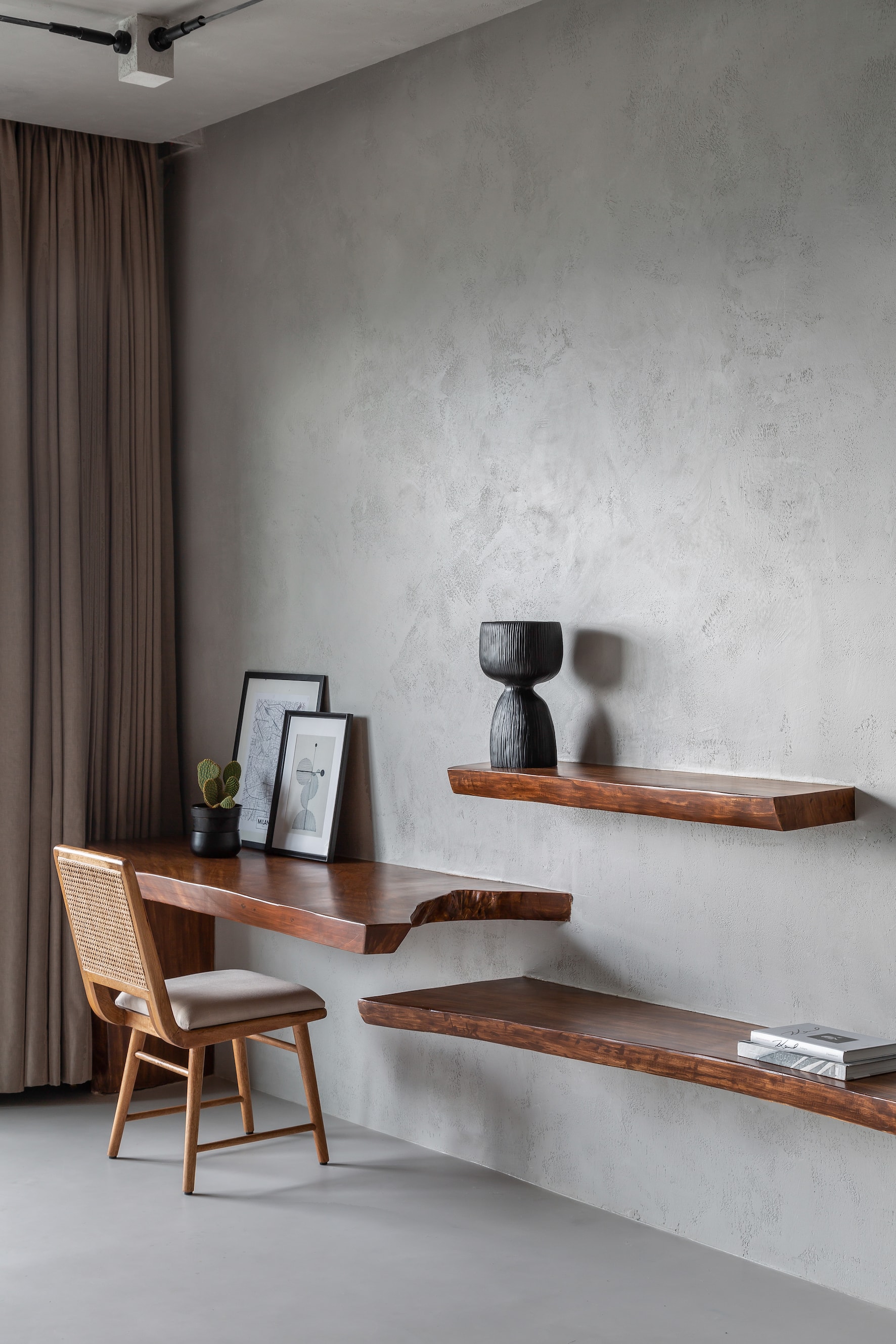 To offset this neutrality, VAL Atelier introduced a warm interplay of wood and stone, lending the home a raw, earthy elegance. The wood used throughout the home is especially personal—sourced from a single tree and transformed into various furniture pieces and accents. This creates an undercurrent of harmony that runs through the space, grounding the minimalism with a deep, almost spiritual connection to nature.