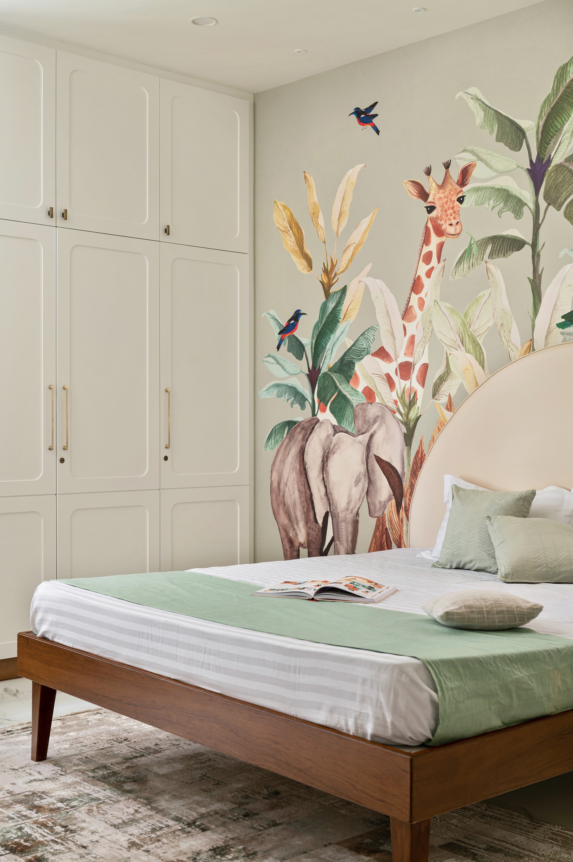 Step into the Other Bedroom, where a neutral palette of pristine white and warm wood tones sets the stage for a serene and inviting ambiance. Elegantly interspersed amidst this canvas are touches of exquisite cream and beautiful pops of refreshing green, infusing the space with a gentle luminosity that uplifts the entire room. The headboard wall becomes a captivating focal point with its whimsical yet tasteful wallpaper, adorned with animal and tropical motifs. This vibrant wallpaper injects a lively energy into the space, transforming it into a dynamic haven of comfort and style.