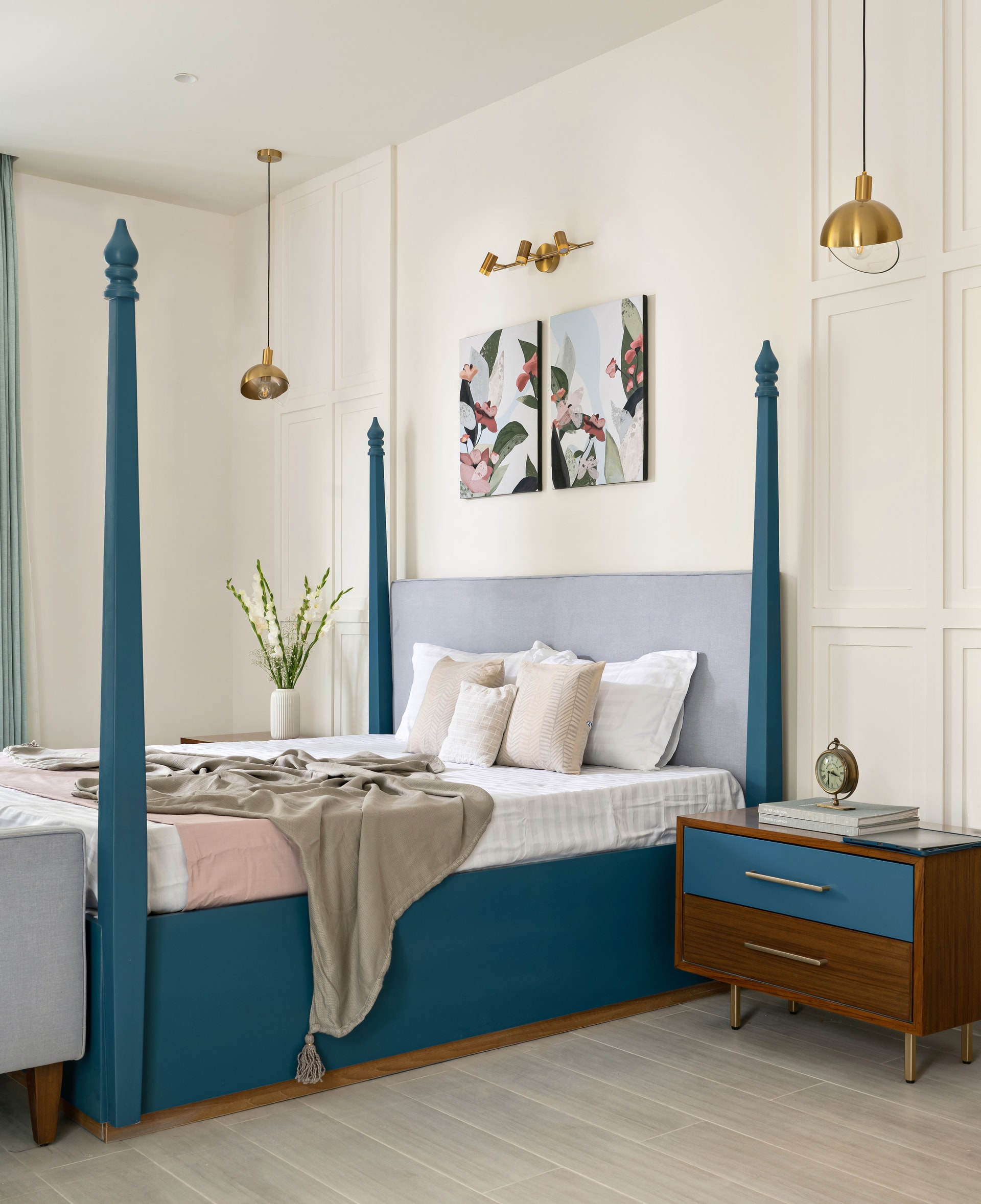 The third bedroom is a haven of tranquility and style. A stunning four-poster bed takes center stage, its elegant blue hue commanding attention and setting the tone for the space. Against this backdrop, a carefully curated color palette unfolds, featuring a delicate interplay of cream and soothing wooden shades, punctuated by occasional pops of the same calming blue. The seating area introduces a subtle touch of grey, seamlessly blending comfort with sophistication. Every detail has been thoughtfully considered, from the accessories adorned with delicate gold accents to the handles that exude a subtle sense of luxury. This room encapsulates a perfect fusion of design elements, where colors, textures, and furnishings come together to create an oasis of elegance, making it a retreat that harmoniously combines relaxation and aesthetics.