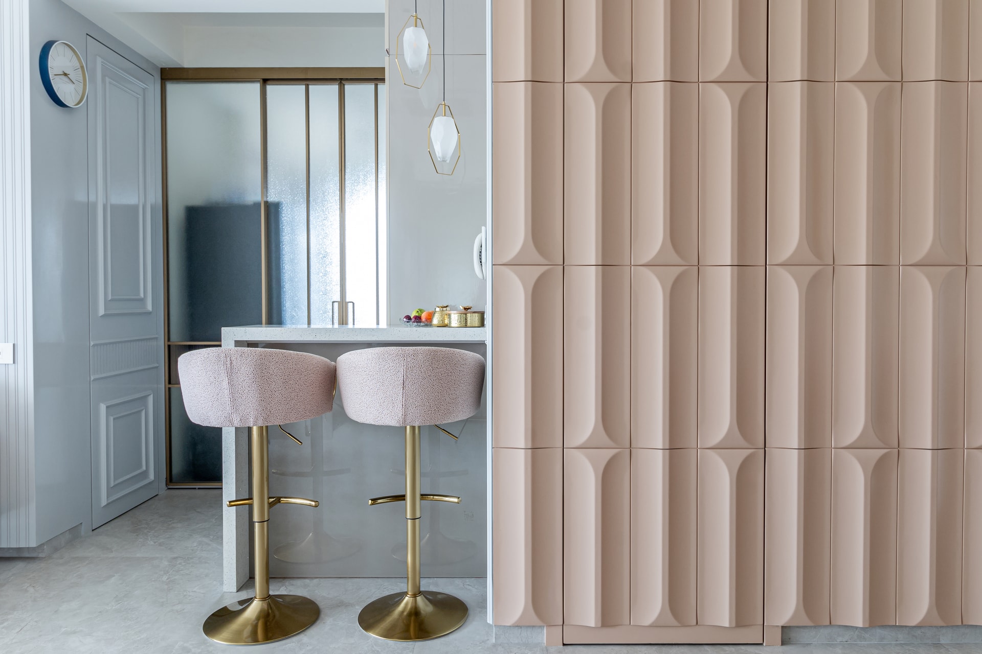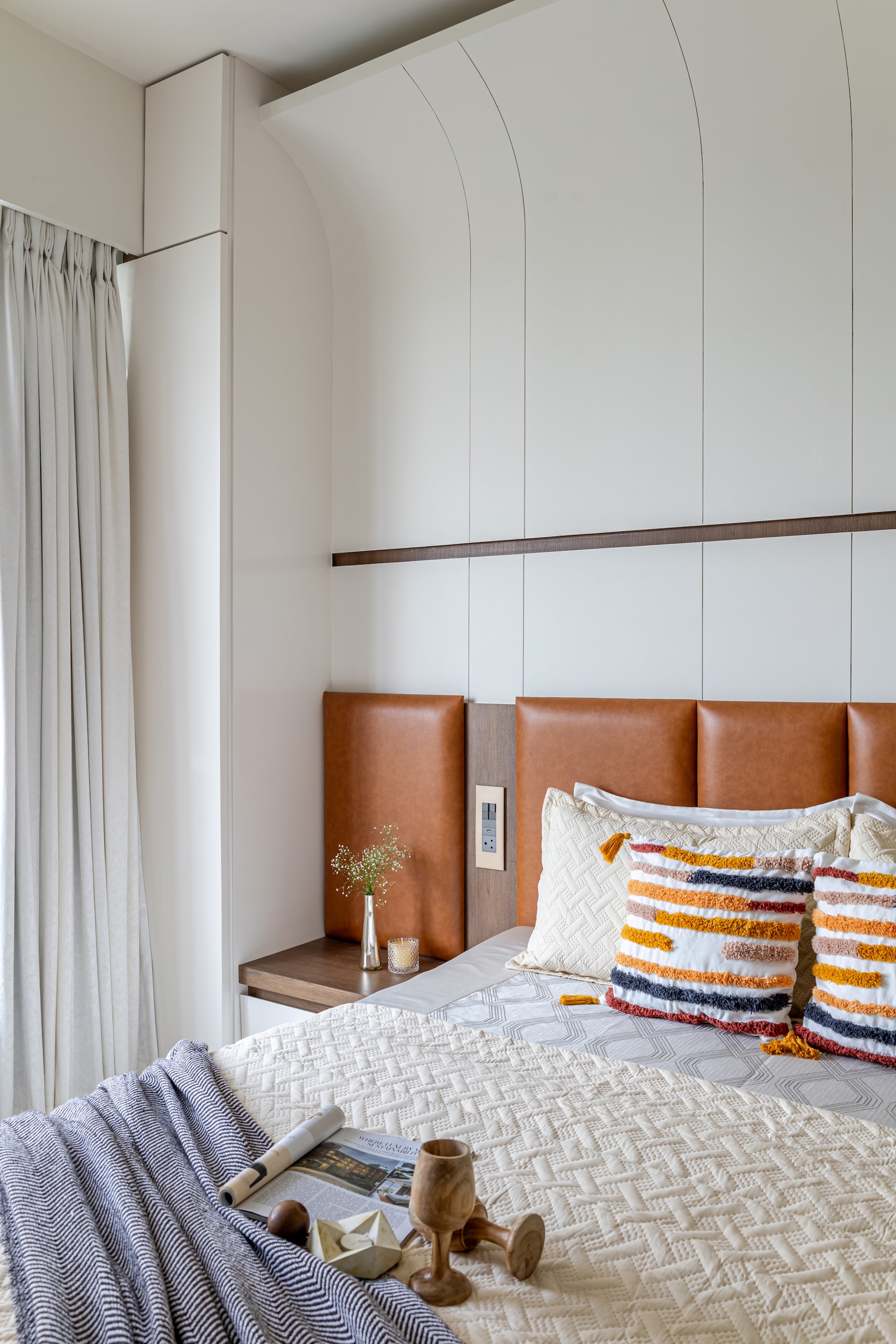 In contrast, the Parents’ Room embraces a Wabi-Sabi theme, featuring a serene white and wooden aesthetic. The space is elegantly grounded by its monochrome colour scheme, where soft white walls and natural wooden accents create a harmonious and balanced atmosphere. The wooden elements, including the intricate bed back paneling and concealed handles on the cabinetry, contribute to the room’s understated elegance. The bed’s curved back panel, with its gentle contours, adds a touch of grace and fluidity, enhancing the room’s overall tranquil vibe.