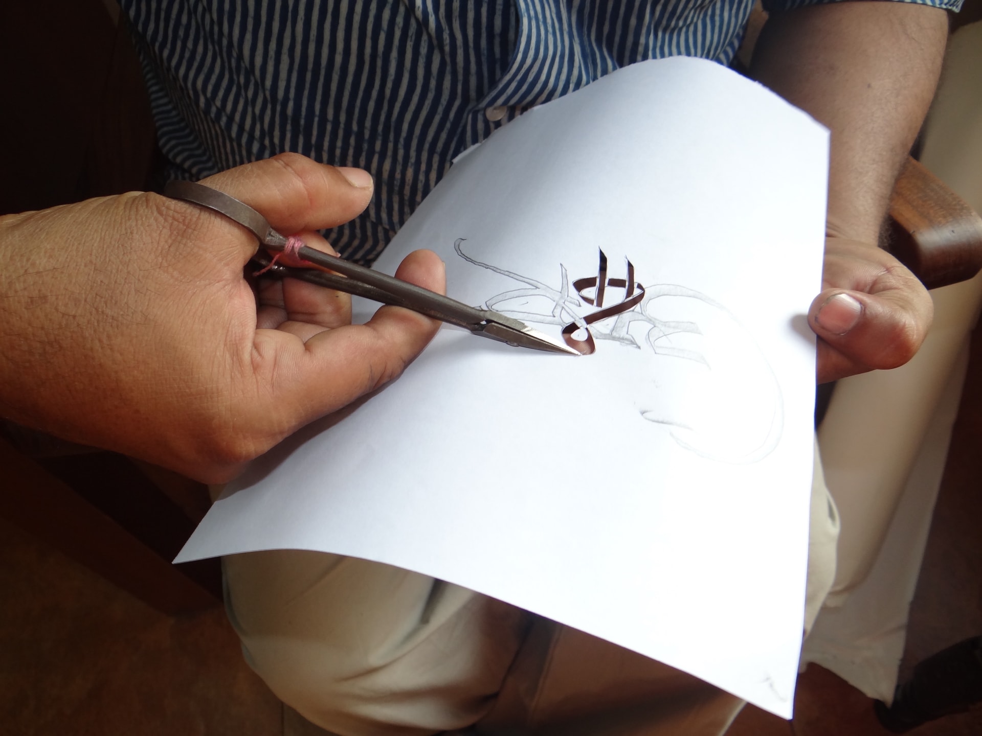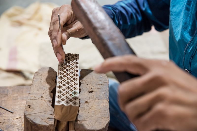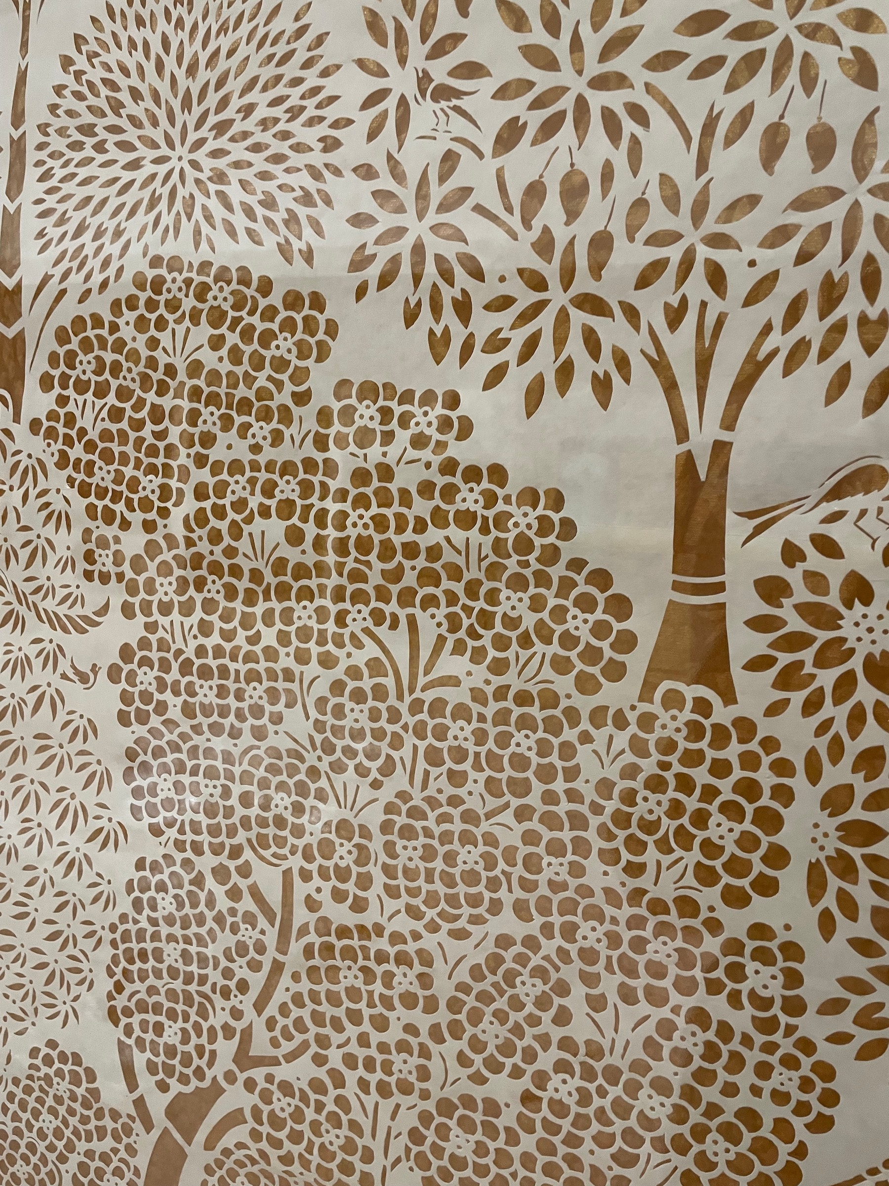 The installation of Prakriti is rooted in the focal idea that we are an integral part of nature. It is She who sustains and nurtures us. Since Sanjhi celebrates nature, with motifs of trees, birds and animals, it was a natural choice for this artwork. The Swavlamban installation is a triptych titled ‘Charkha — the Wheels of Swavlambam’. Created on 100gm of hand-spun, handwoven khadi, they feature different charkhas, printed in traditional Ajrakh style, and embellished with tiny mirrors and zari work. The charkha, or spinning wheel symbolises unity, freedom and self-sufficiency, reminding us of the Swadeshi Movement during India’s freedom struggle.