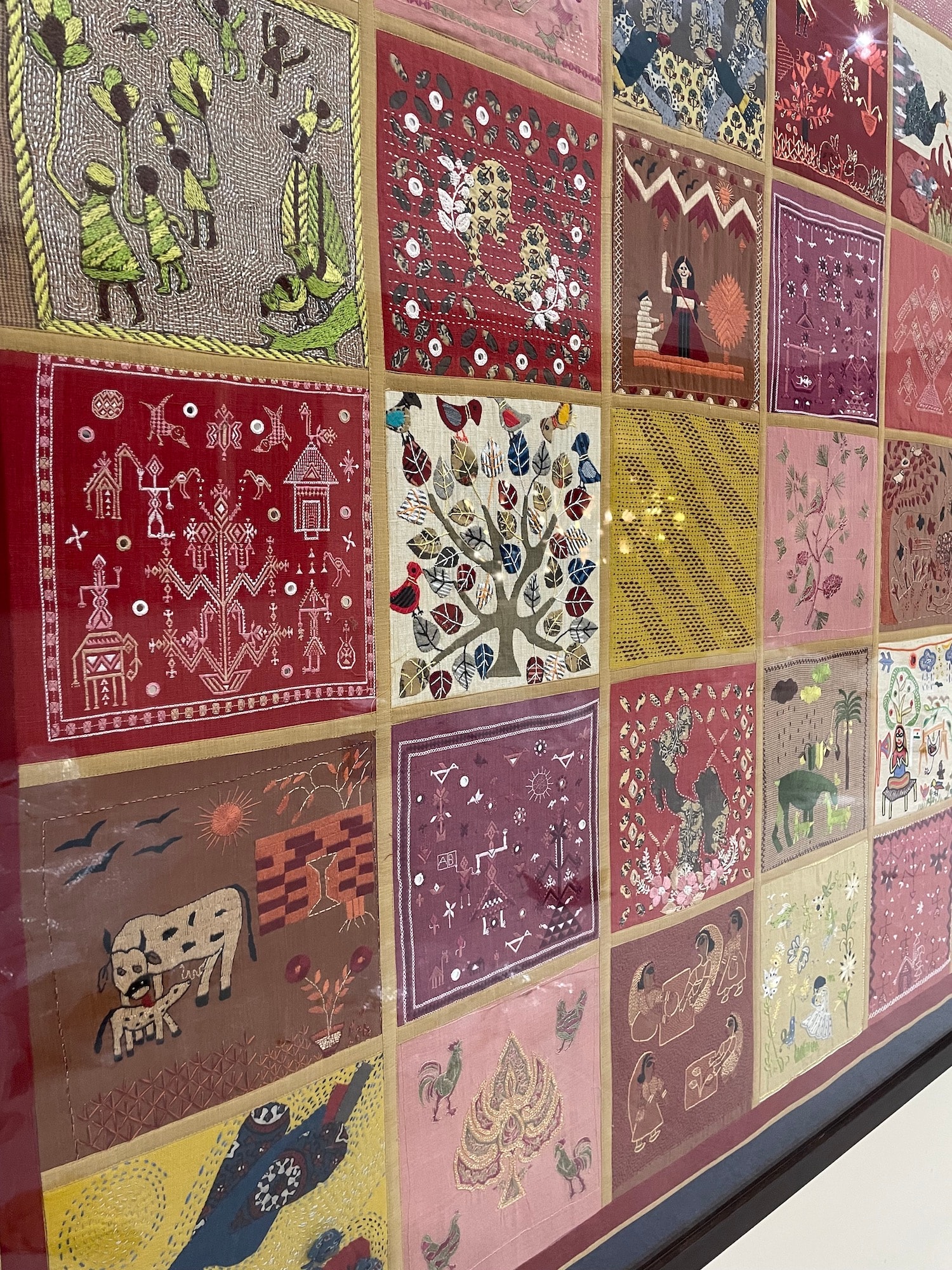 Each element in each artwork also runs an organic thread of diversity, hope and pride. The installation of embroidered quilts in the Ullas installation follows the universal tradition of quilt-making, which is a wise and sustainable way of recycling old saris, headcloths or leftover fabric from tailor shops. The artisans who created the patchwork of pieces for the blue- and red-toned quilts were given minimal instructions. As ‘Ullas’ or joyfulness is the overarching theme for the embroidered quilts, each woman was asked to express her happiness. The bird was also suggested as an occasional motif, a symbol of happiness. Apart from that, she had the total freedom to evoke on fabric the intense happiness, the boundless love she feels for her child in her heart, using her own imagination.
