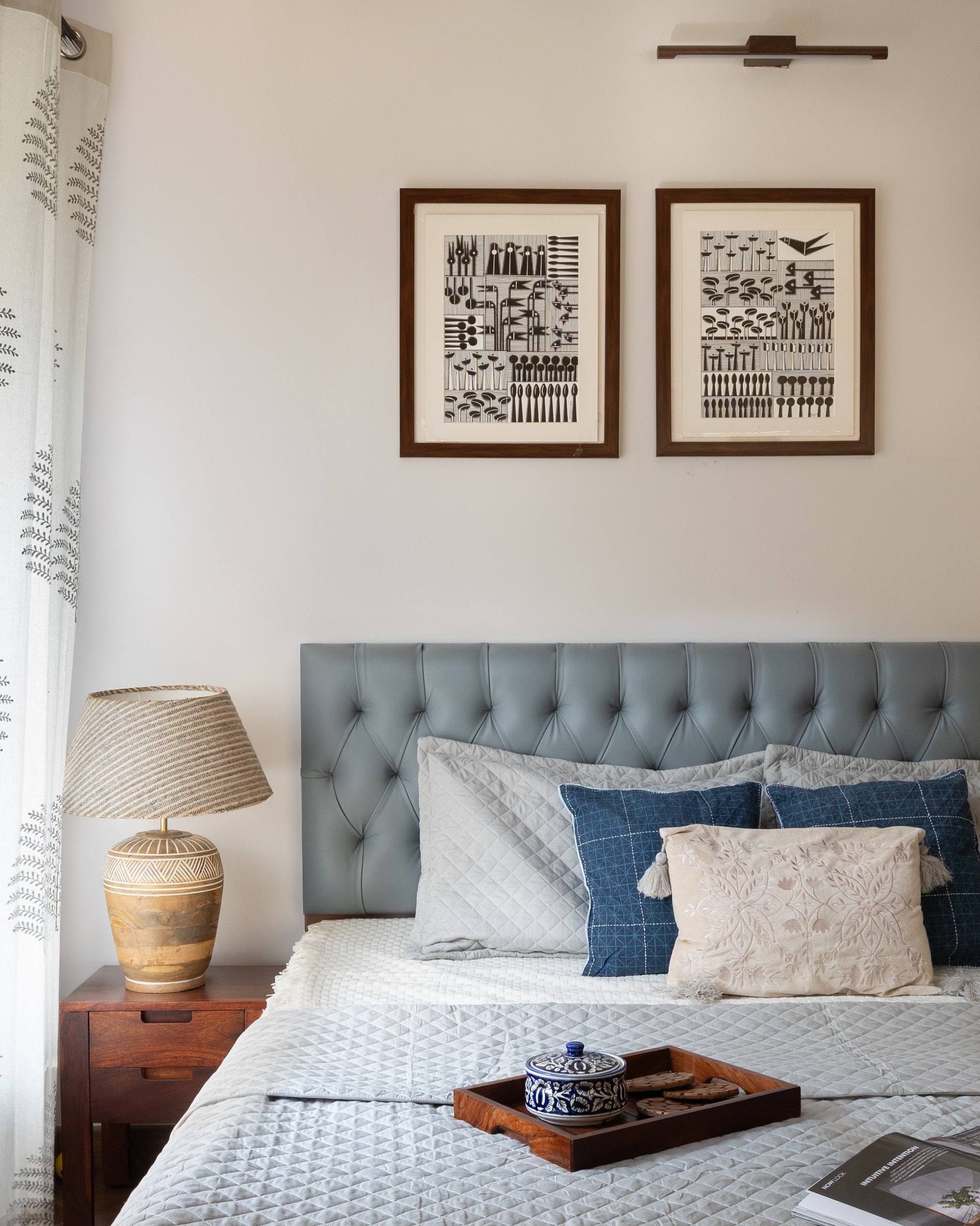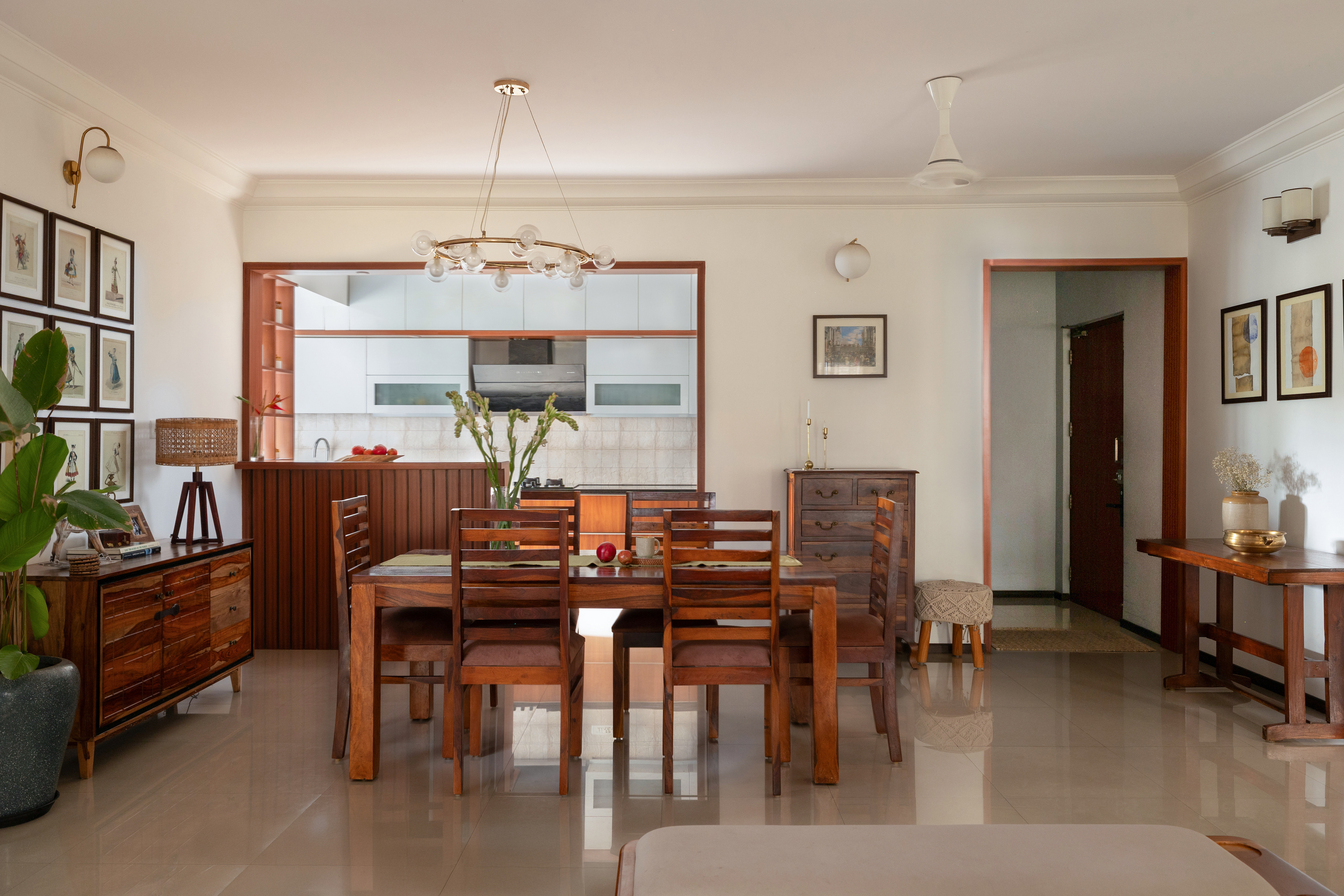 Moving into the dining zone, the dialogue between tradition and contemporary living becomes more pronounced. Minimal wooden furniture is paired with a modern light fixture that defines the space without dominating it, allowing the dining area to function as both a social anchor and a visual pause within the home. This language flows seamlessly into the kitchen, where tonal continuity, efficient planning, and streamlined cabinetry reflect Studio Aelux’s commitment to functional clarity. A distinctive partition featuring pickle jars of varying sizes introduces a tactile, cultural layer, serving as both a spatial divider and a moment of quiet storytelling that connects everyday rituals with design expression.