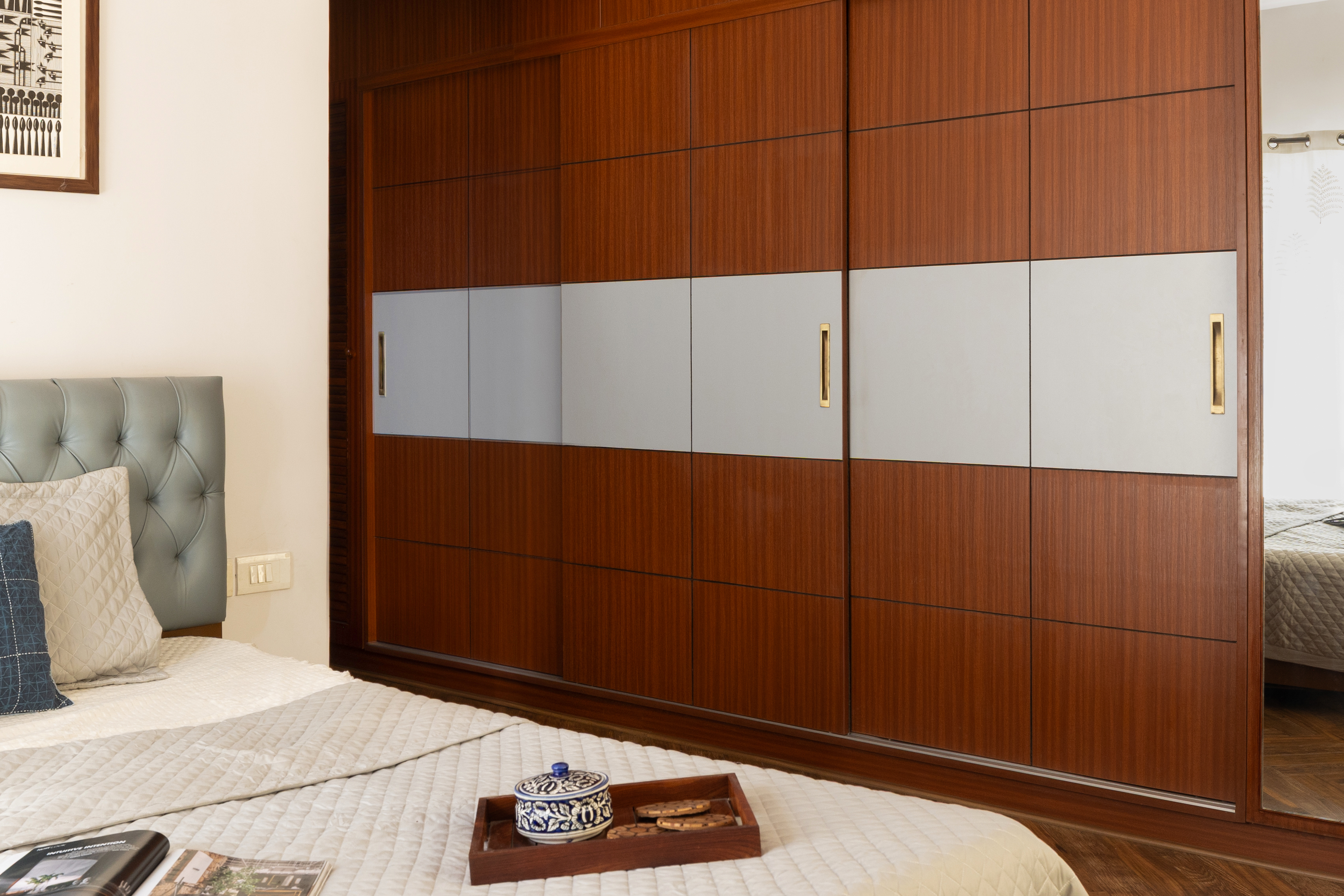 The private quarters are designed as intimate retreats, guided by softness, balance, and understated luxury. In the master bedroom, layered greys and warm lighting create an environment that encourages rest and repose, while wooden veneer wardrobes detailed with subtle grey accents maintain visual harmony. Storage is integrated seamlessly into the architecture, reinforcing the minimalist ethos without compromising practicality. A thoughtfully curated study corner within the bedroom offers a focused workspace, framed by clean geometry and material warmth, an extension of the home’s larger design philosophy where function and atmosphere are treated as inseparable.