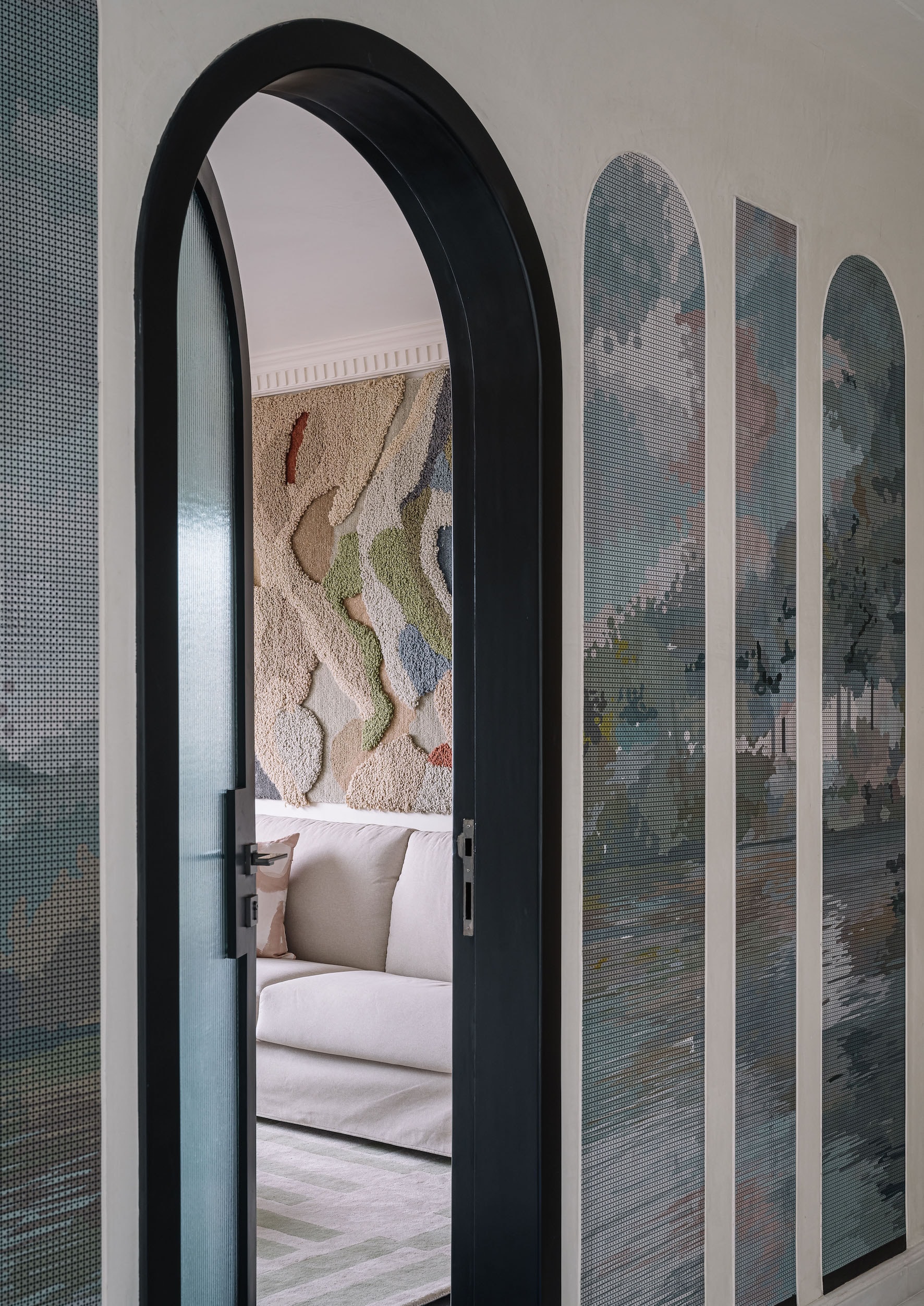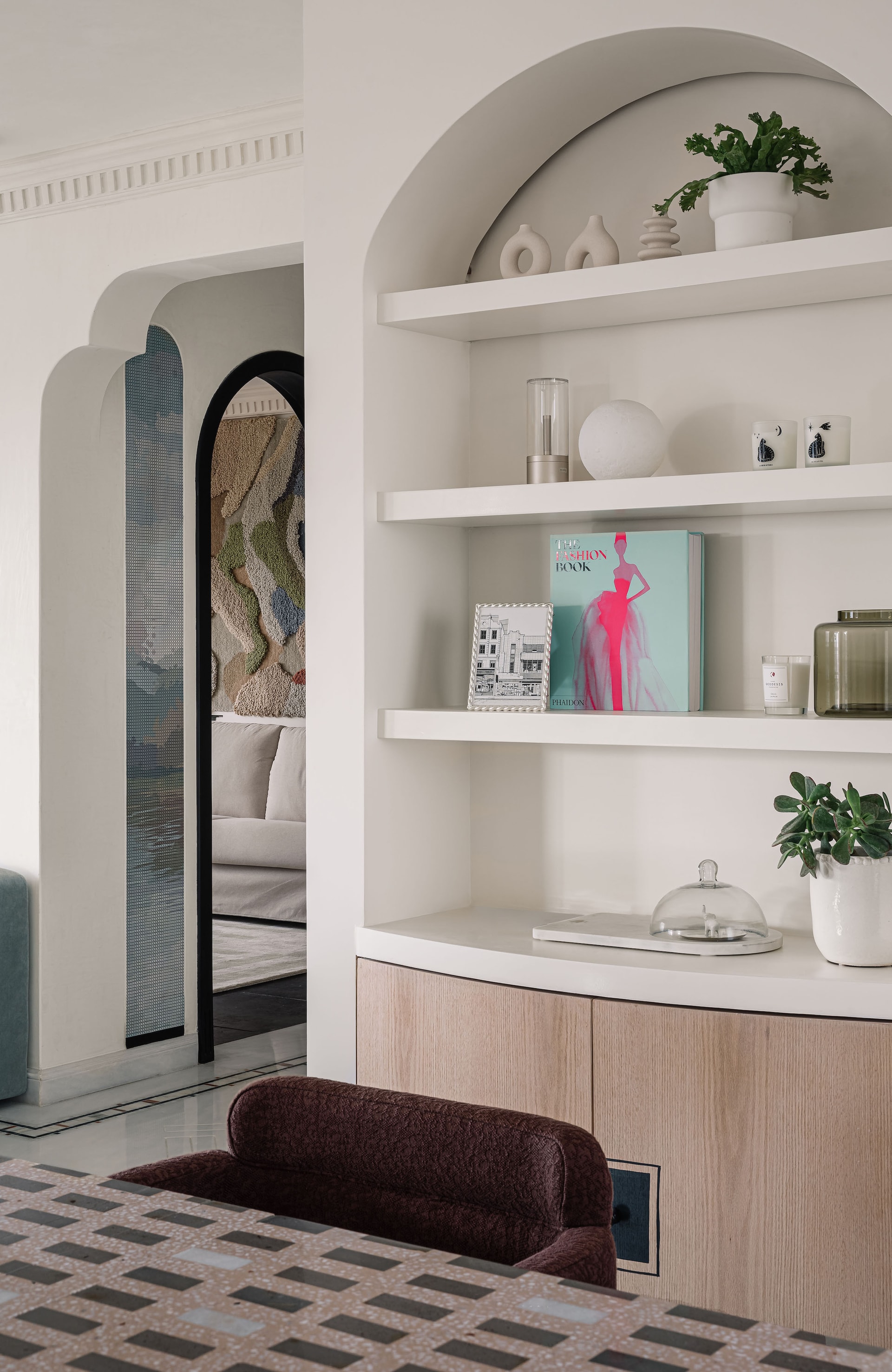 At the heart of the penthouse, the dining area unifies the layout, fostering moments of gathering and celebration. A custom terrazzo-in-situ dining table by Rawsteen, with its organically shaped multitone surface, echoes the home’s fluid design philosophy. Above, an LZF pendant light, inspired by unfurling ferns, reinforces the nature-infused narrative. A series of arches house curated objets d’art while discreetly concealing storage, with one archway leading into a dusty teal modular kitchen—both stylish and functional.
