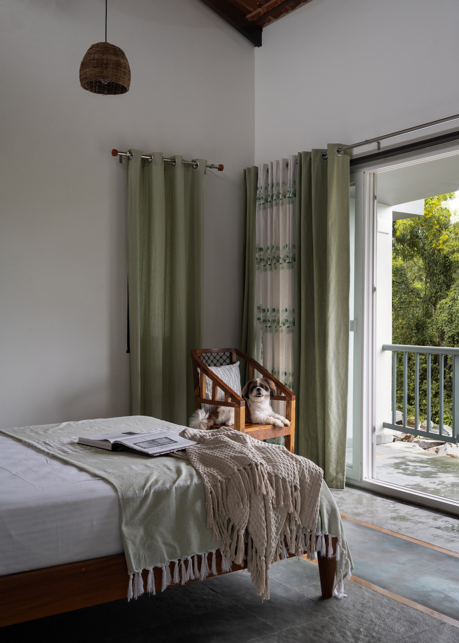 A well-lit corridor, lined with a bay window and illuminated by circular skylights, leads to two bedrooms. Each room is a sanctuary of tranquility, featuring asymmetrical sloped roofs, clerestory windows, and deep balconies that frame the surrounding landscape. The master bedroom, positioned at the end of the building, boasts a corner balcony with panoramic views of the ocean and lush greenery, offering an unmatched sense of peace and seclusion. The bathrooms, with frosted glass walls and scenic step-out areas, continue the theme of blending utility with aesthetic grace.
