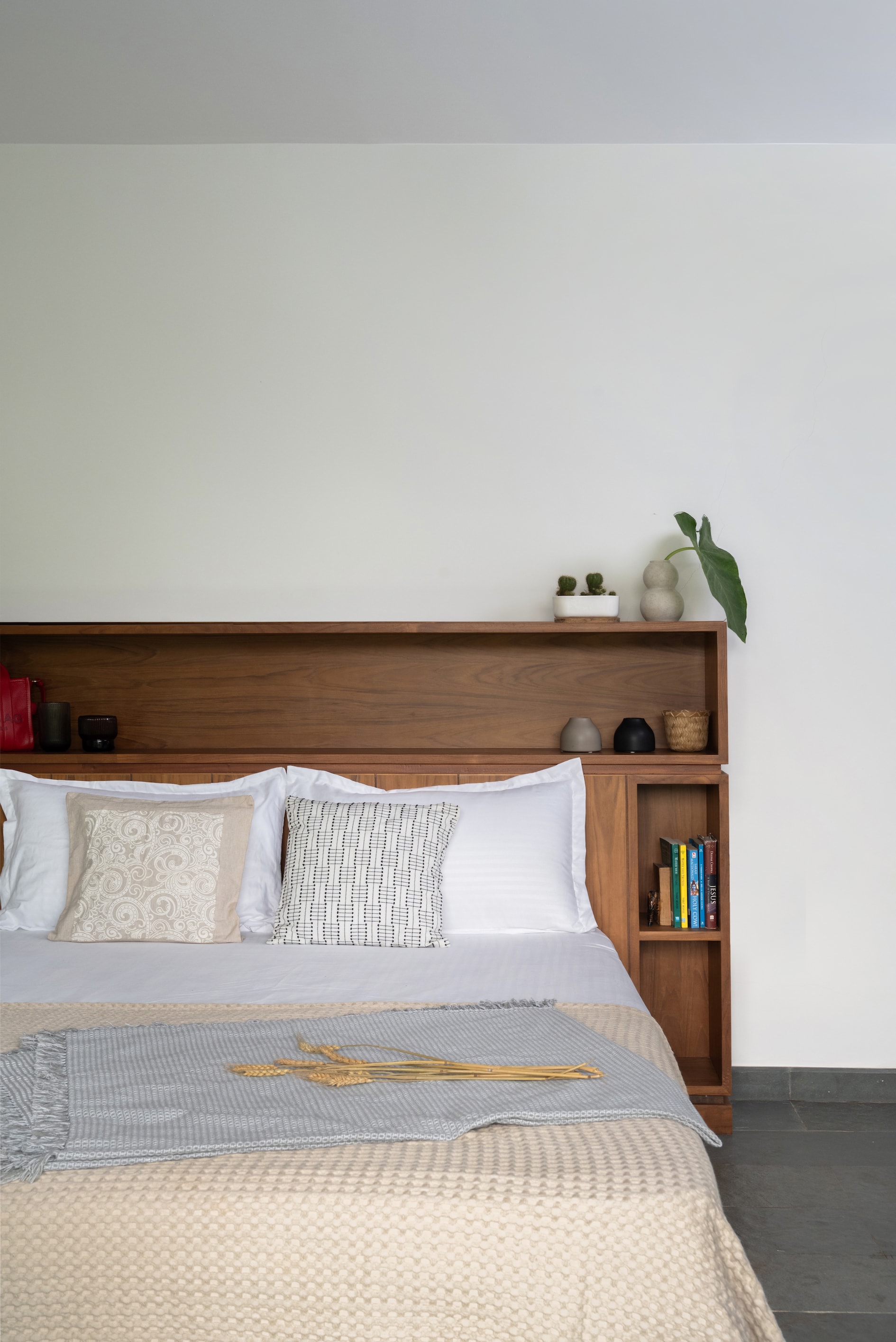 The material palette is a masterclass in subtle sophistication. Exposed concrete plaster on the ground floor is accented by crimson highlights, while leather-finish Kota and Jaisalmer stone flooring bring rich textures to life. Playful patterns in the flooring mark key transitions and level changes, adding a layer of visual intrigue. Polished teak wood doors, adorned with vertical beadings and grooves, enhance the sense of height and elegance, while jet-black granite window jambs frame each view as a living painting, inviting nature into the home.