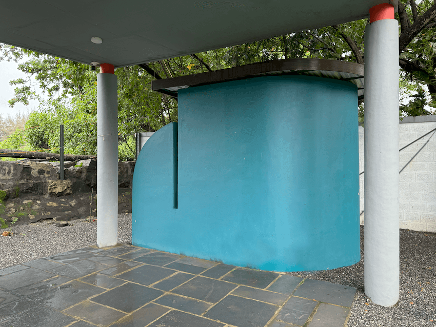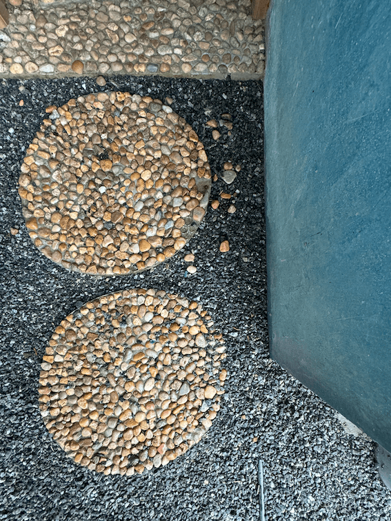 The ground floor sets the tone with its sleek, flat roof supported by circular columns adorned with narrow nibs, creating a floating aesthetic. This clever design not only adds to the home’s modern character but also allows for a private study and a sprawling garden, perfect for quiet reflection or lively gatherings. A standout feature here is the open-to-sky washroom, inspired by a seashell, where blue oxide walls and a pebble-inlaid floor evoke the essence of the ocean. This thoughtful addition provides a seamless transition from the sandy beach to the comfort of home.