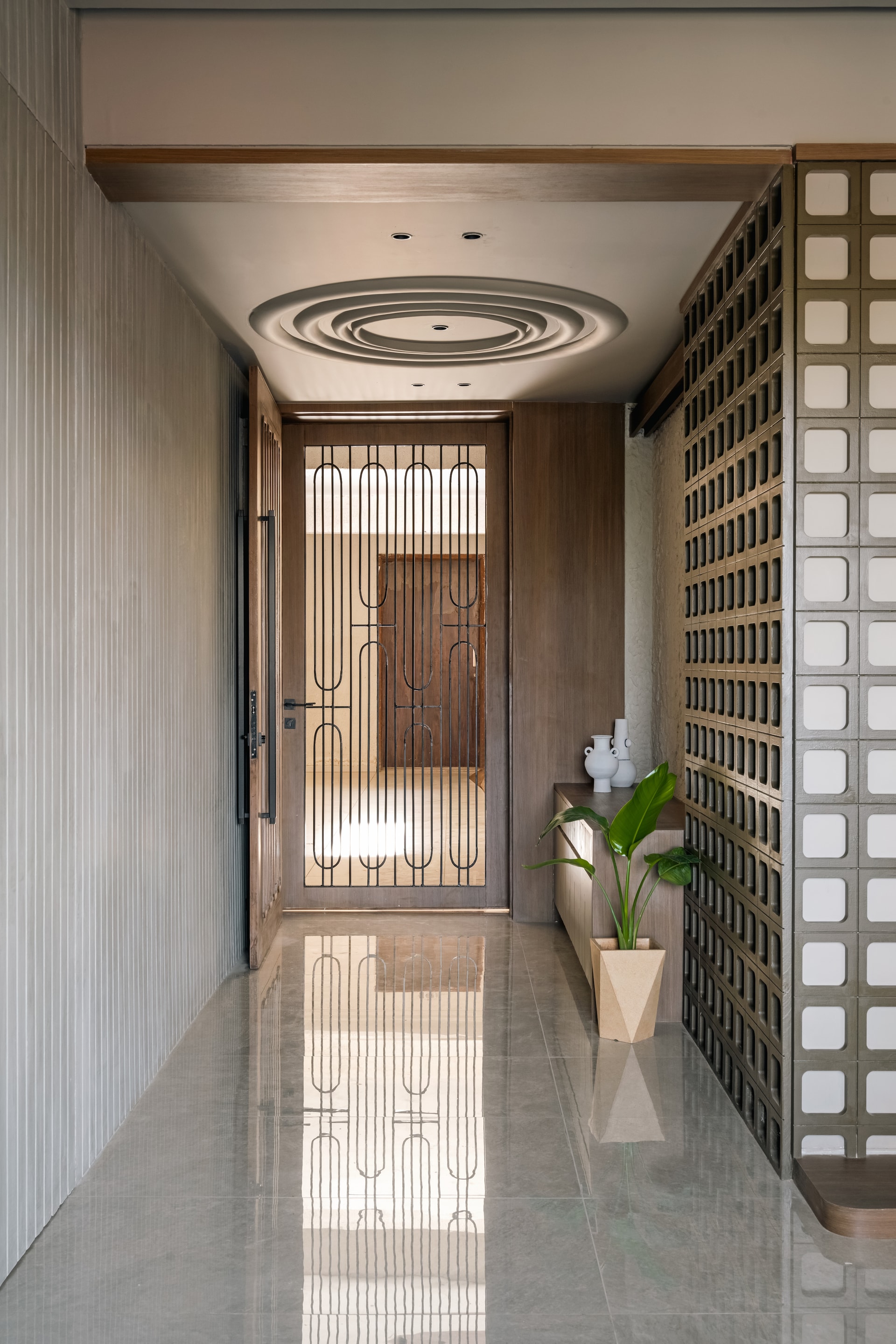 One of the home’s most compelling features is its puja and multipurpose room, a sanctuary designed with intention. Bathed in soft ambient light and adorned with wooden paneling and natural textures, it offers a space for prayer, meditation, yoga, or focused work. The design balances spiritual depth with functional adaptability, embodying the project’s ethos of holistic living.