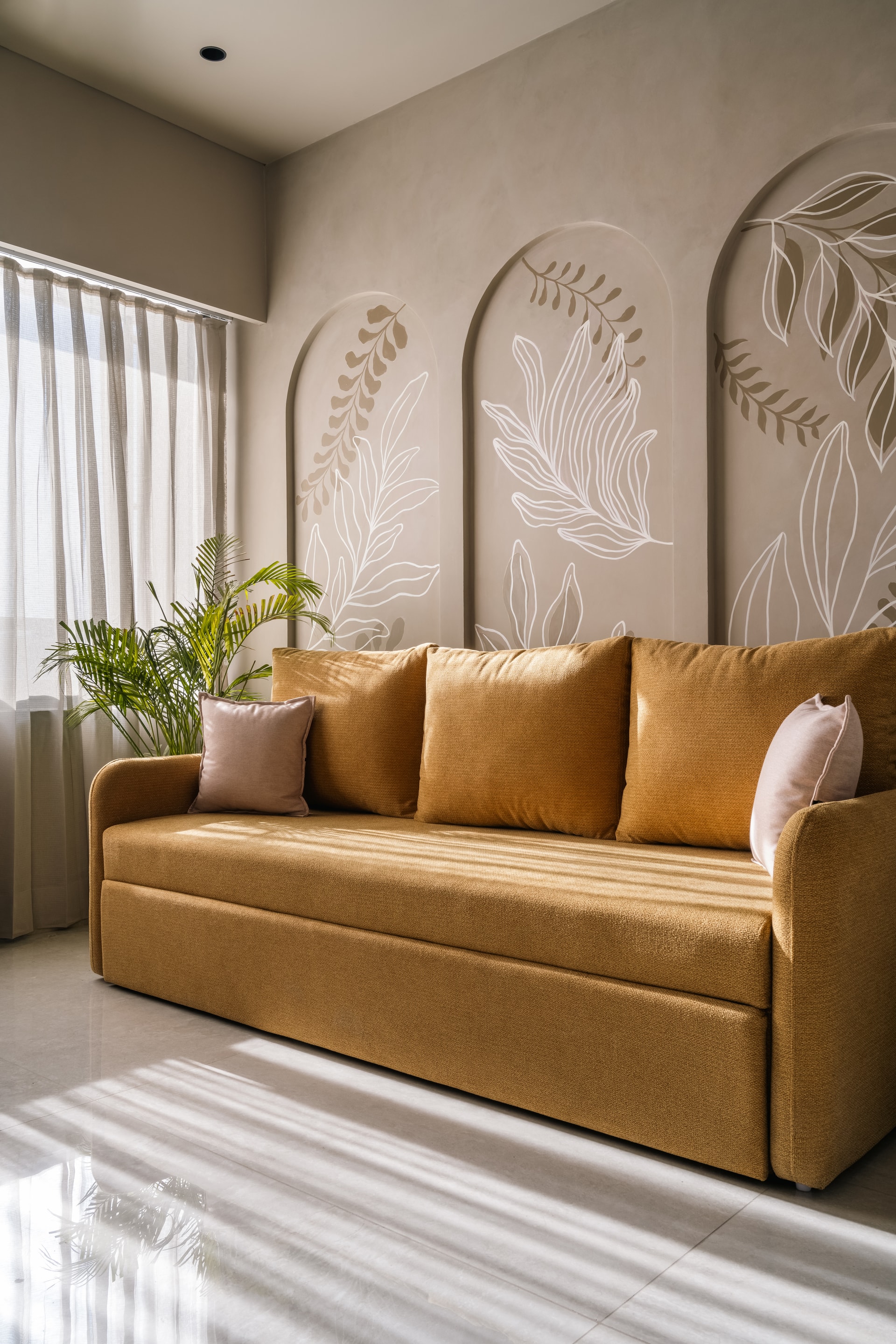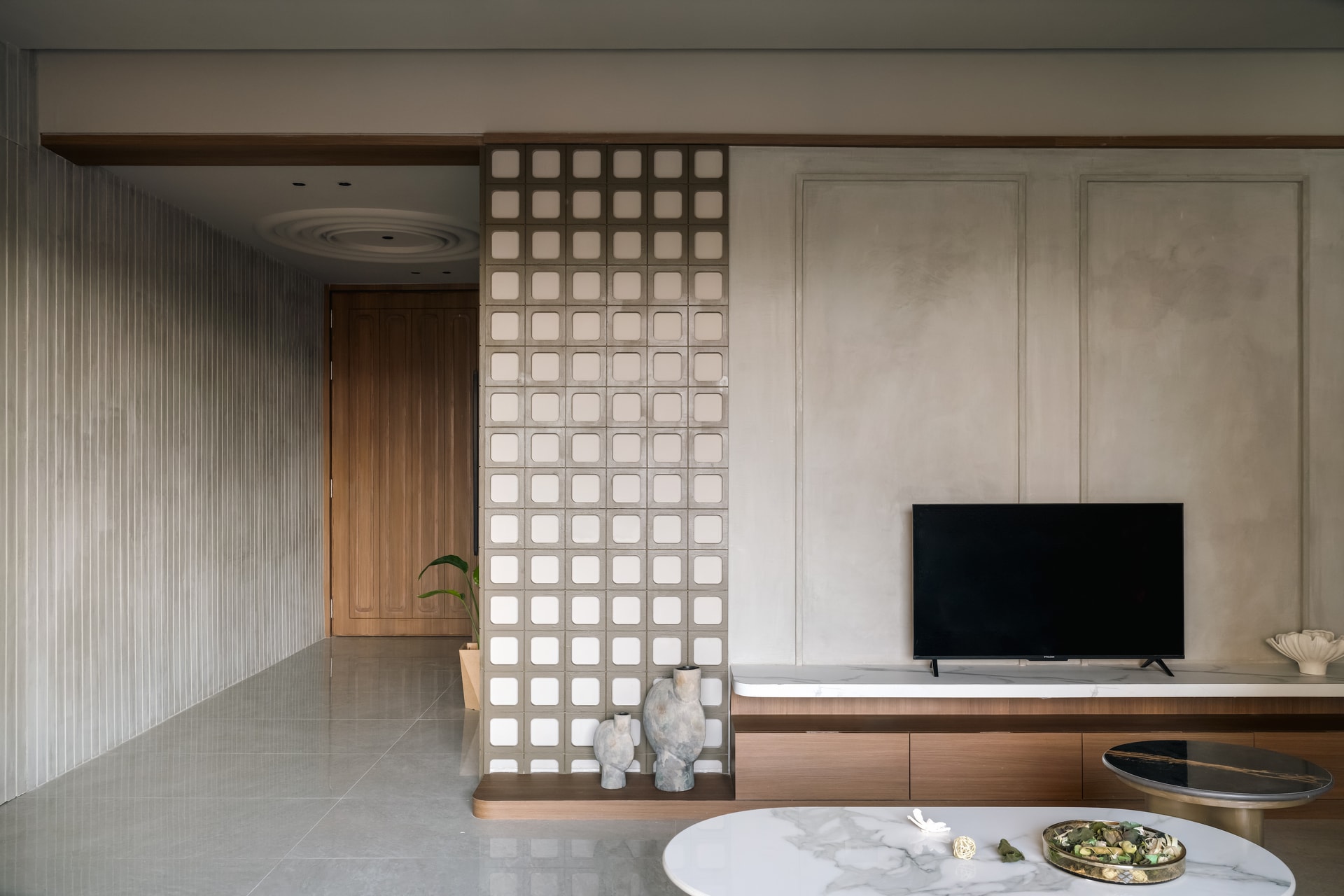 The living room forms the emotional and visual core of G Nest. Designed to be both inviting and refined, it features soft neutral hues, textured fabrics, and warm wooden finishes that layer tactility and depth into the space. Large windows bathe the interiors in sunlight, accentuating the harmony of tone and texture.