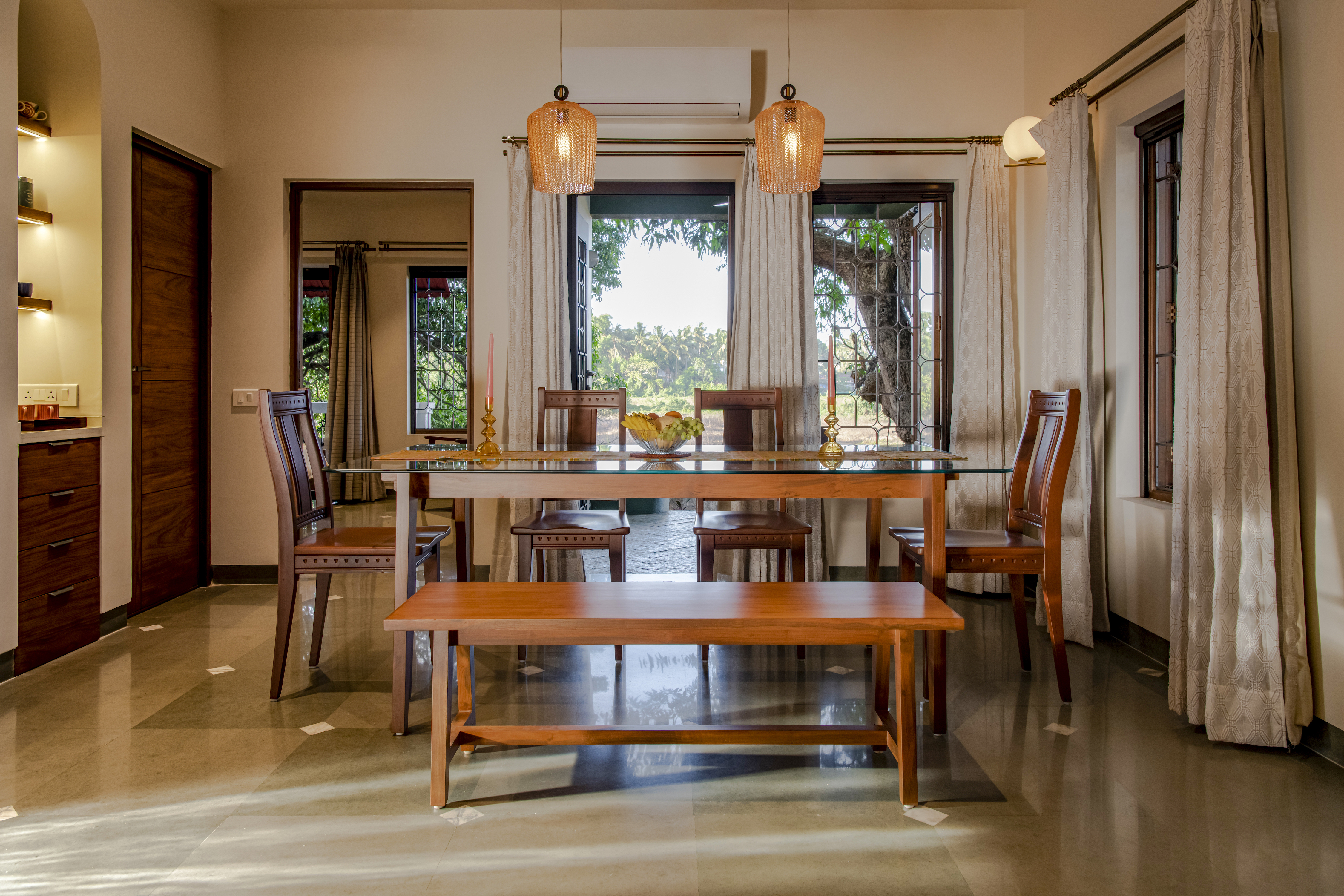 In line with the conscious living concept, textiles were sourced directly from artisans, ensuring each piece was unique and crafted with care. Hand-woven cushion covers from Punjab and Nagaland, as well as bedcovers with Bagru block-printed textiles from Jaipur, adorned the living spaces. Upholstery and curtains were sourced from dead-stock suppliers and upcycled, emphasizing sustainability and uniqueness.
