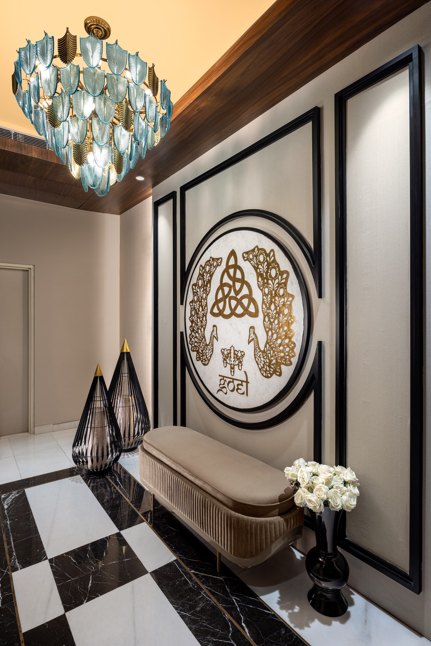 With a sprawling expanse of 6,400 sq ft on the 18th floor of the lavish Camellias in Gurugram, this apartment is home to four extravagant bedrooms and even more posh bathrooms. While the homeowners gave Leena the complete freedom to realise the vision of their dream home into reality, there was a single stipulation, to amalgamate Neoclassical aesthetics and conventional elements of Indian palaces in their new city home. This mandate starts its journey right from the time one gets off the elevator and steps onto the monochrome geometric patterned floor with an eye-catching console in glossy crimson placed in front of a louvred wall feature. With an intersecting four-wave design set within brass inlay, the wall resembles the family emblem—how all the members tied-up together yet have their own trajectories and personalities. A sparkling chandelier sets the tone for the glamour that awaits within.