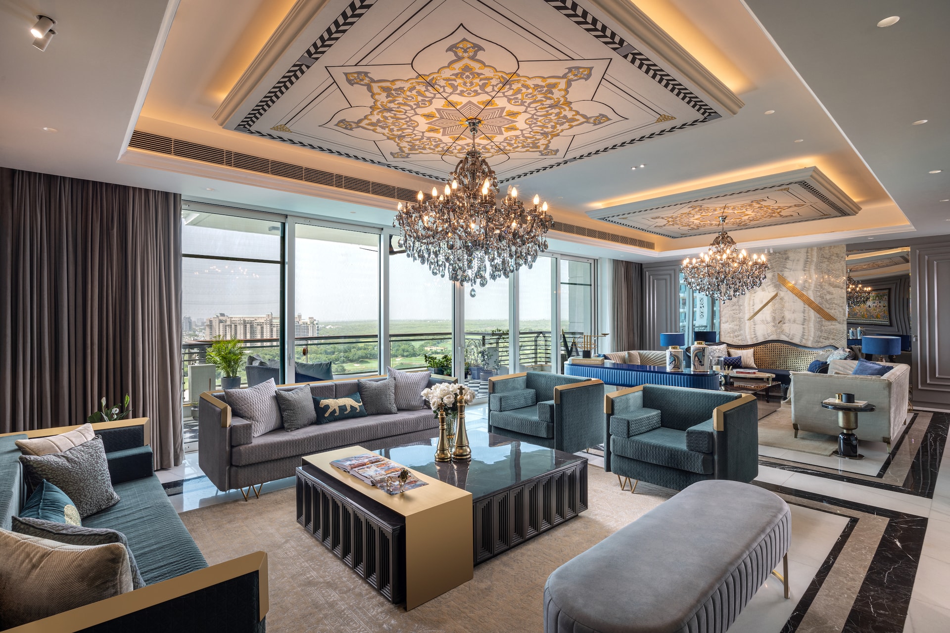 Overlooking the expansive city skyline and greens of a golf lawn, the living room is crafted with distinct hues, the finesse of wood, the radiance of metallic notes, quintessential artwork and a regal chandelier. While tinted mirrors evince dimension and depth to the space, wall mouldings with metallic edges reinforce the French Neoclassical appeal. A colour associated with royalty, blue became the backbone colour in an overall neutral palette. Ensconced between an onyx accent wall on one end and a traditional miniature style painting on the other, the dual social spaces are clad in hushed tones. In this interplay of textures and patterns, while the wicker work couch in brass strips offers a distinct touch of textures, the showstoppers are the notable motifs on the ceiling, replicated on wallpaper.