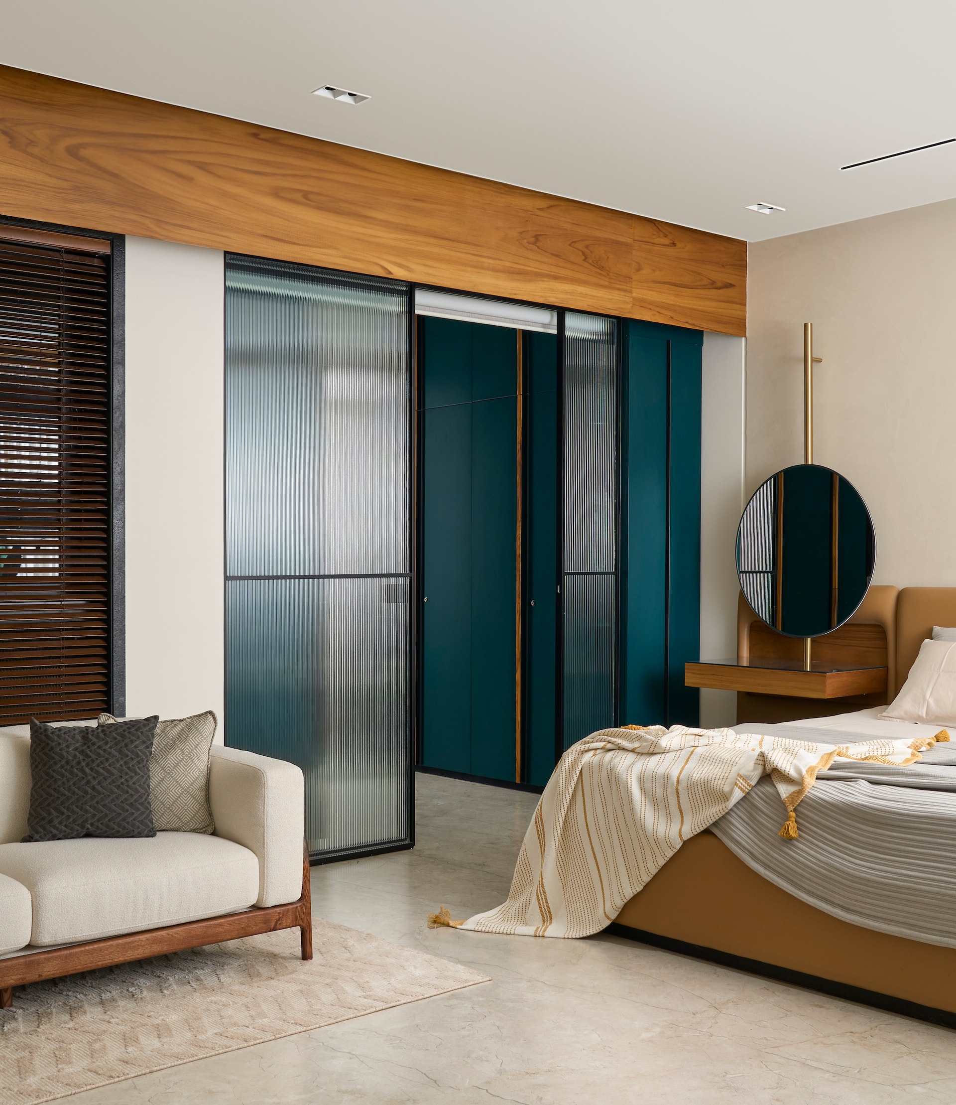 For the adults, the design transitions into a more luxurious, yet subtle realm. The Parent’s and Grandparent’s Rooms are conceived as peaceful retreats—spaces that exude warmth, serenity, and a sense of understated elegance. The use of rich wood, juxtaposed with sleek metal accents, creates a balance between nature and modernity, with hues of calming greens and deep blues reinforcing a restful atmosphere. The clean, contemporary lines are softened by the textural depth of fabrics and materials, adding layers of comfort to these intimate spaces. The result is a refined sanctuary where the tactile richness of wood meets the cool sophistication of metal, creating an environment that feels indulgent yet grounded in simplicity. Every detail, from the carefully chosen bedding to the subtle lighting, is designed to provide a sense of calm, allowing the rooms to serve as personal refuges from the vibrancy of the shared areas.