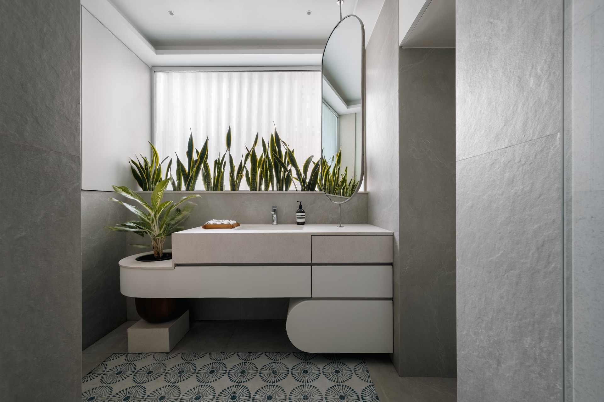 The bathroom is a testament to Saraf’s ingenuity—a space that could have felt enclosed due to the proximity of neighboring structures but instead emerges as an unexpected retreat. Here, tall snake plants act as a natural privacy barrier, allowing daylight to stream in without compromising intimacy. The use of fluted glass further amplifies this effect, distorting external views while maintaining an airy, light-filled ambiance. Even seemingly minor details—such as an embedded plant within the bathroom counter and a rotating mirror—serve dual purposes of function and aesthetic delight, reinforcing the home’s intrinsic connection to nature.
