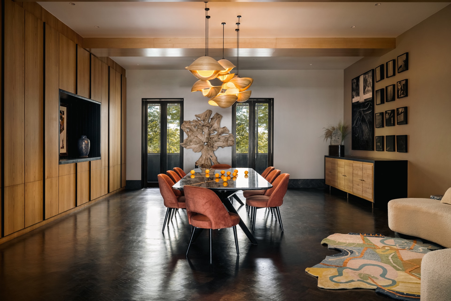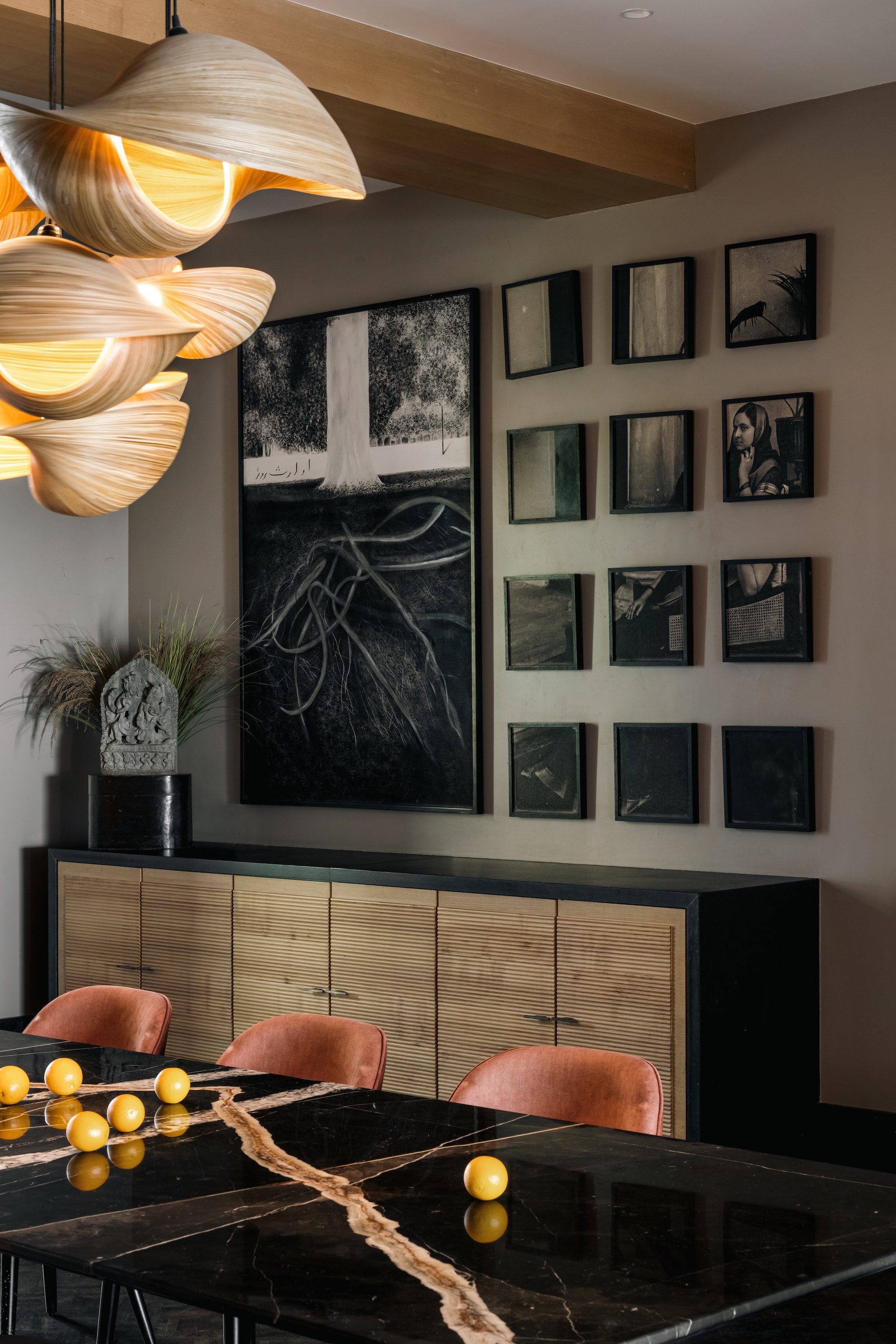 Saraf’s approach to movement within the home was deliberate: instead of rooms defined by rigid enclosures, there is a carefully orchestrated sense of flow. The transition between living, dining, and mezzanine unfolds organically, allowing function to dictate form rather than the other way around. One does not simply walk from space to space but rather glides through an environment that feels inherently connected, reinforcing the idea that every inch of Meherbaan belongs to a singular, cohesive vision.