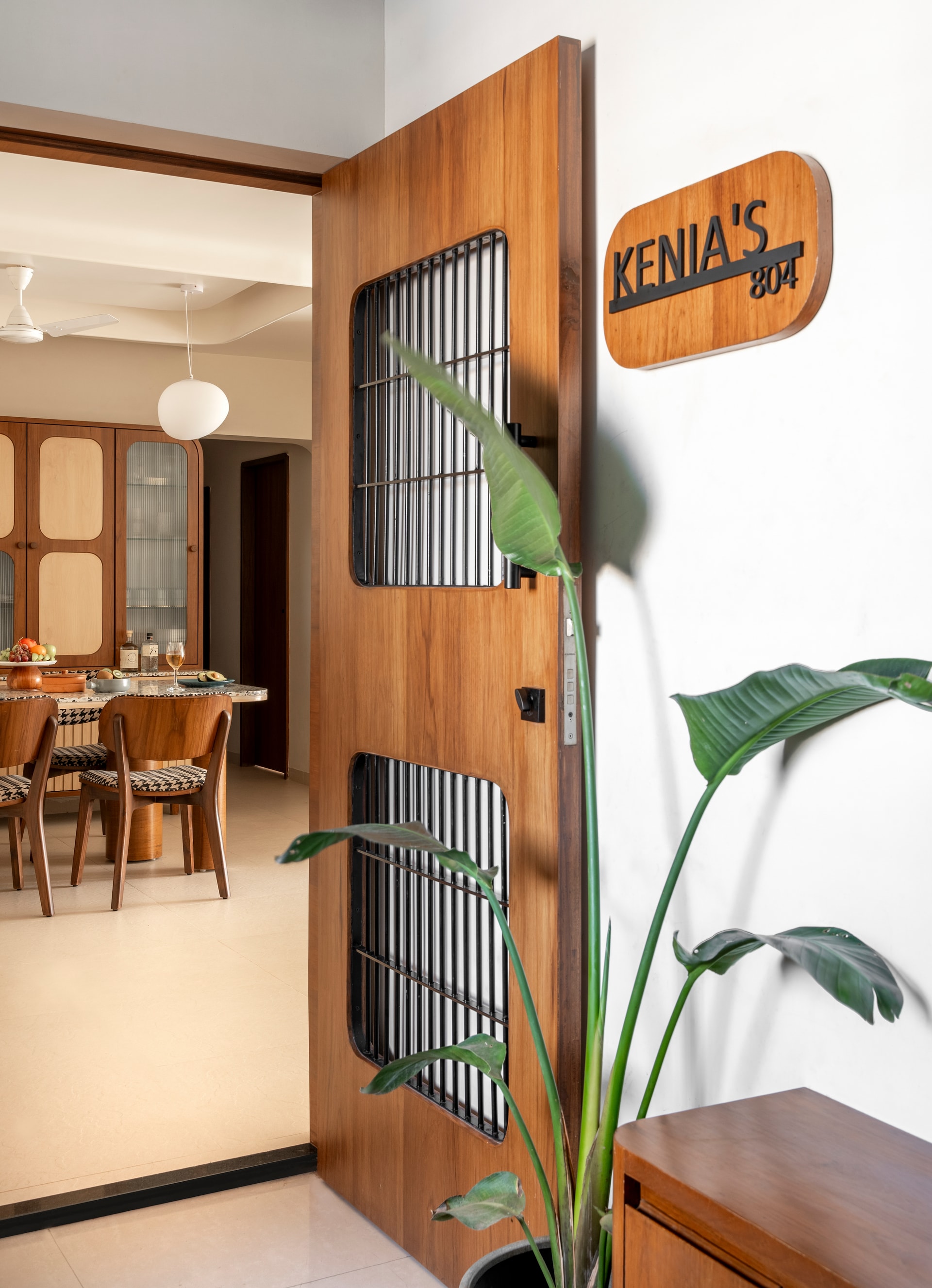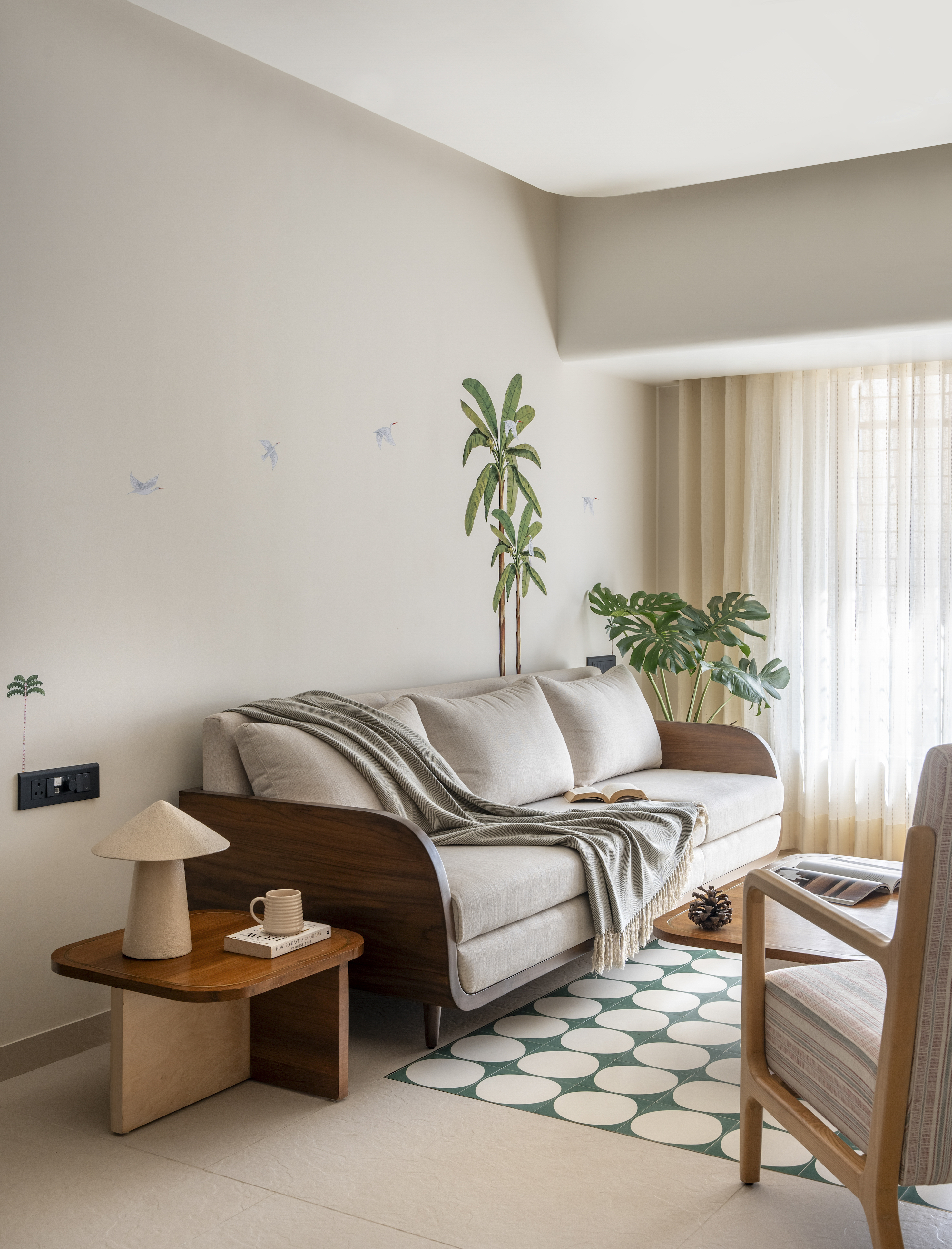 The design narrative unfolds from the entrance, where teak wood and teak veneer wrap the main door, shoe cabinet, and credenza, establishing a sense of continuity and permanence. This warmth flows seamlessly into the living area, where muted backdrops are gently animated by indoor greenery and hand-crafted bird and botanical wall decals by KalakaariHaath. A defining feature of the space is the custom egg-shaped tiled carpet composed of bottle green and off-white tiles, edged with a delicate brass inlay. Designed to emulate the softness of a rug through architectural means, it anchors the seating arrangement while adding texture and visual depth. Solid teak coffee and side tables detailed with birch plywood legs and brass accents complement the generous sofa and accent chairs, while the entertainment wall in teak veneer integrates floating shelves and a tall open library. A matte black MS pipe framework extending to the ceiling introduces a subtle industrial edge, remaining functional without disrupting the overall warmth.