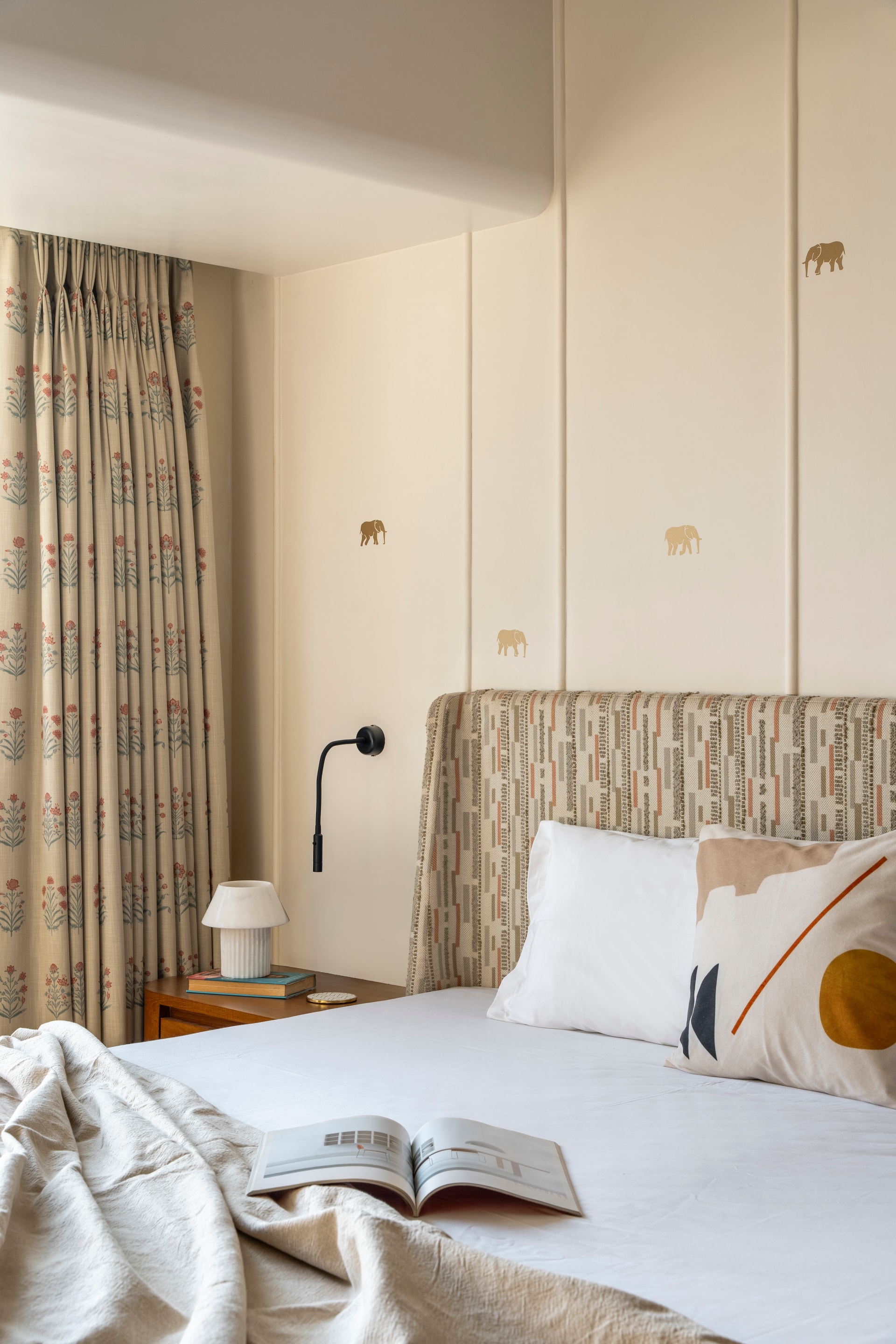 The private spaces reflect a thoughtful shift in tone while remaining true to the overall design language. The children’s bedroom introduces playfulness through chevron-patterned wooden flooring, cobalt blue PU-finished shutters, and custom furniture including a bunk-bed–sofa hybrid and a dedicated study zone. Wall- and ceiling-mounted monkey bars near the window transform the room into an interactive environment, seamlessly merging design with movement and imagination. In contrast, the master bedroom is calm and composed, defined by two-tone flooring subtly divided by a brass pati. Teak veneer furniture with brass handles reinforces material continuity, while the upholstered headboard introduces muted colour through vertical stitch detailing. Floral butta curtains, bespoke moulding details, and matte gold elephant motifs by KalakaariHaath add cultural nuance without visual weight.