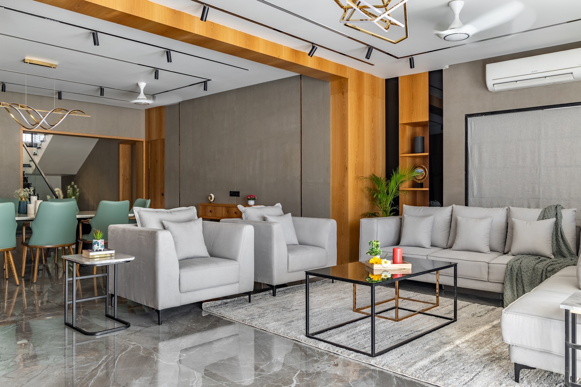 The dining area, an extension of the living room, maintains the grey walls and woodwork. A marble-topped dining table pairs beautifully with soft teal upholstered chairs. An abstract pendant light and spotlights offer the option of intimate or softly lit ambiances.