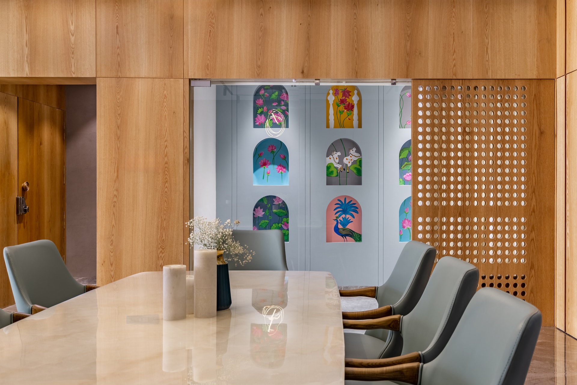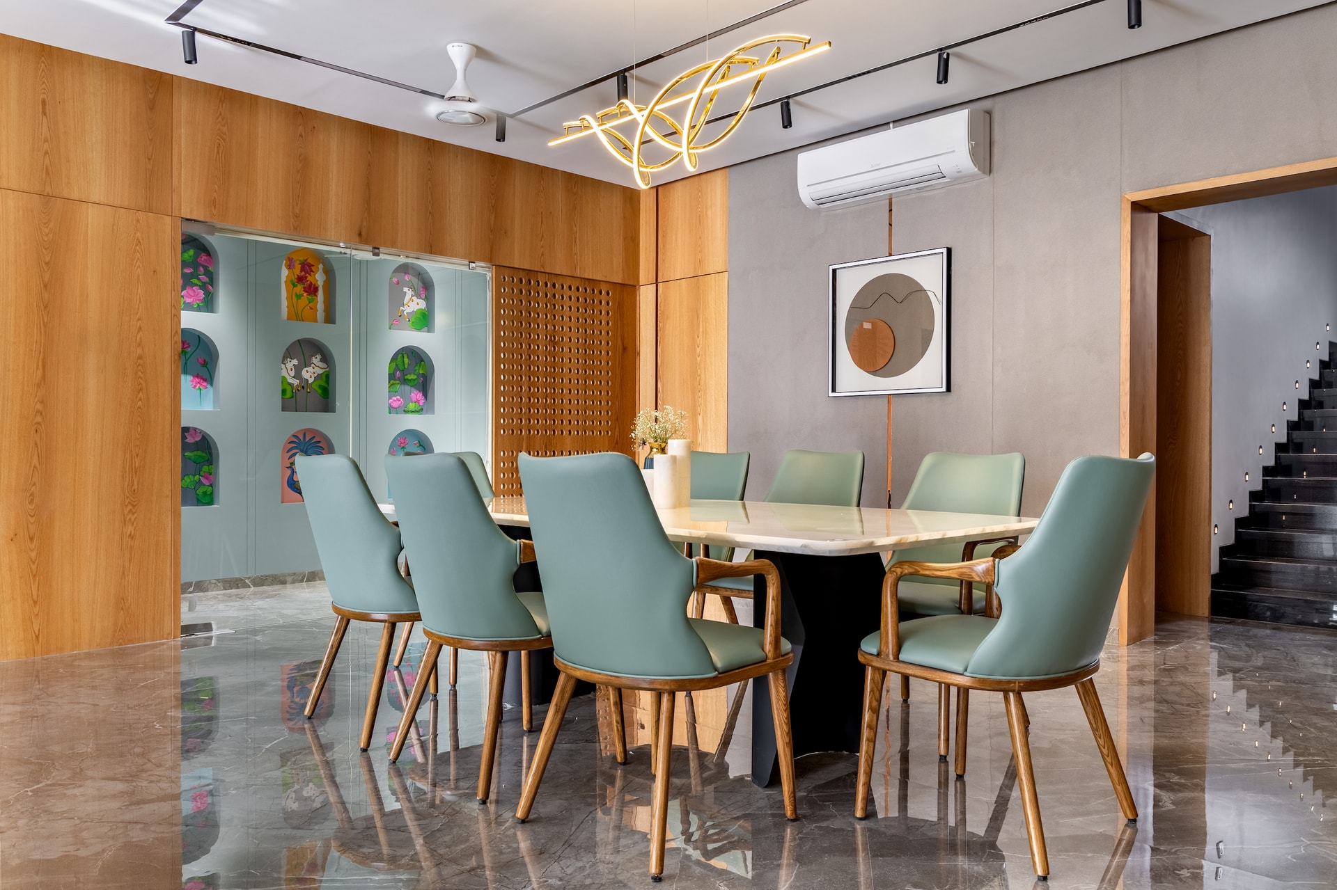 The prayer room is a serene haven that radiates tranquility throughout the house. Soft arches and a palette of whites and soft teals combine modern and traditional elements. Recessed arches with traditional Pichwai paintings adorn the left wall, enhancing the room’s elegance and providing a pleasing aesthetic for the dining area. A mesh wooden wall in the corner ensures natural light and air ventilation.