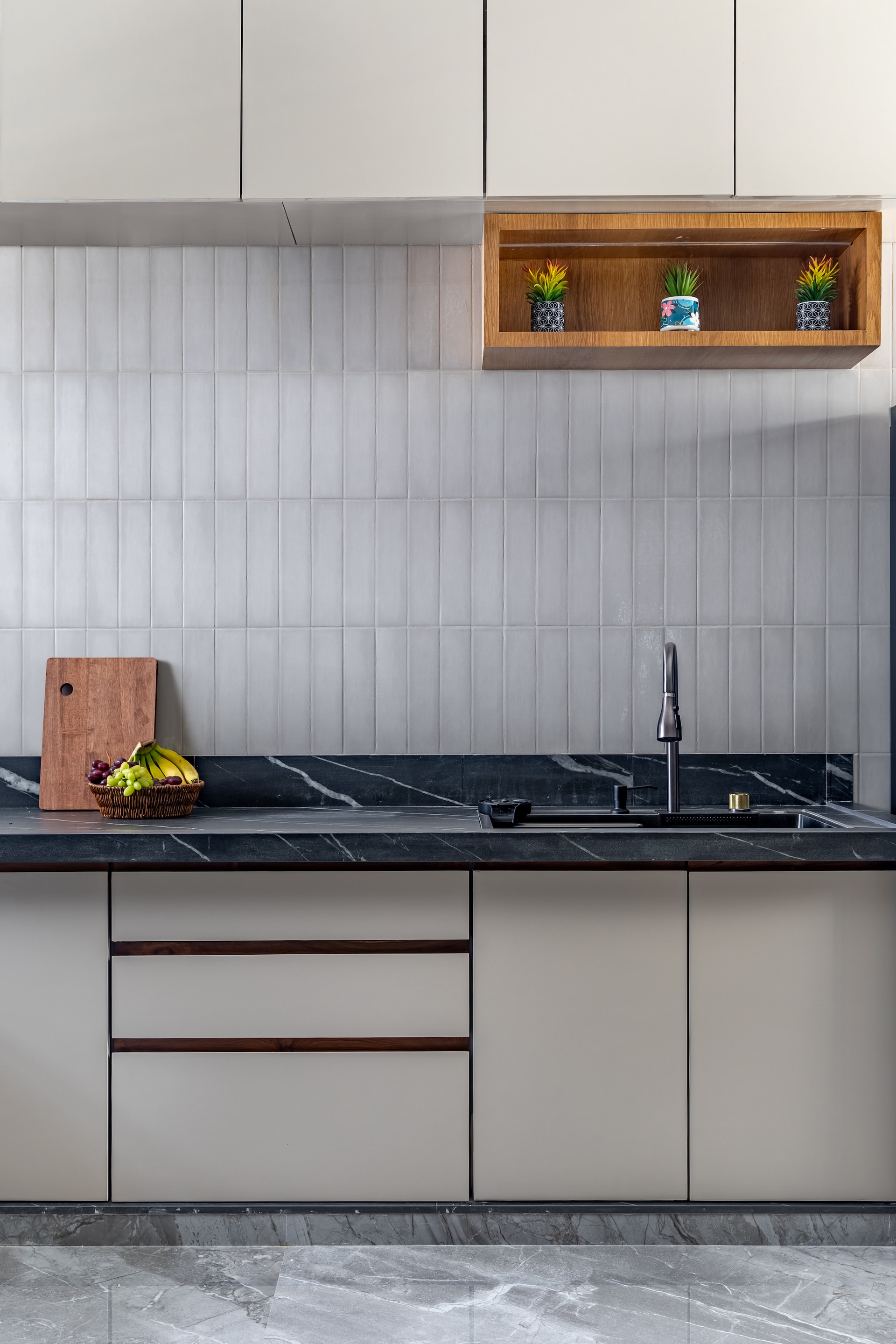 The kitchen, a dream space for any homemaker, balances ample space with inherent aesthetic beauty. Designed as a modular kitchen, it features reflective grey backsplash tiles for a sophisticated look and easy maintenance. Overhead cabinets and bottom modular drawers provide perfect storage solutions, while a black granite bracketed platform offers ample prep and cooking space.