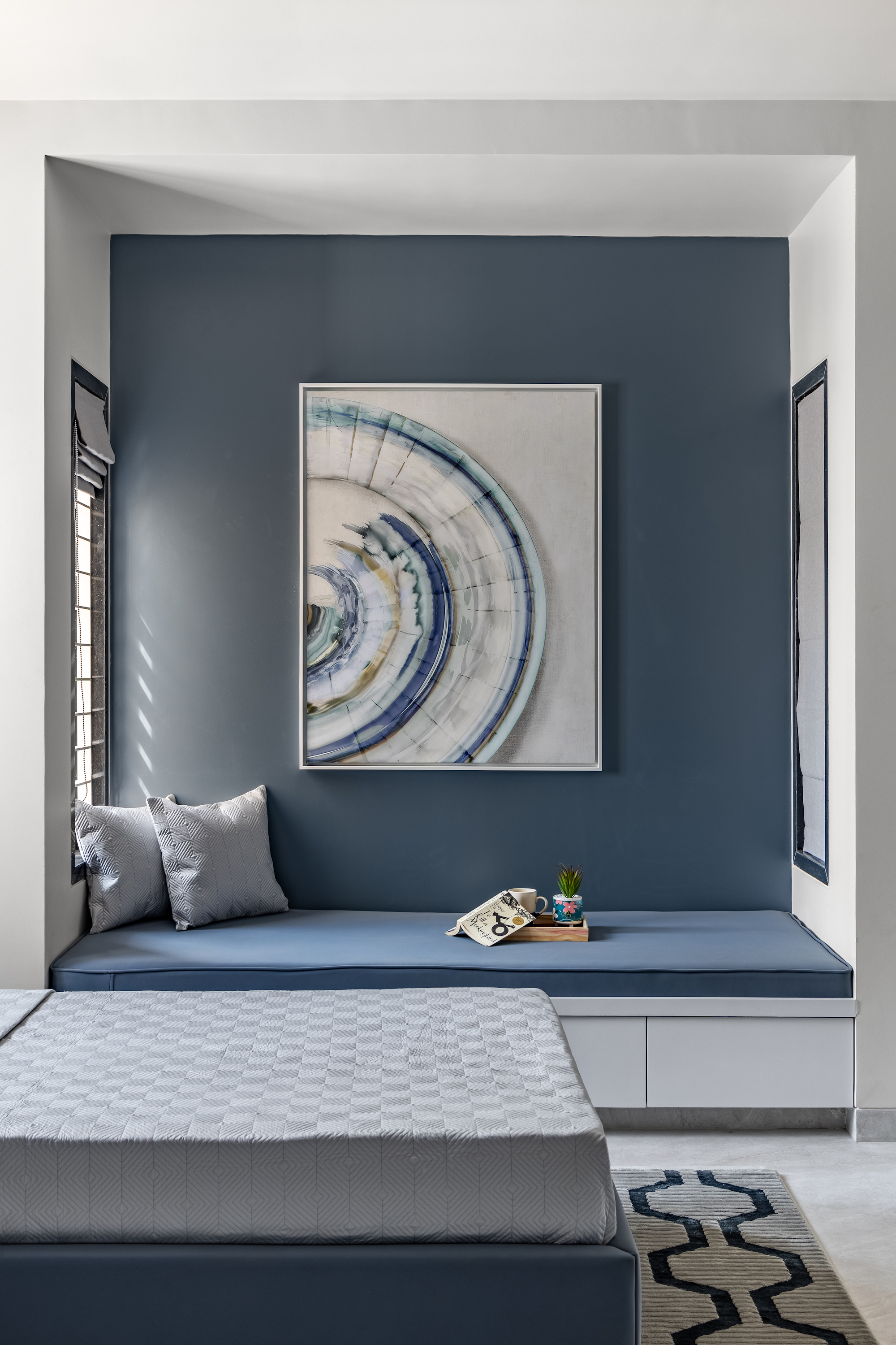 In the children’s bedroom, a palette of steel-blue and whites creates a soothing atmosphere. Twin beds with wardrobes separated by a dressing area make it a sensible design for two kids sharing a room. A cozy nook in the corner is perfect for reading, napping, or lounging. Rose-gold trimmings on the walls and furniture knobs add an elegant touch.