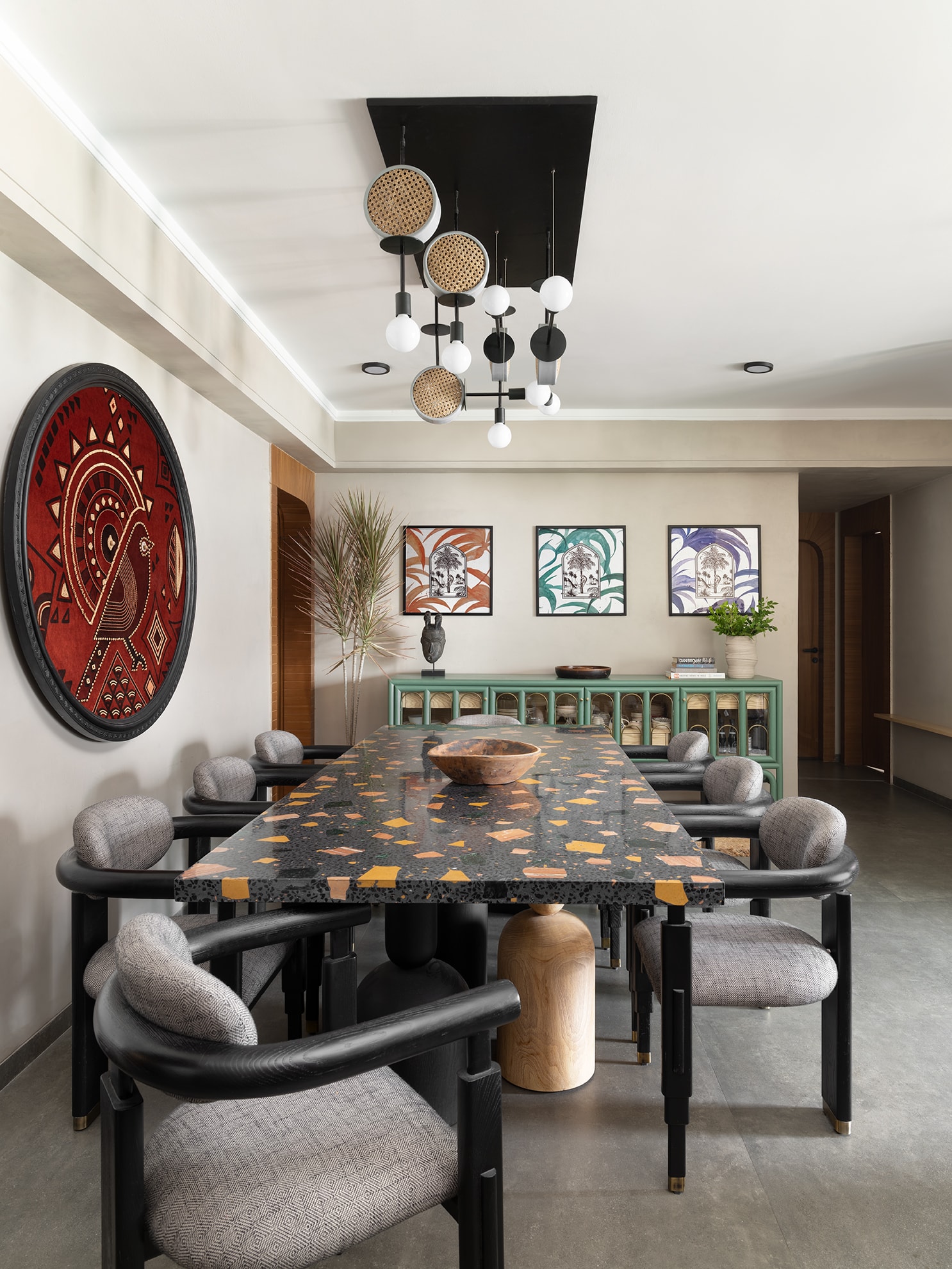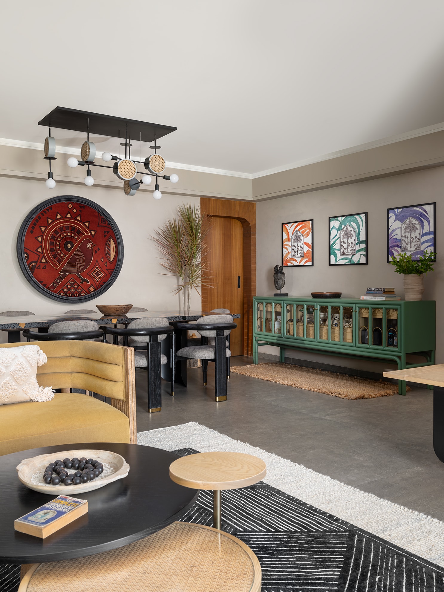 Every inch of this home reflects meticulous attention to detail, with furniture pieces custom-designed to suit the client’s lifestyle and spatial needs. In the living area, a sprawling L-shaped sofa serves as the anchor, designed for convivial gatherings yet exuding refined comfort. It’s paired with a trio of round coffee tables, each showcasing a unique interplay of texture and finish—grain-polished black, cane-woven surfaces, and a pop of vibrant green polish. This dynamic arrangement not only enhances functionality but also introduces an eclectic charm to the space.