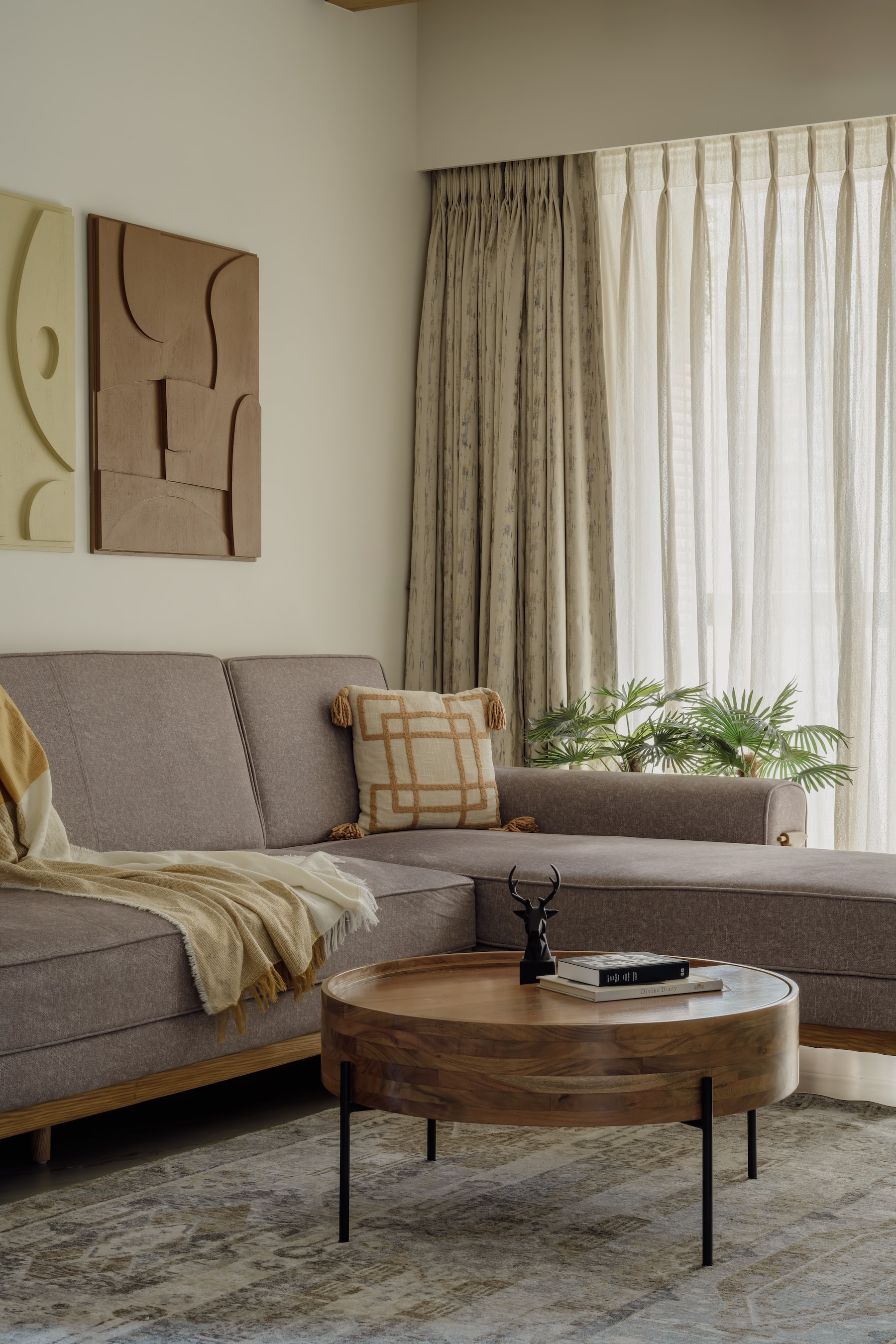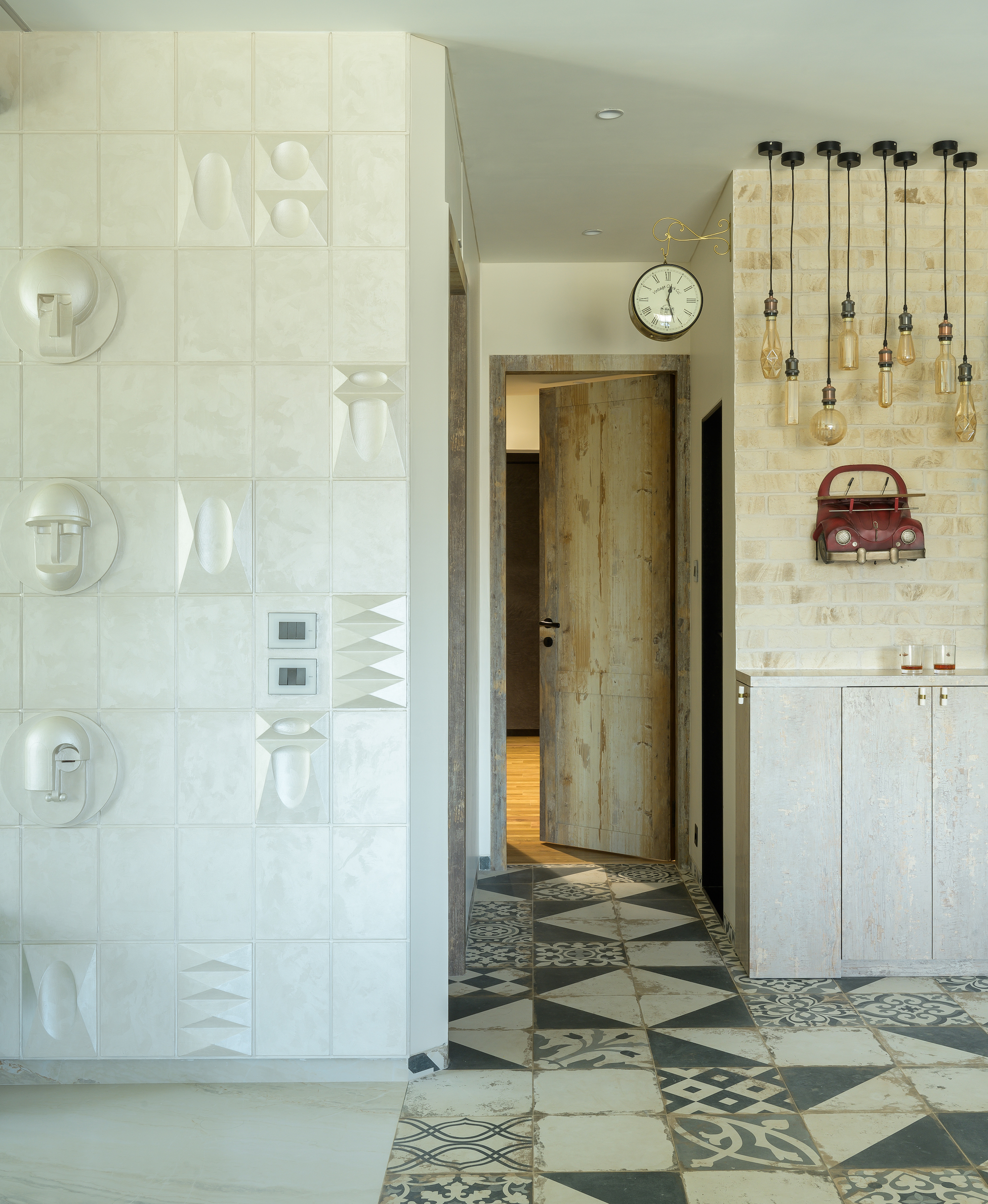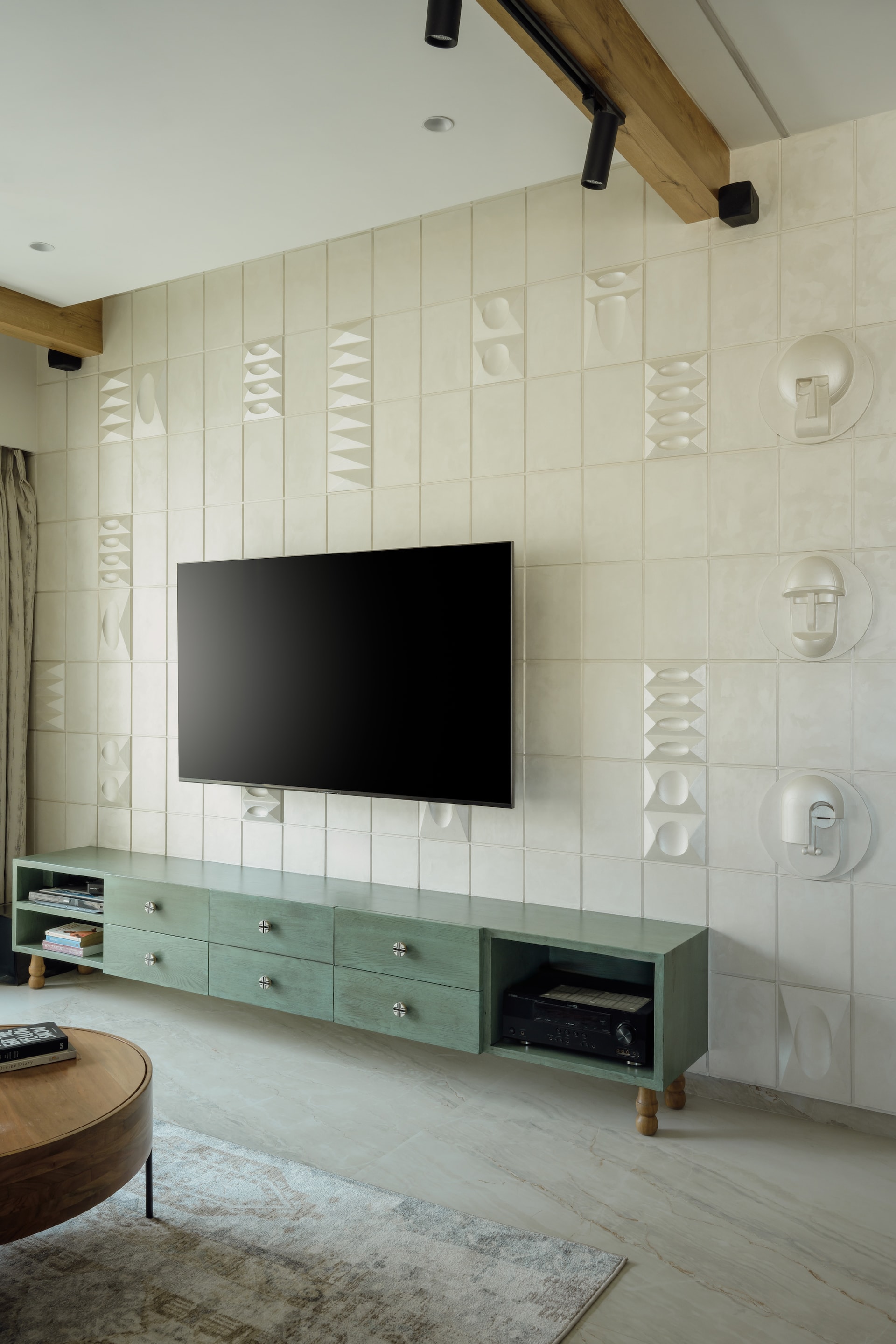 A standout element in the living room is the TV wall, a piece of artistic ingenuity. The wall, segmented into textured panels with random 3D geometric shapes and clay man masks, is finished in light texture paint, adding depth and visual intrigue. Complementing this feature is the rustic green TV unit, which ties in seamlessly with the retro aesthetic.