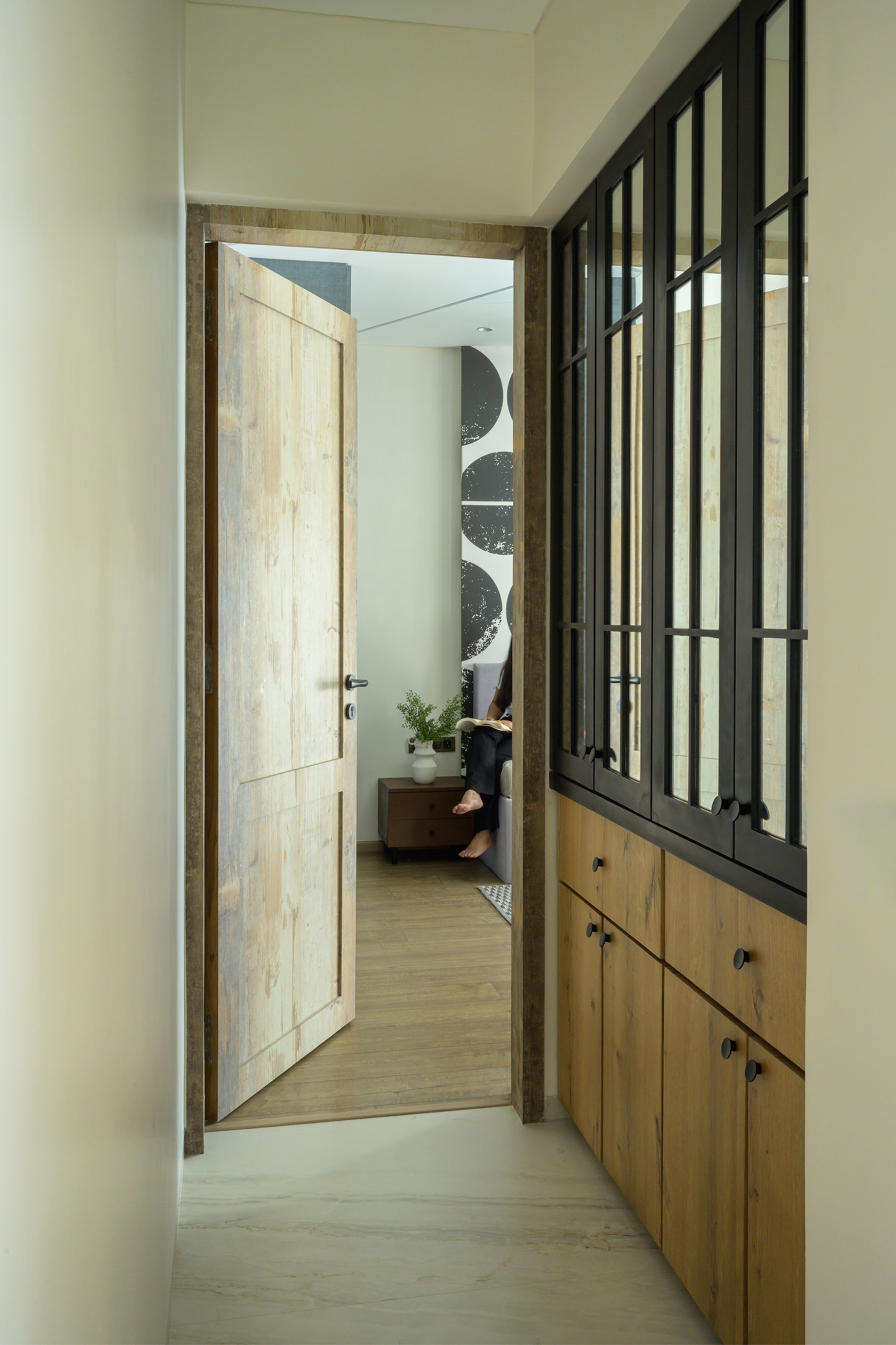As one steps through the striking Blue PU door—a glossy, bold entryway—the journey into retro-inspired elegance begins. This doorway sets a playful yet sophisticated tone, seamlessly introducing the interior’s thematic richness. The living room, anchored by an L-shaped sofa and a wooden center table, is a testament to the design’s commitment to comfort and style. Here, abstract wall art in vivid hues forms a captivating focal point, energizing the space with a splash of creativity.