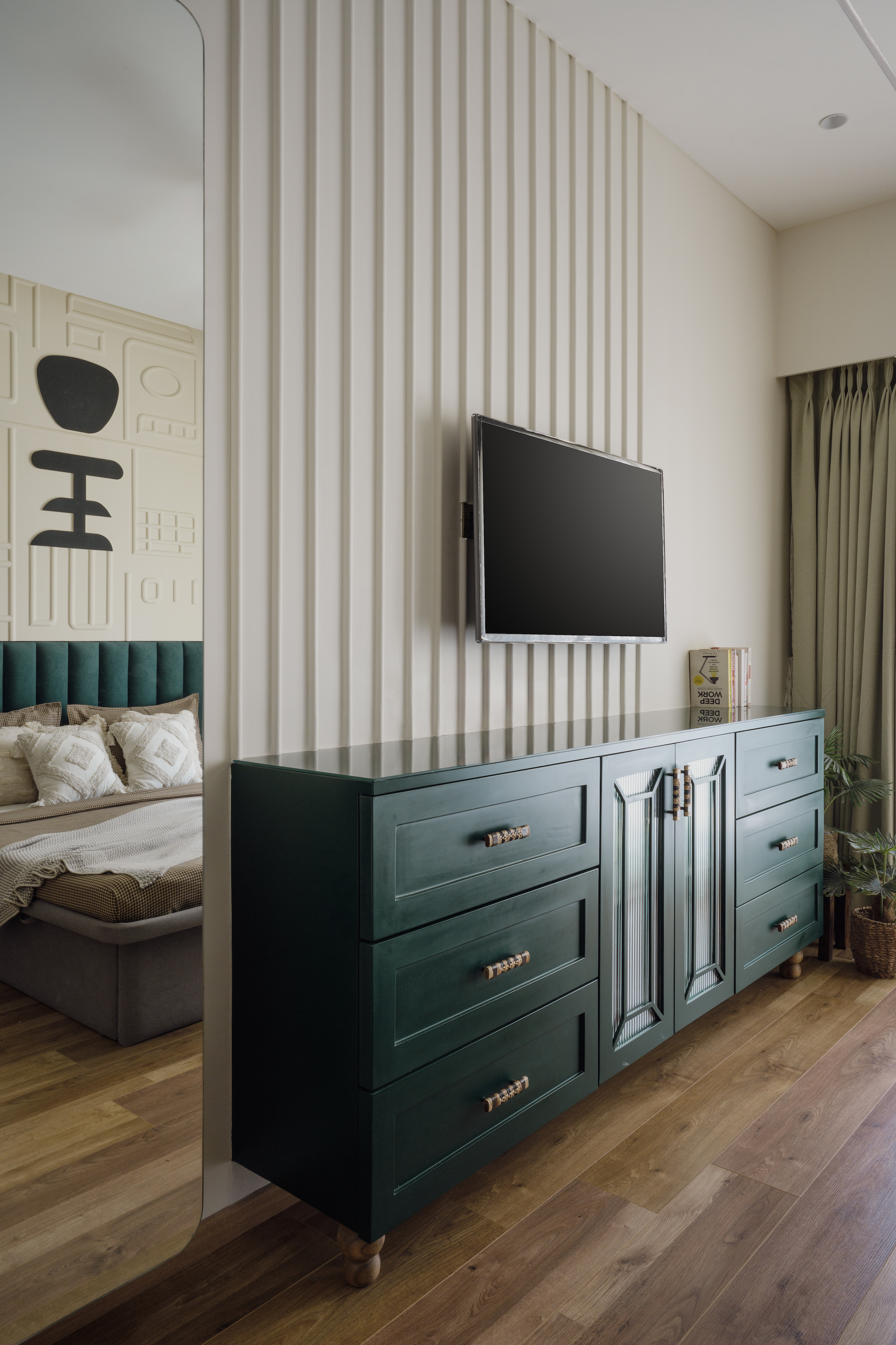 The master bedroom, a study in sophistication, showcases an emerald green headboard set against an abstract 3D art backdrop and framed by full-length mirrors arranged in a grid format. This dramatic focal point is complemented by an emerald green chest of drawers, doubling as a TV unit. Dark grey stone finish laminate and dark wooden flooring contribute to a serene, natural ambiance, blending modernity with a touch of tranquility.