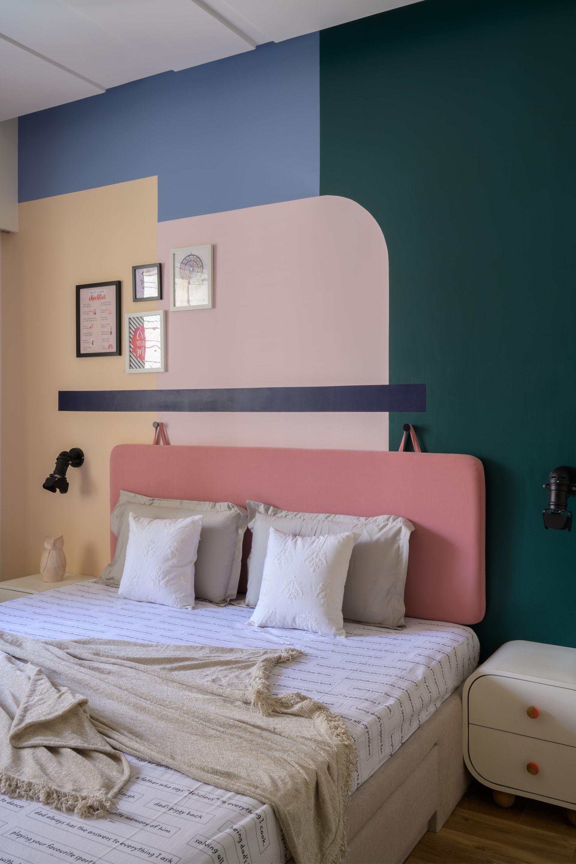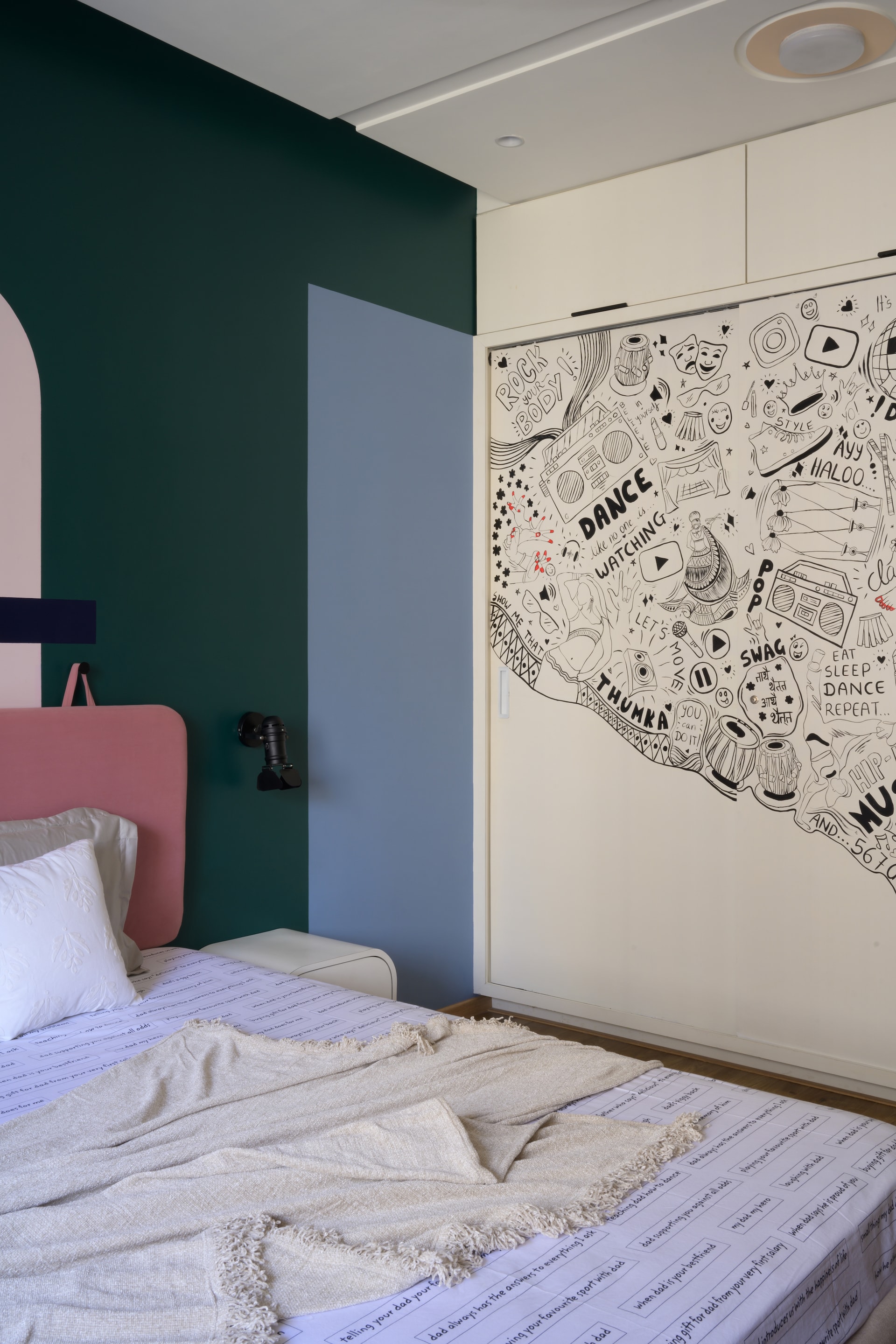 In the daughter’s bedroom, pastel hues create a cheerful and inviting atmosphere. The salmon pink fabric headboard stands out against a backdrop of geometric patterns, with wardrobe shutters featuring playful “Dance” doodle art, reflecting a personalised and lively space.