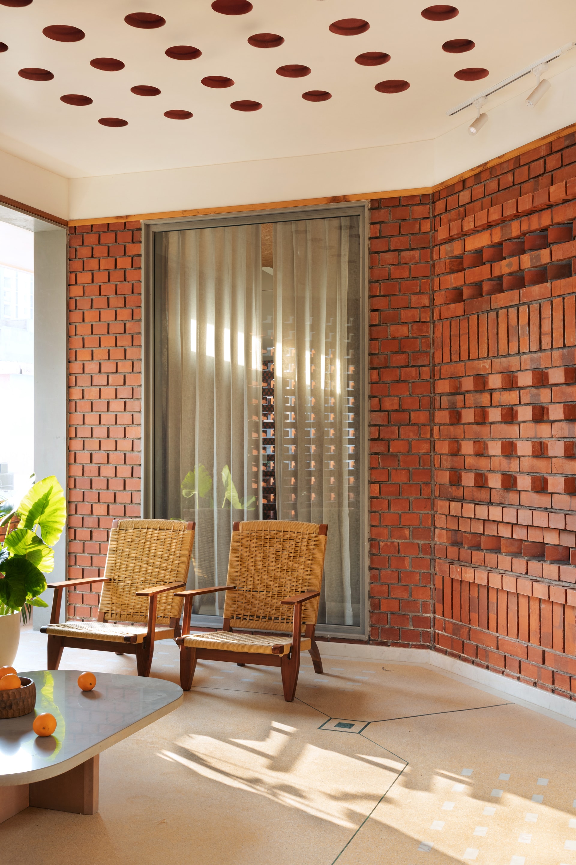 Structurally, the building rests on an RCC framework, but its architectural language is defined by exposed brickwork, a material chosen for its integrity and cultural resonance. In Jaipur, exposed brick often carries the stigma of being “unfinished”; here, Vipul reinterprets it as a surface of refinement, shadow play, and thermal stability. The brick is left unplastered, allowing bonds, joints, and porosity to express themselves. This decision creates a façade that is visually textured, climatically responsive, and liberated from cosmetic treatment.