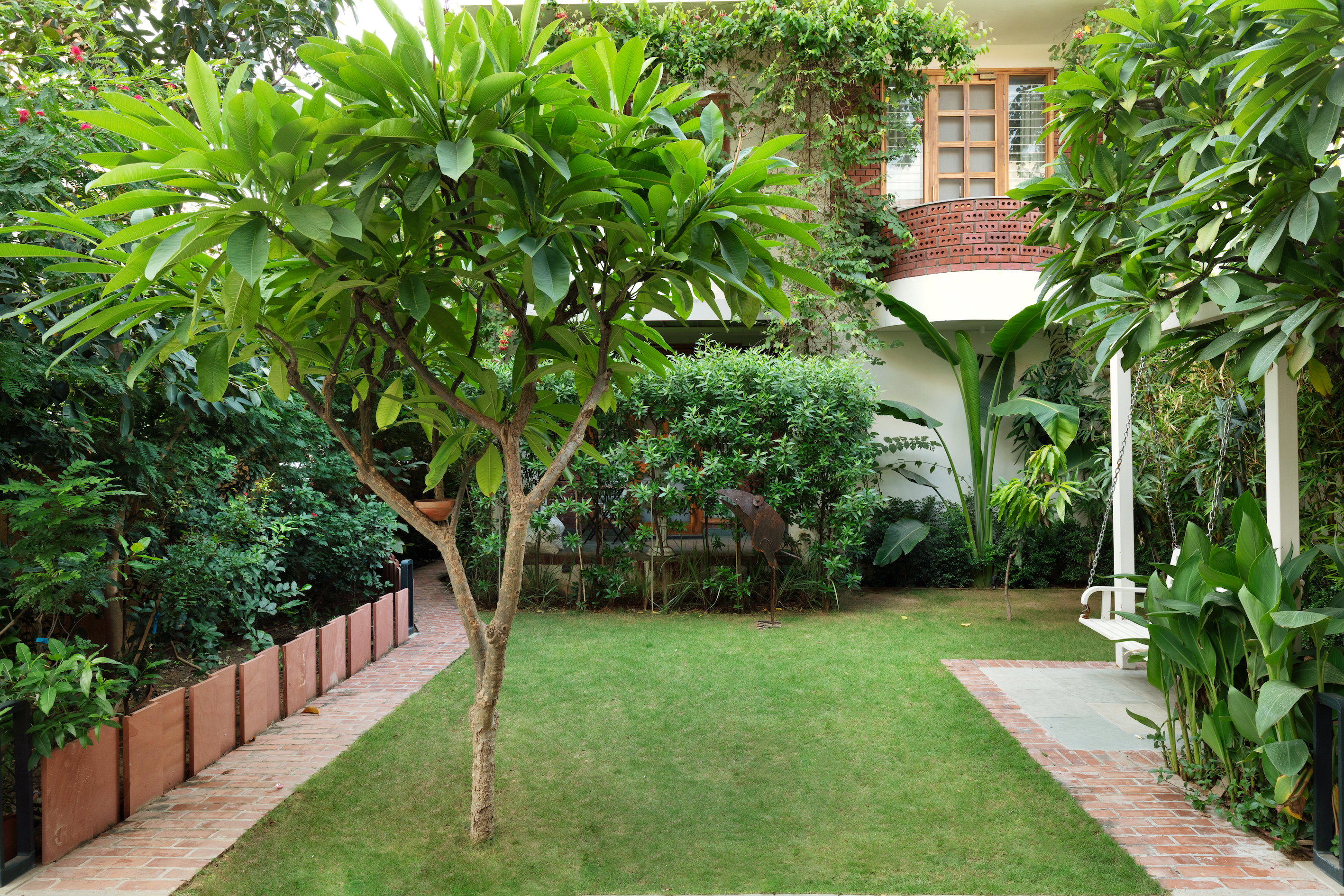 The project’s identity is shaped by the merging of two disciplines. The father’s horticultural understanding informed the planting strategy – species selection, shade patterns, and the alignment of climbers with built edges, while Vipul’s architectural training introduced rigour in material, proportion, and spatial logic. This synergy is expressed not through decorative landscaping, but through calibrated relationships between soil, shade, structure, and light. The garden is not an add-on; it is a spatial device that mediates thresholds, softens massing, and anchors the project to its site.