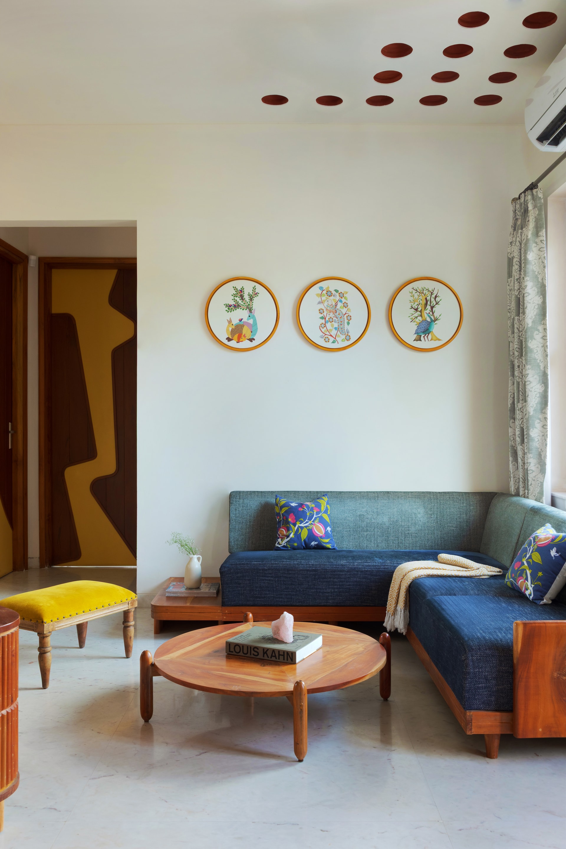Rejecting suspended ceilings, the architect integrated sakore – earthen saucers, into the slab at the time of casting. These terracotta inserts create a lightly contoured ceiling plane, lending the interiors a warm, handmade presence that avoids unnecessary enclosure. The intervention references vernacular cooling techniques, while introducing a subtle textural rhythm within the rooms.