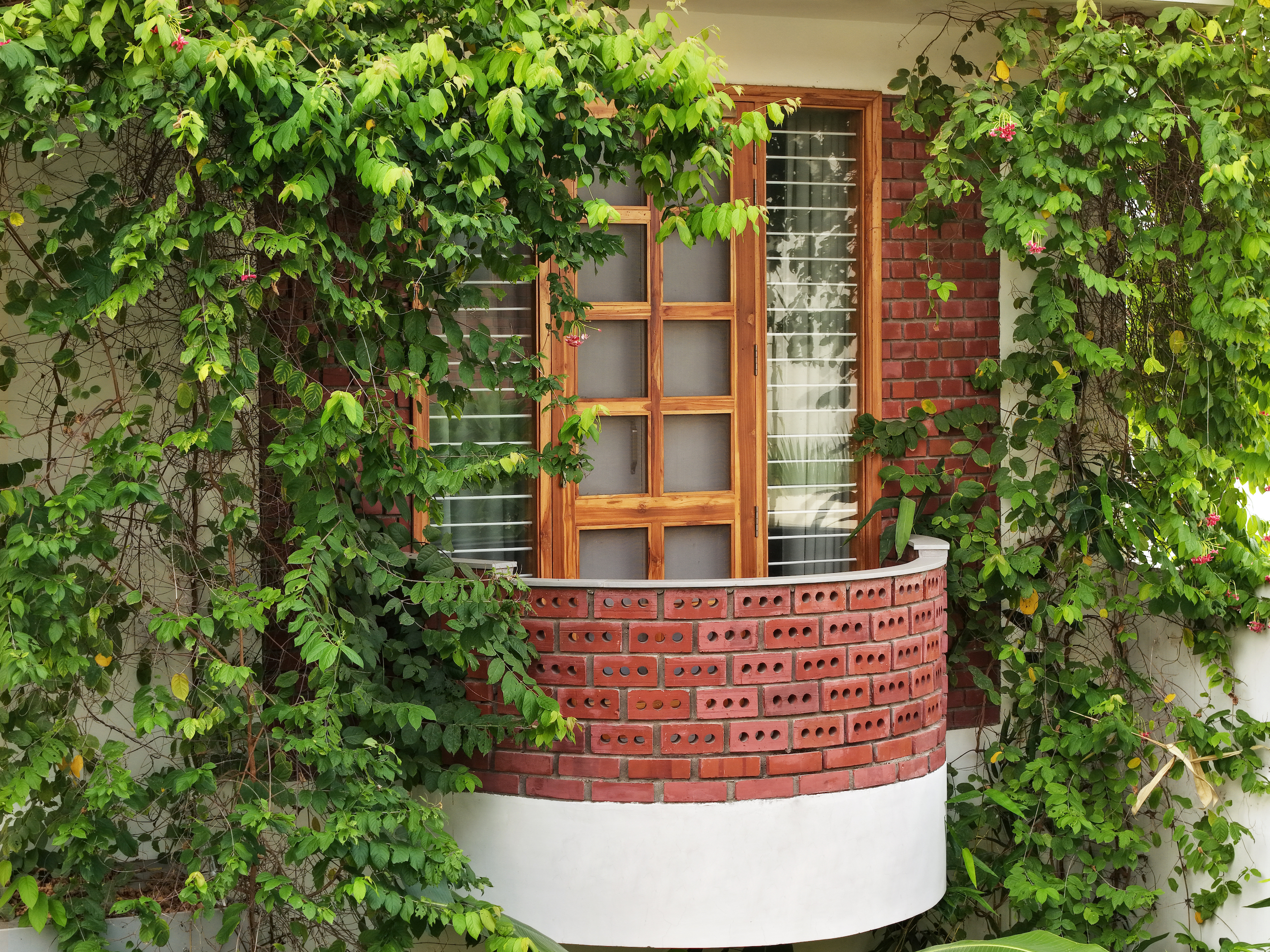 The garden acts as a contiguous ground plane shared between built volumes. A considered mix of fruiting trees, flowering shrubs, and climbers structures the open spaces, allowing seasonal variation to influence shading, fragrance, and colour. The east façade, overgrown with climbers, functions as an ecological extension of the ground, softening the verticality of the building and cooling the microclimate around it.