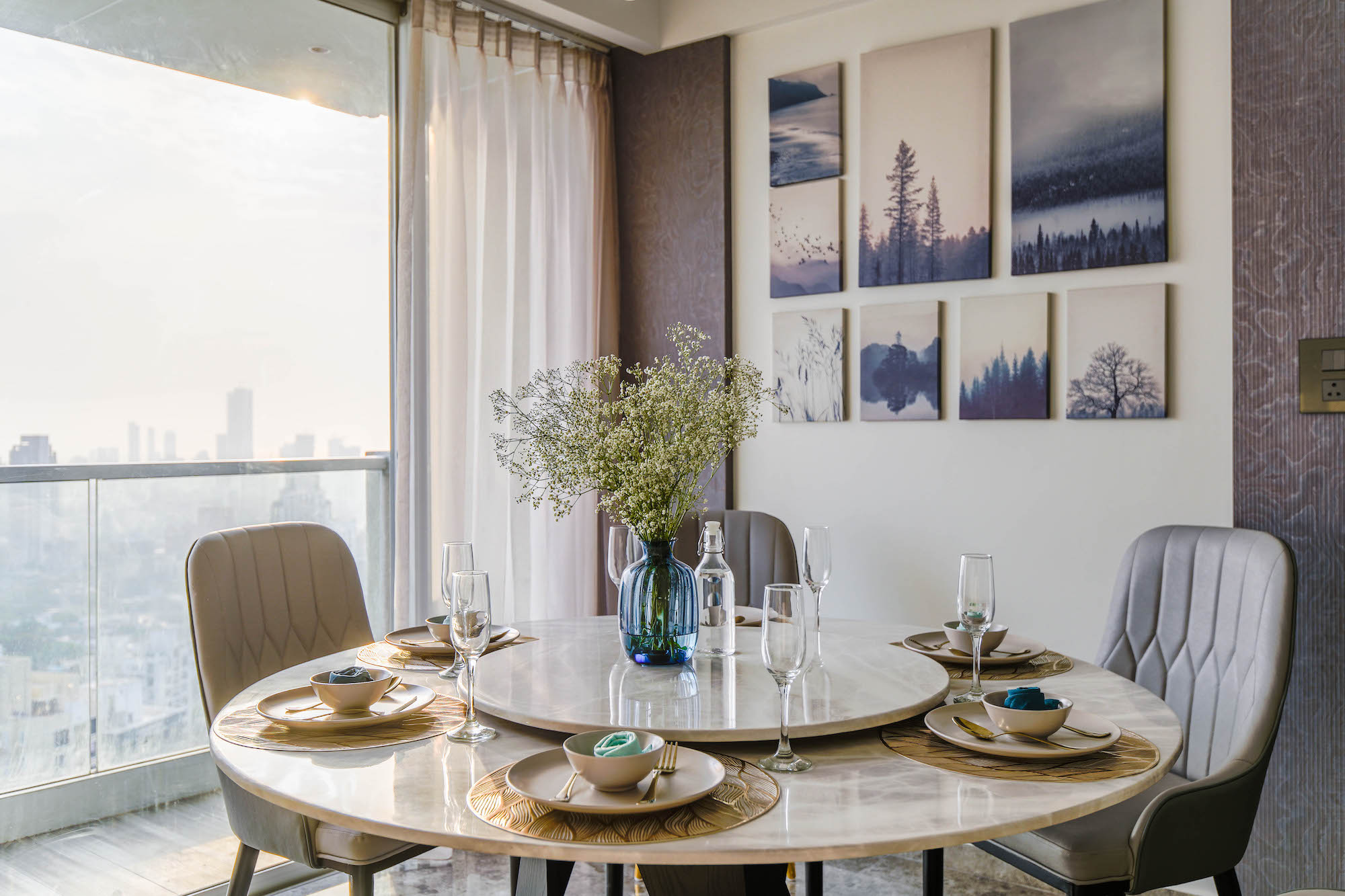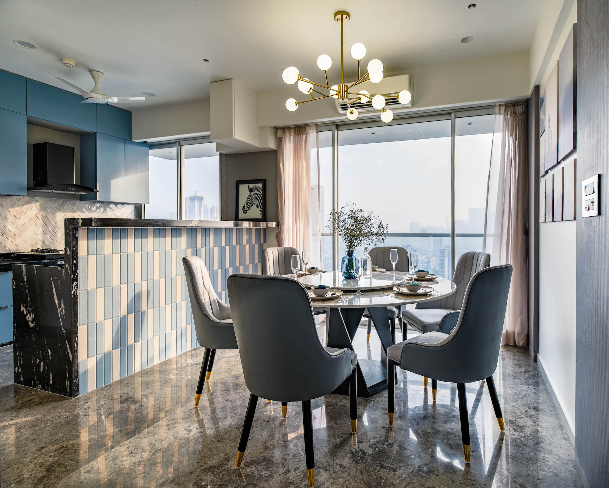 Perched high above the bustling city below, this stunning 2600 square feet apartment boasts panoramic 360-degree views of the mesmerising skyline. The apartment has been masterfully designed to cater to a charming family of four, with every element carefully crafted to create a sophisticated and serene living environment. Understated elegance is at the forefront of the design, with a muted colour palette that dominates the space. Shades of grey, taupe, and tiara create a tranquil backdrop, while accents of raw umber and tan add visual depth and interest.