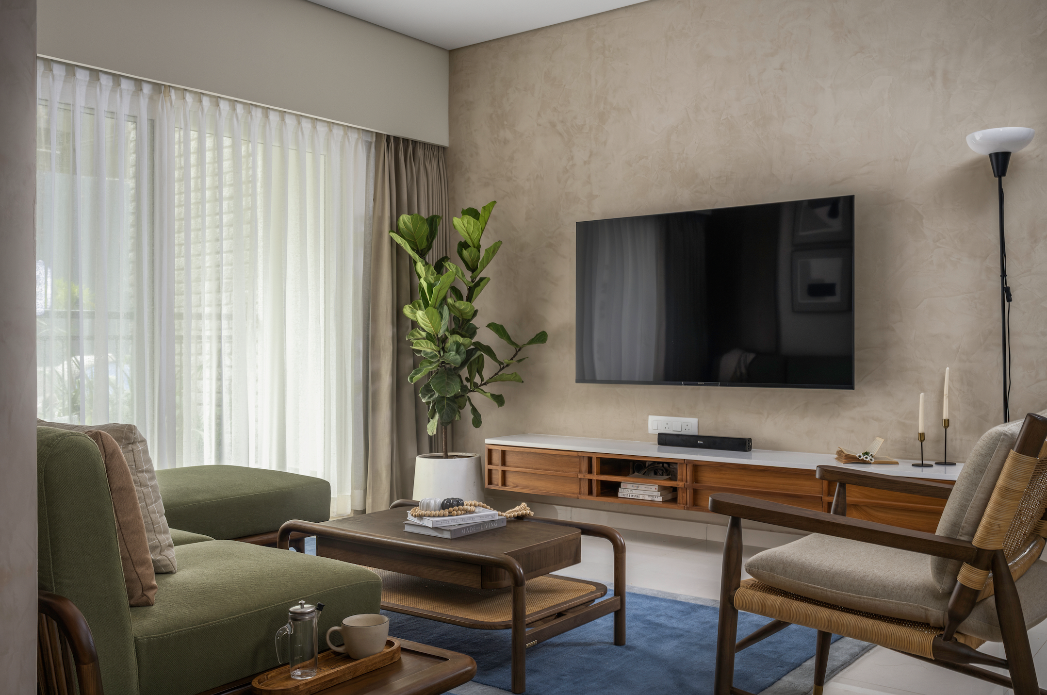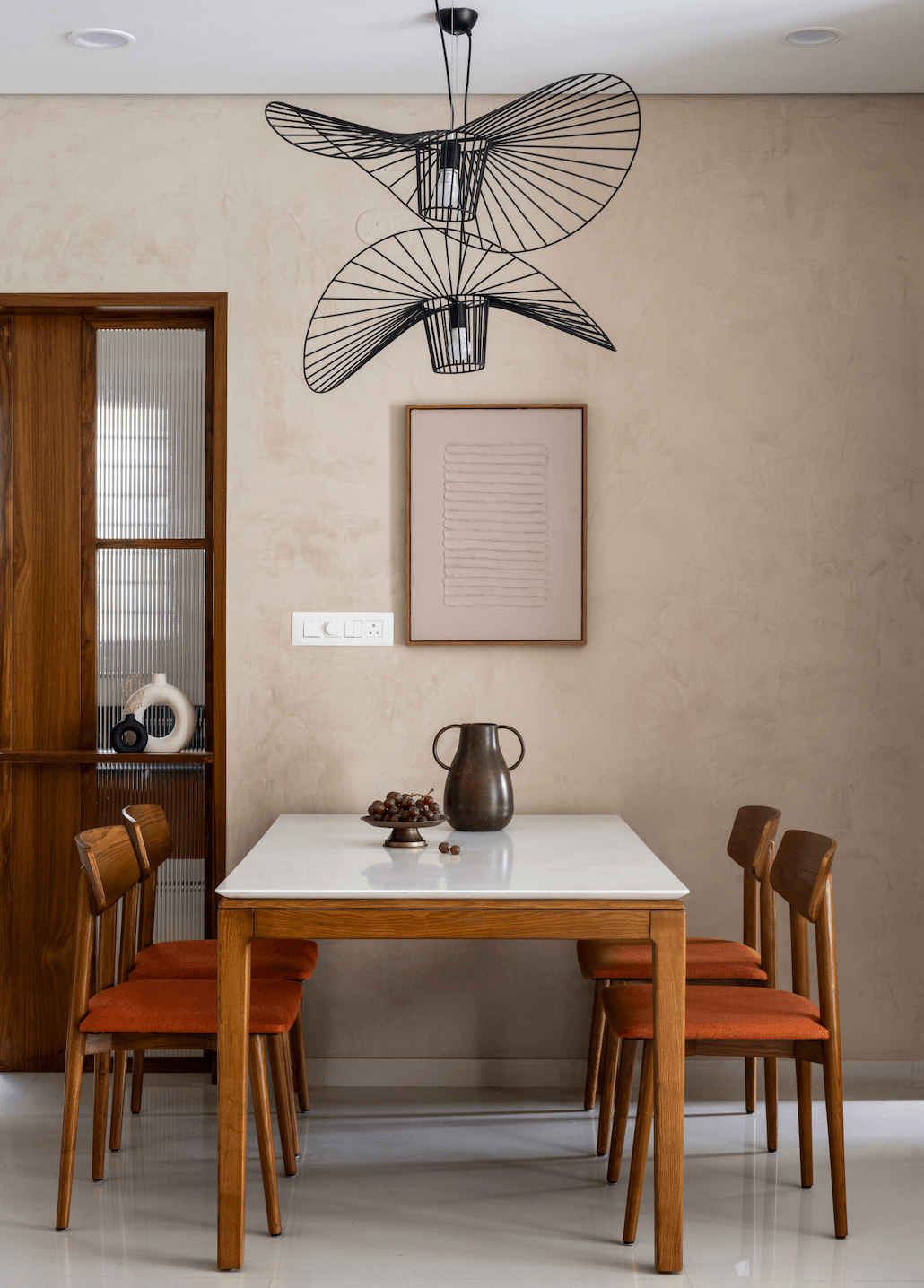 There are homes that rely on spectacle, and then there are homes like Summer Soirée – spaces that quietly unfold, revealing their character through light, material, and mood. Designed as a compact 3BHK in Bangalore, this 1,800 sq ft residence is anchored not by excess, but by atmosphere. Sunlight becomes the primary design element, grazing softly across textured stucco walls and settling gently on natural teak surfaces. The effect is immediate yet restrained: the interior feels bright without sharpness, warm without heaviness.