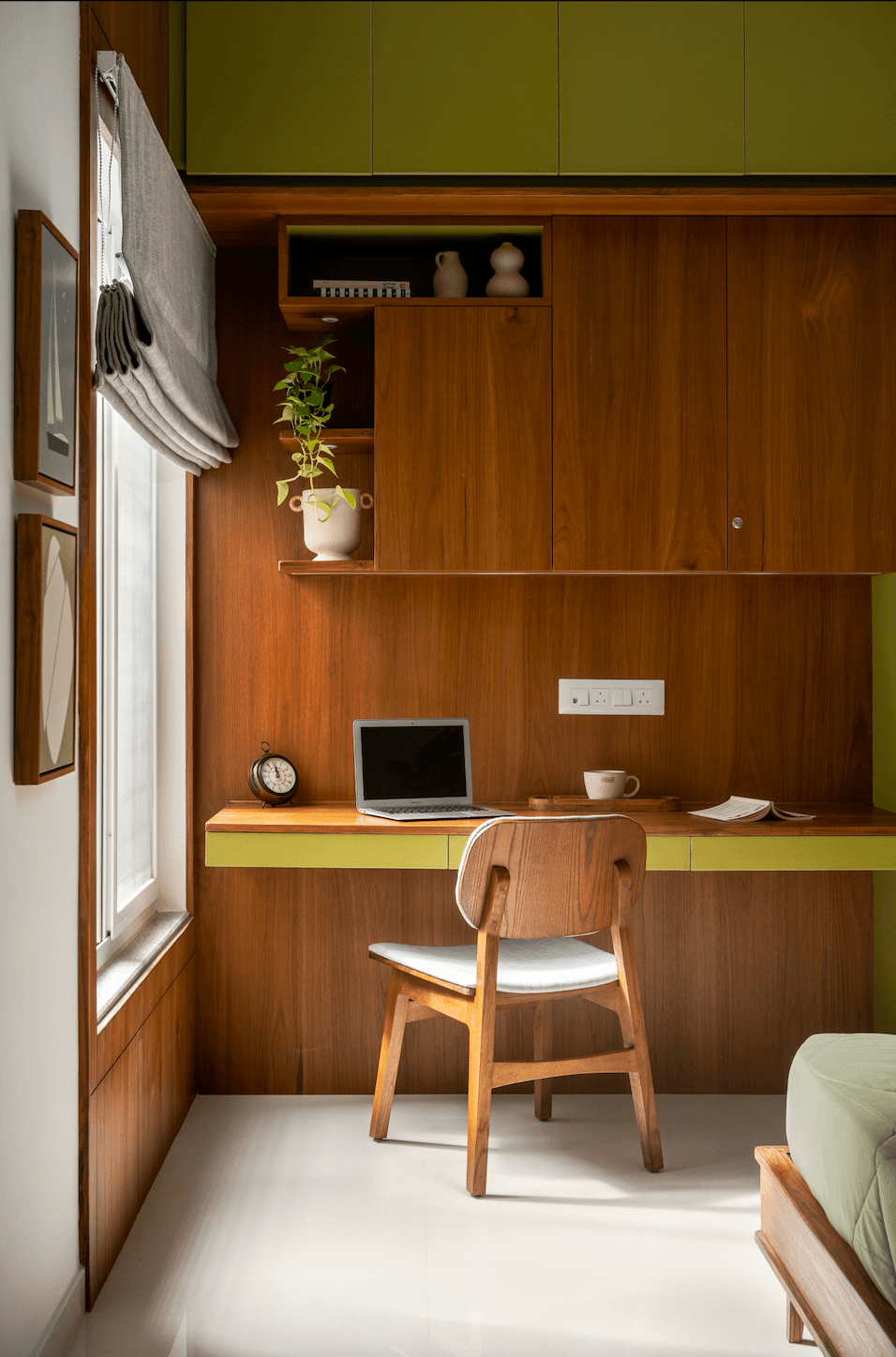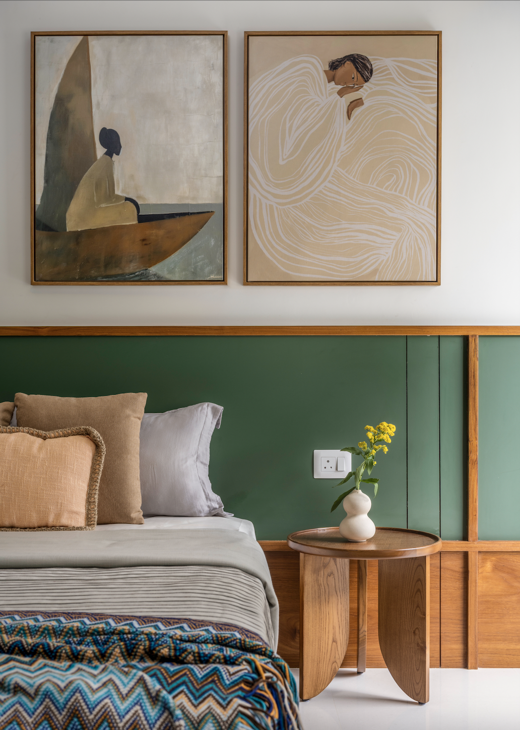 Private spaces extend this narrative while adopting distinct emotional tones. In the primary bedroom, blue emerges not as a decorative gesture but as an atmospheric device – a calm, enveloping backdrop that amplifies daylight and enhances the natural warmth of wood. The girls’ bedroom shifts toward a deeper, more playful intimacy, where forest green surfaces cultivate a cocoon-like quality. A thoughtfully integrated window seat becomes both functional and experiential, transforming light into a spatial feature. Across rooms, curves, textures, and tonal layering prevent minimalism from feeling austere, ensuring each space remains visually composed yet deeply inviting.