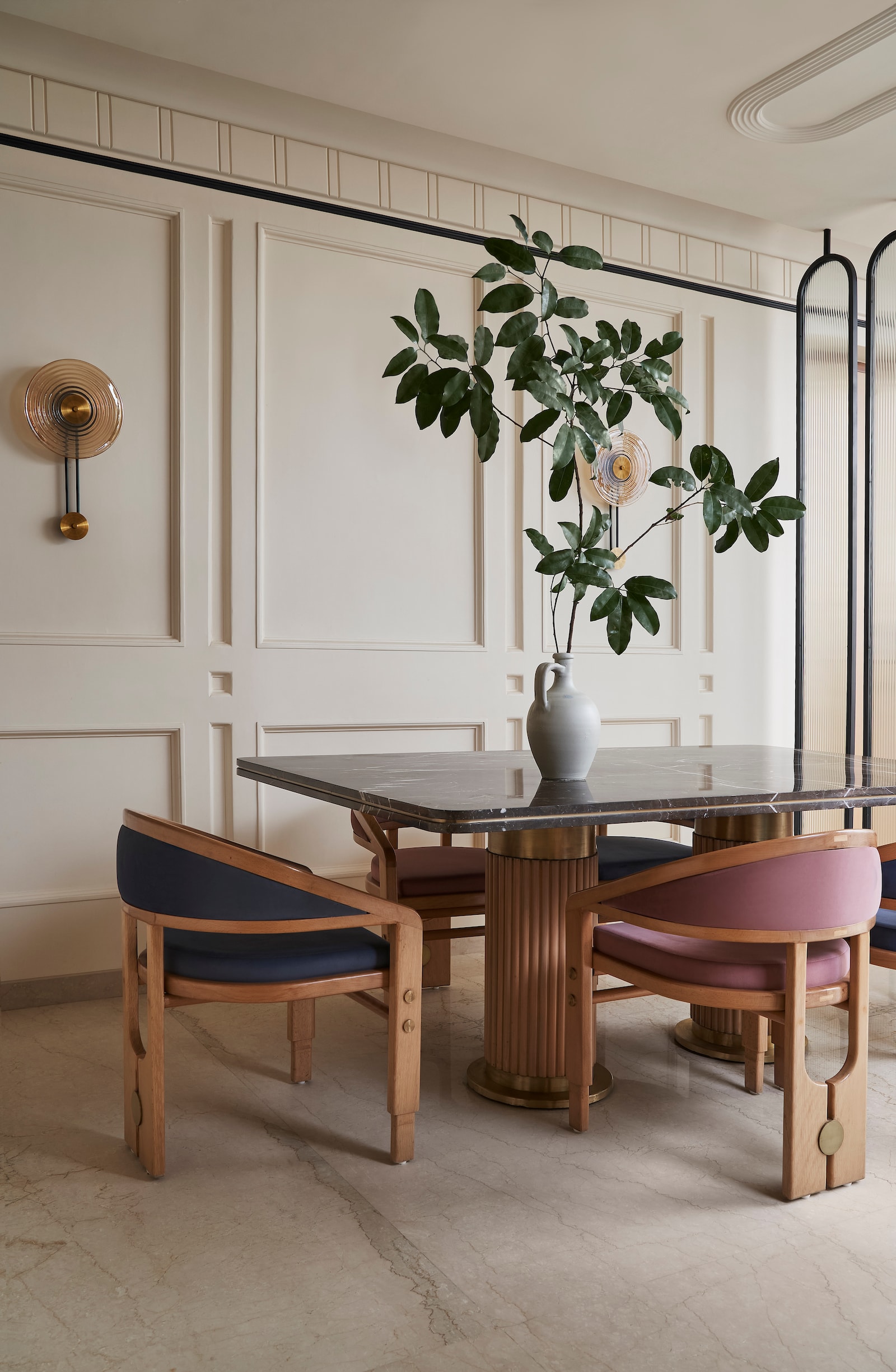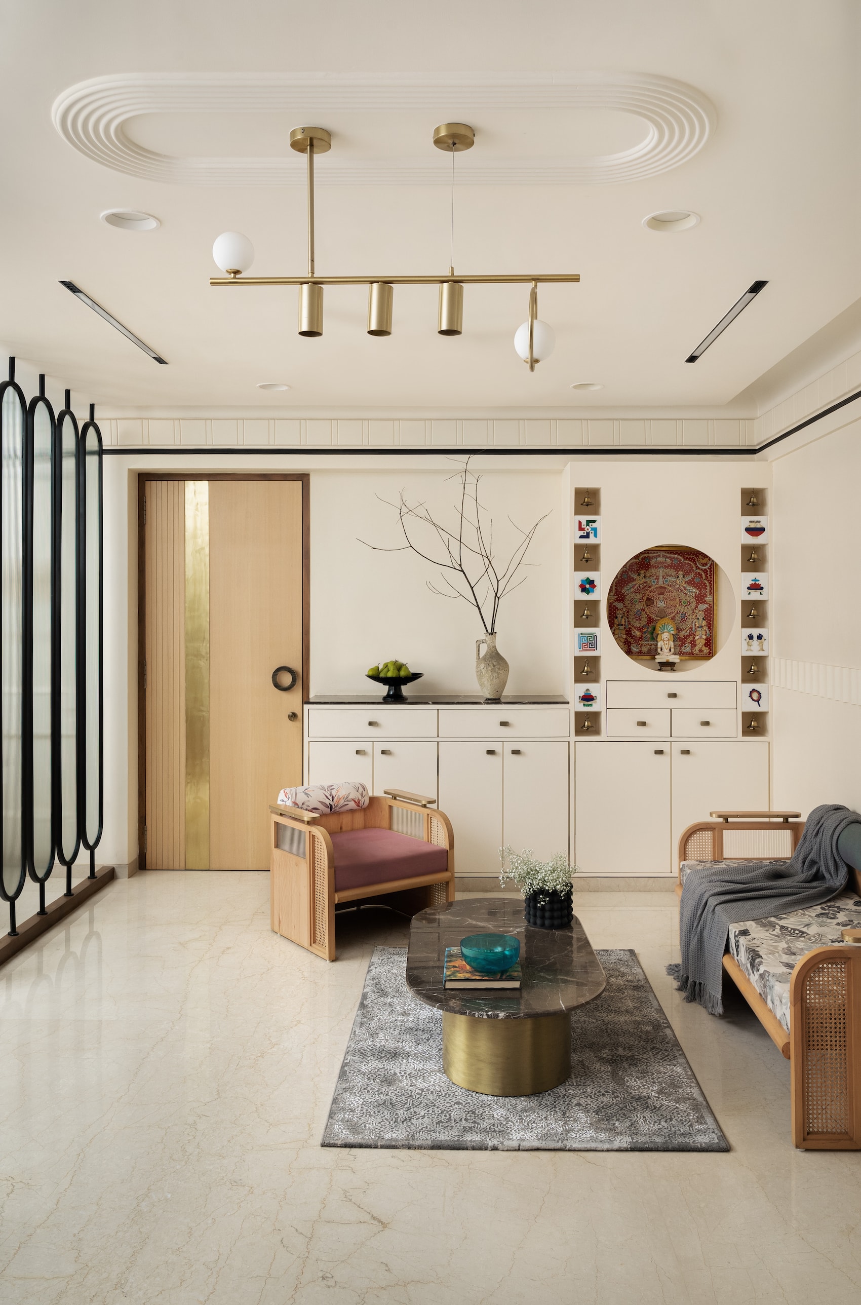Bestowing a luxurious feel, the entrance features a grey marble-clad wall with a safety door adorned with geometric designs in circles and curves. Storage cabinets and a backlit name plate embedded in marble elevate the whole appeal. Designed to resemble an ivory canvas, the living room imparts a classical zen look. The elegant application of beige on the walls paired with oak wood furniture creates a calming atmosphere. A capsule fluted glass partition separates the dining area. Respecting the client’s Jain belief system, a mandir with ashthamangal on both sides with bells in alternate squares is incorporated. With meticulous attention to furniture details and material experimentation, the sofa, lounger chair, and centre table in the formal living area are designed by Soch Design Studio. A floor-standing swing and oak wood sofa bring functionality and style to the informal living room.