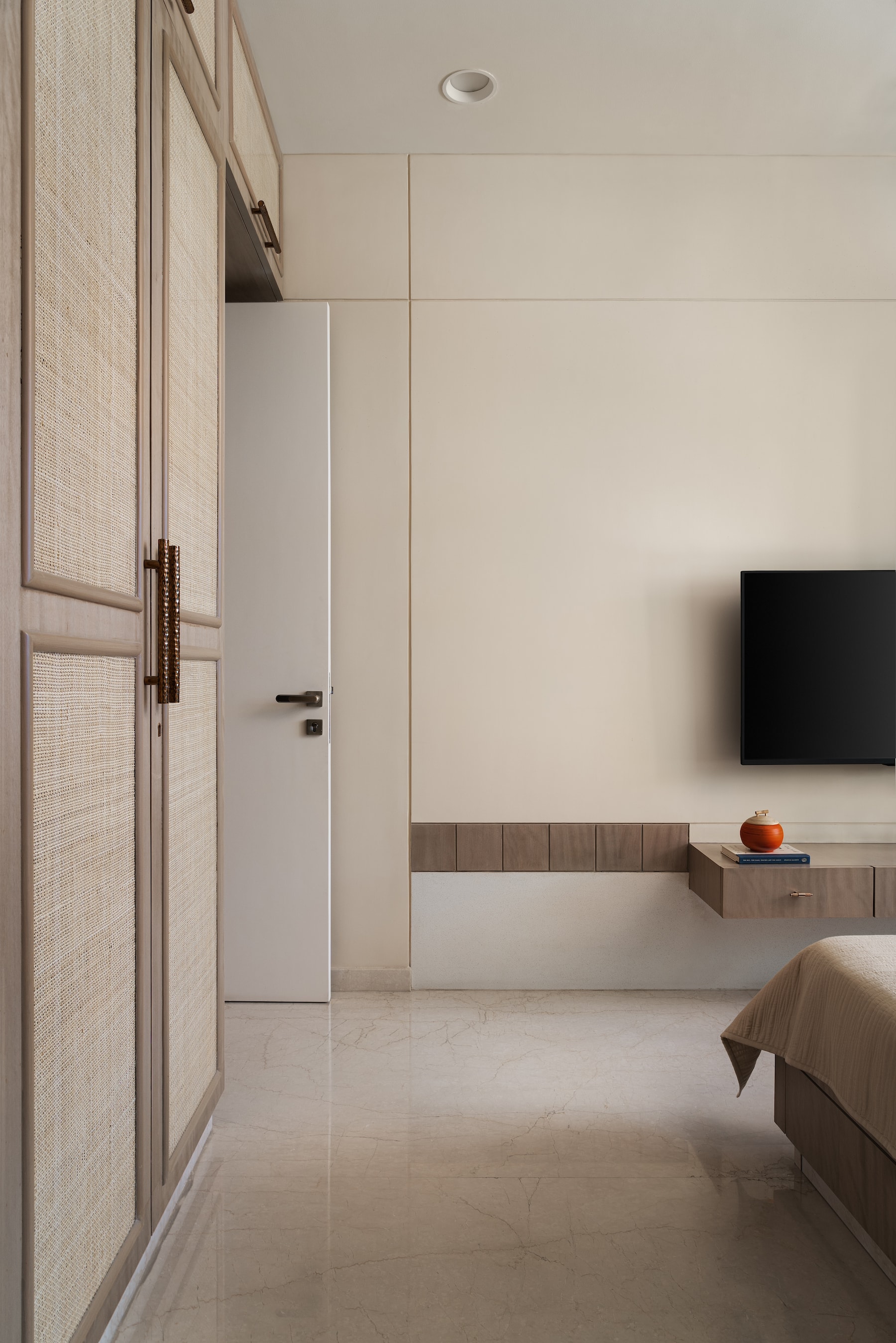 To create a calm and composed atmosphere for the elderly couple, the room is designed with a zen approach. Rectangular offset geometric design, finished with stucco texture paint in beige on the backdrop of the bed achieves a monochrome appearance. The wardrobe is crafted using ash grey veneer and cane material for a natural look.