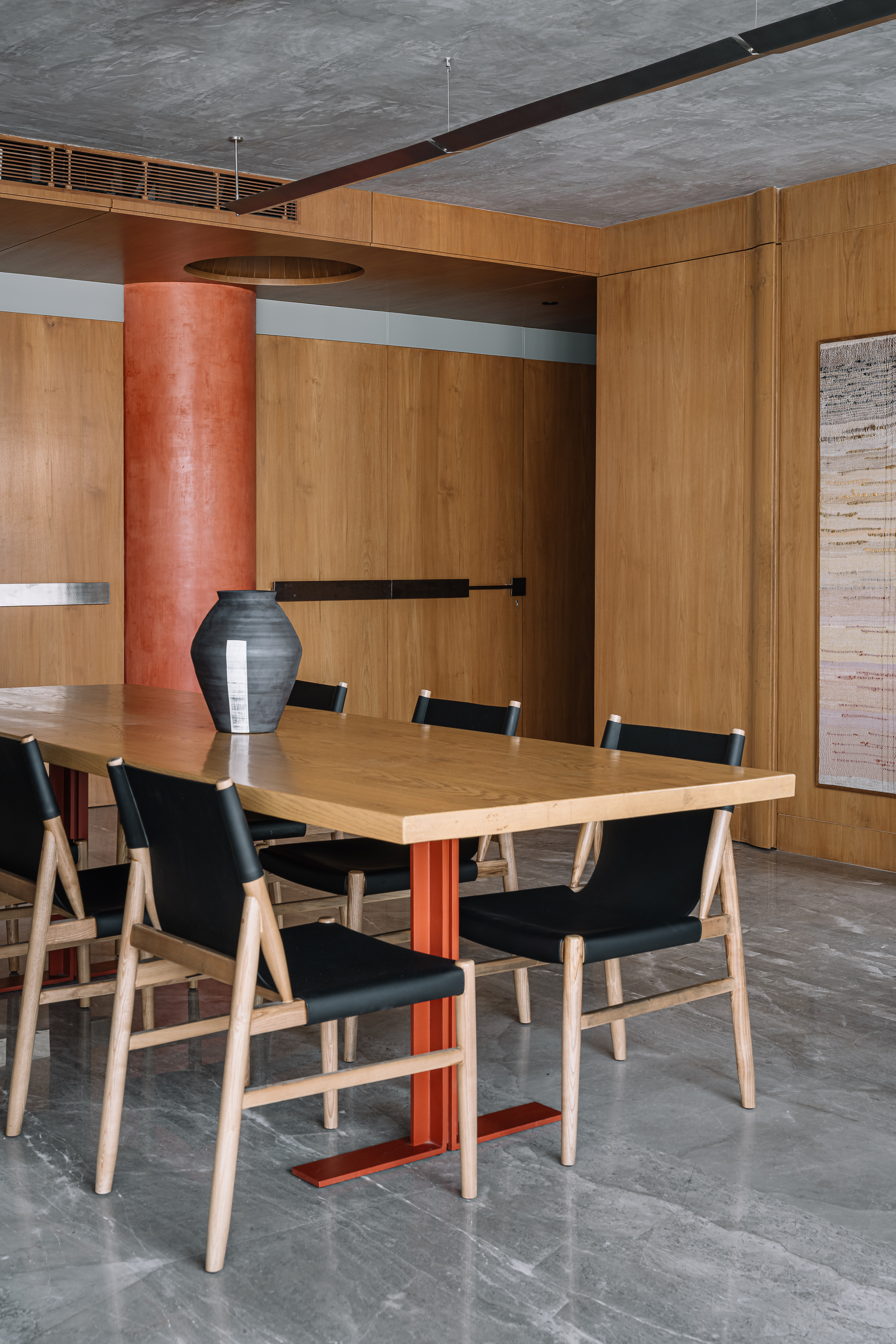 The living room is kept clean, minimal, and uncluttered. Simple furniture, including upholstered seating, stainless steel side tables and a solid wood coffee table, anchors the room with a balanced material composition. Pops of terracotta red colour are introduced strategically, to draw emphasis on geometric composition and bespoke elements. The open layout lends itself effortlessly to both daily living and hosting larger gatherings.