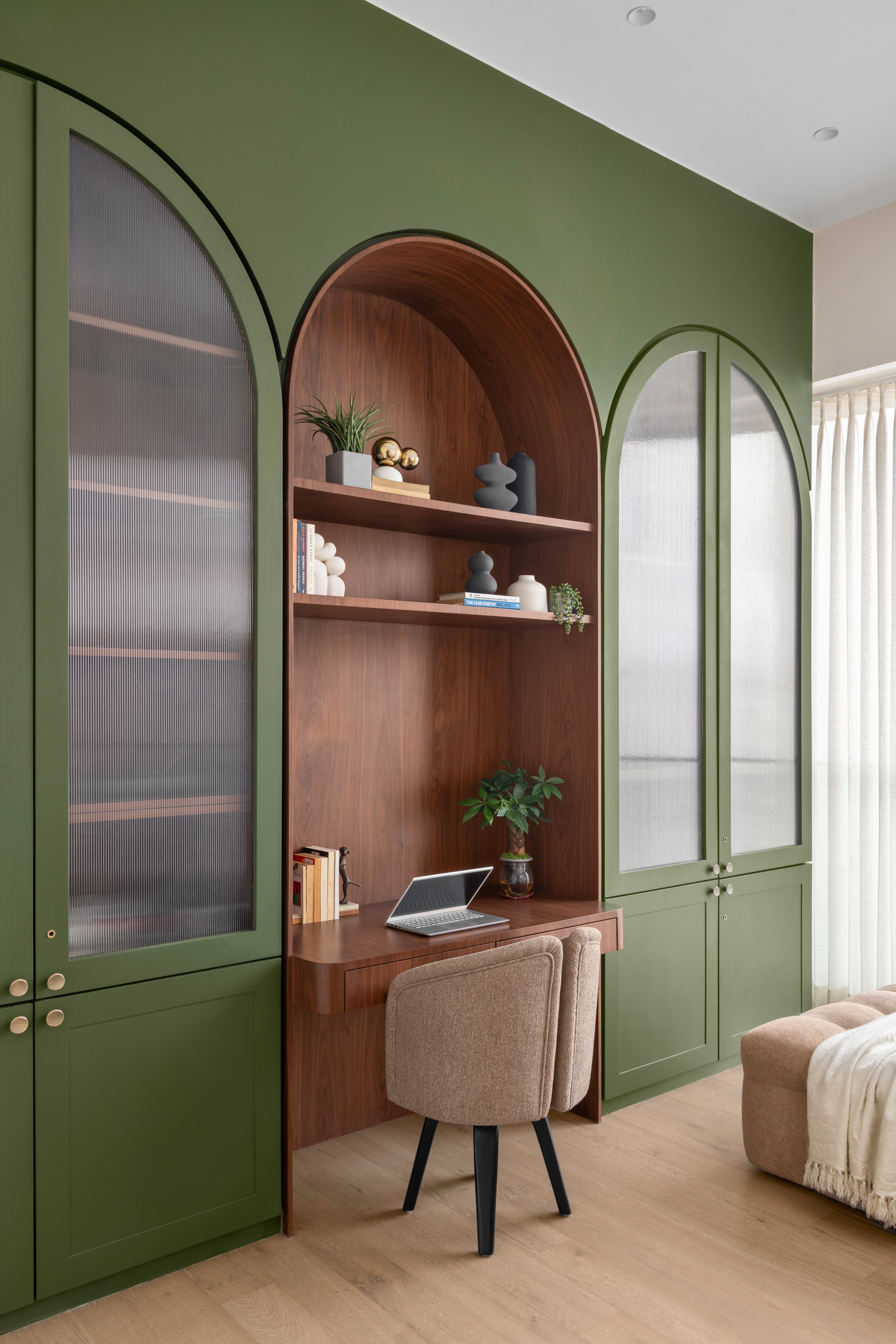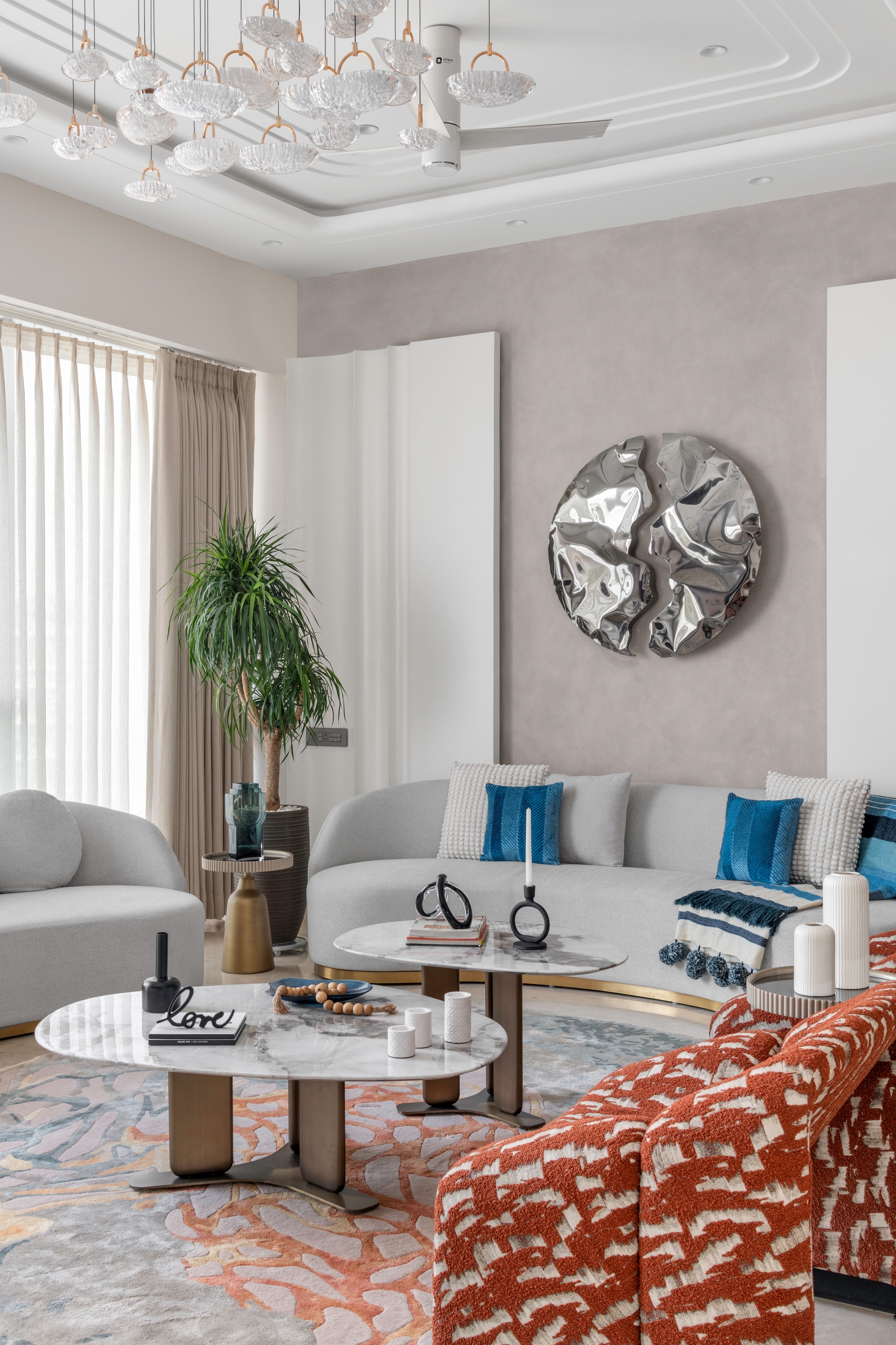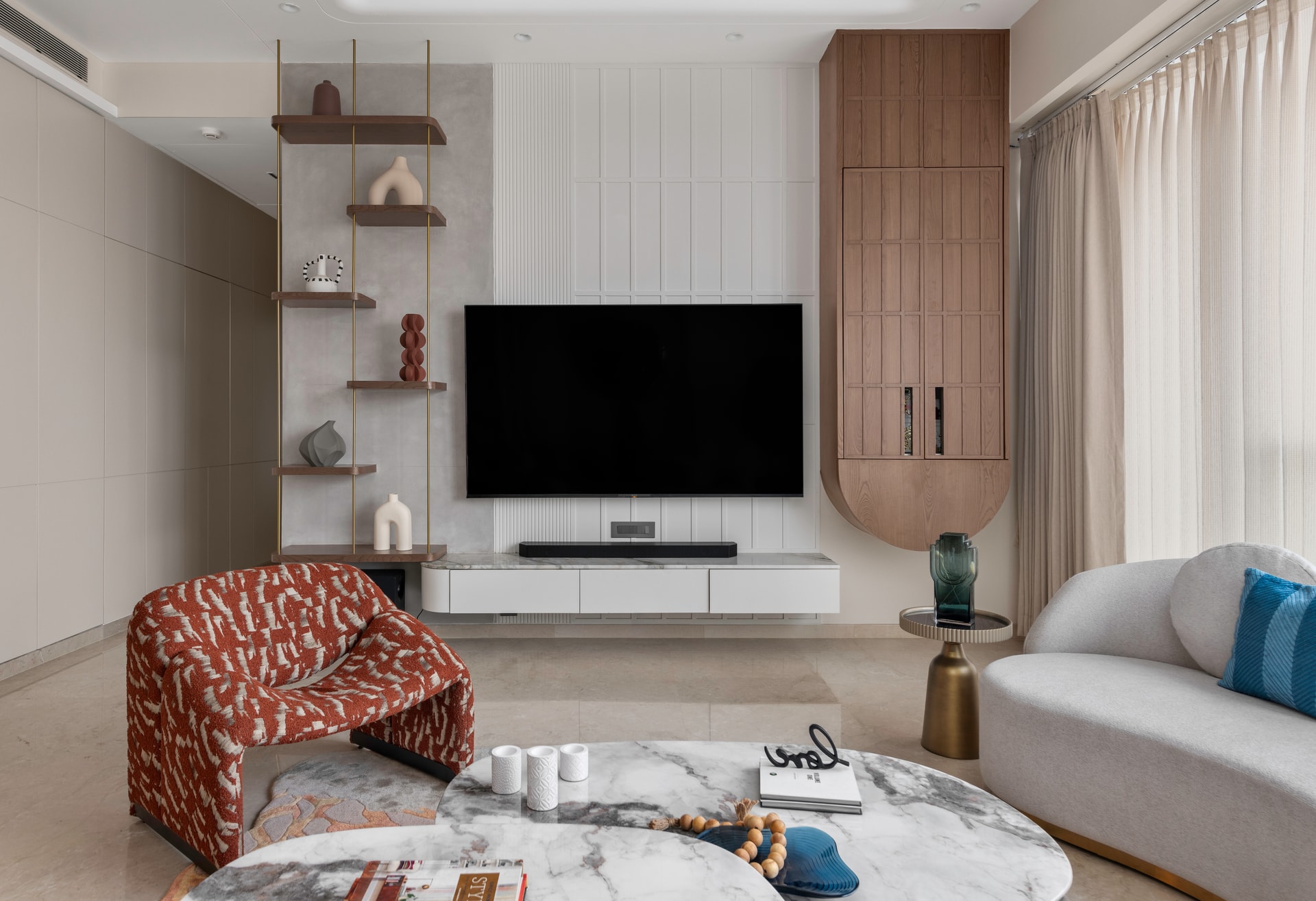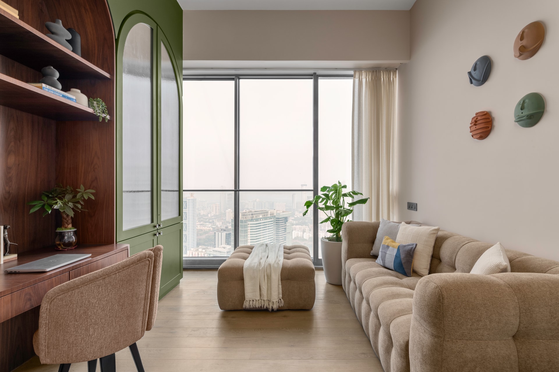 The apartment’s soaring 12-foot ceilings, a rare luxury in Mumbai, are treated with quiet restraint. The pastel-toned envelope amplifies daylight, creating a dialogue between the city’s hazy horizon and the calm interior. Subtlety becomes a stage for surprise. In the living room, a textured wall with an earthy finish meets crisp white panels to form a serene backdrop for a sculptural artwork by Nitush Aroosh. Curvilinear furniture pieces seem to sway with the breeze outside, while bursts of saturated hues, a graphic rug here, a vibrant armchair there, animate the otherwise mellow palette.