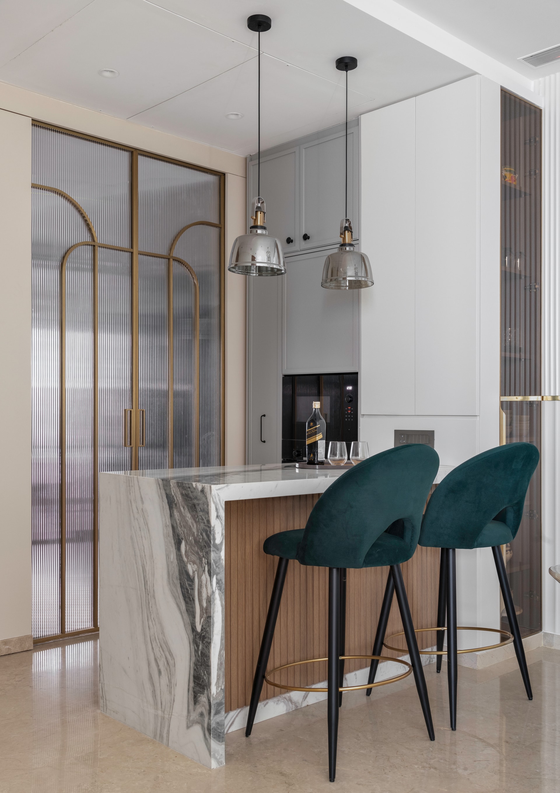 Just beyond, the kitchen introduces a playful counterpoint. The breakfast counter, dressed in exotic Amazon Green marble, conceals a bold surprise: rust-red cabinetry paired with white Caesarstone countertops and patterned Spanish tiles. The automated frosted glass panel, framed in brass, ensures the space transitions fluidly between open and private, social and silent.