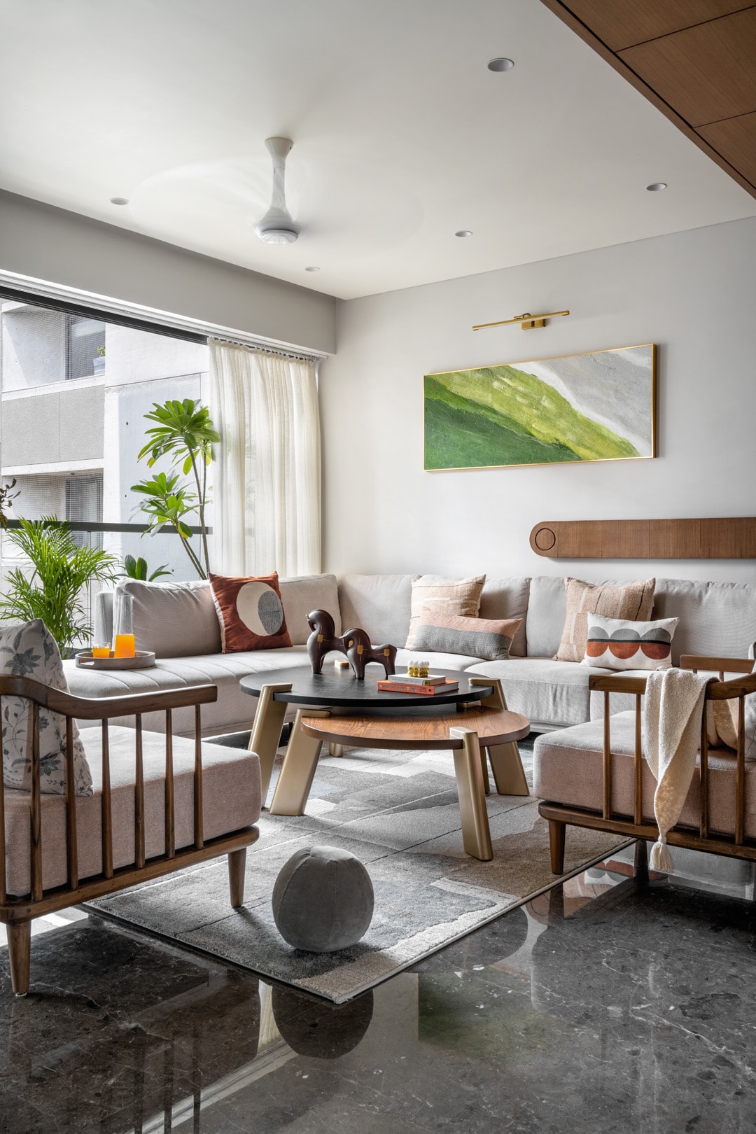 The primary objective was to design a home that exudes the essence of premium living while catering to the varied style preferences and lifestyles of each family member. The challenge was to combine their unique personalities into a cohesive and harmonious space. To achieve this, the design team employed a soothing neutral colour scheme, the warm tones of teak wood, and the rich gleam of brass accents. These elements not only unify the space but also provide a backdrop that allows for the individual tastes of each family member to shine through. Thoughtful personal touches were integrated throughout the home, ensuring that each corner of the apartment tells a story and adds to the overall narrative of elegance and familial harmony.