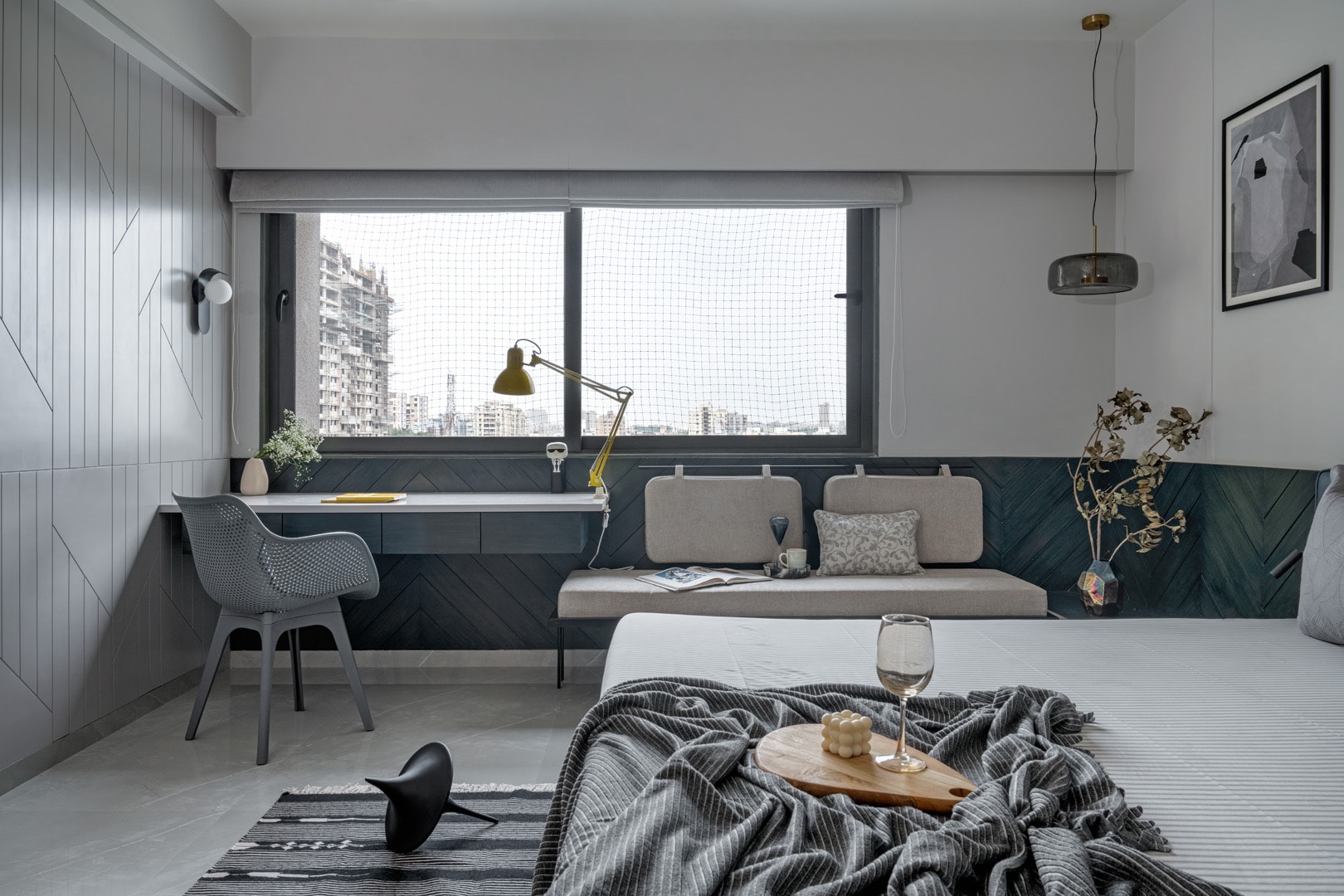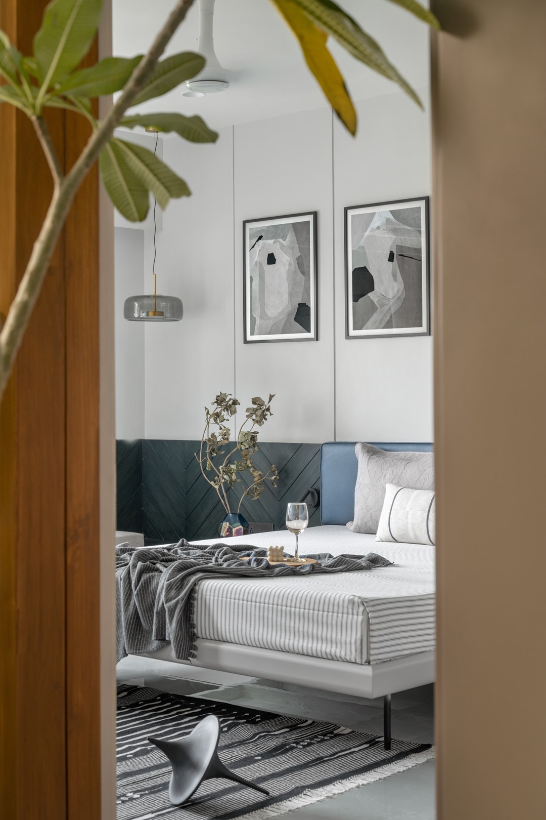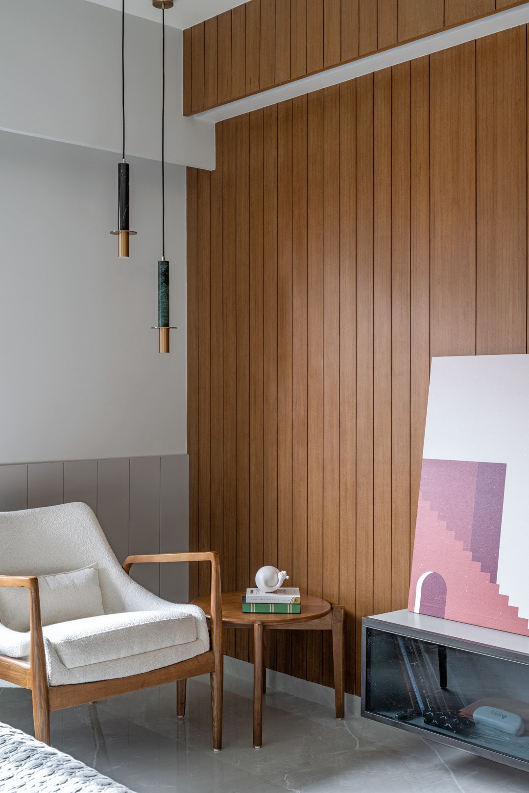 Each bedroom in this home is designed to be a bespoke refuge, echoing the individual personalities of its occupants while maintaining a cohesive design language. The parents’ bedroom exudes simplicity and spaciousness, with soft sage green tones and teak wood forming a soothing palette that promotes relaxation and tranquillity. A cosy reading corner doubles as their favourite spot for evening tea, embodying serenity and offering a quiet retreat from the hustle and bustle of daily life. The Indo-modern style of the room is exemplified by traditional miniature artworks, paying homage to the family’s heritage and adding a touch of cultural richness to the space.
