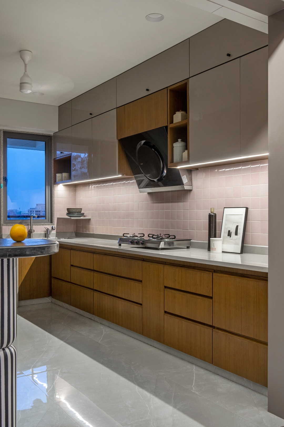 The kitchen, designed to be both flexible and adaptable, features a unique moving wall that can be opened to connect the kitchen to the living and dining spaces via a small breakfast counter. This innovative design element transforms into a custom-designed panelling when closed, serving as a cohesive backdrop that unites all three spaces along with the teak wood ceiling. This ensures that the visual flow of the design remains uninterrupted, whether the sliding door to the kitchen is open or closed.